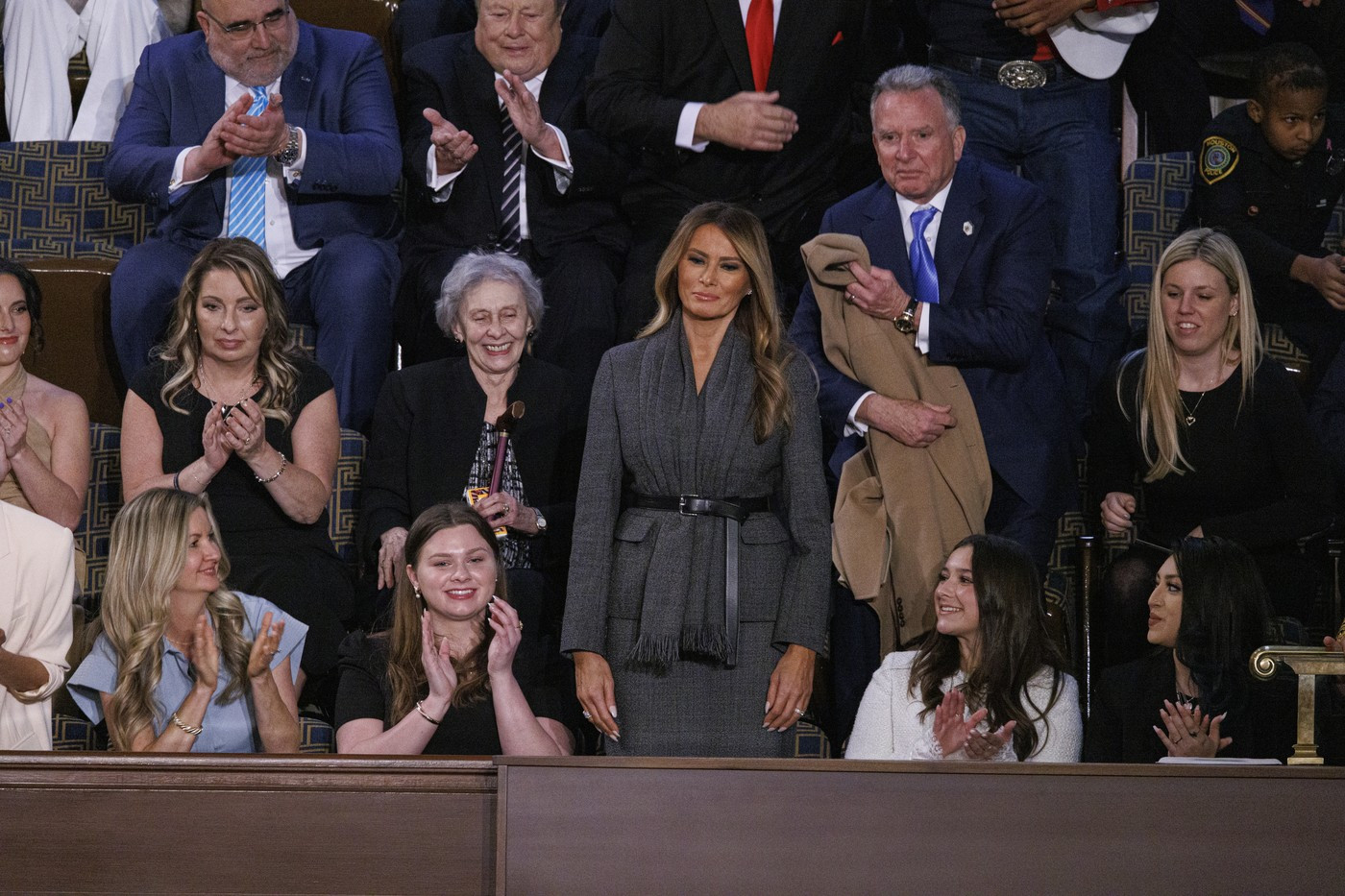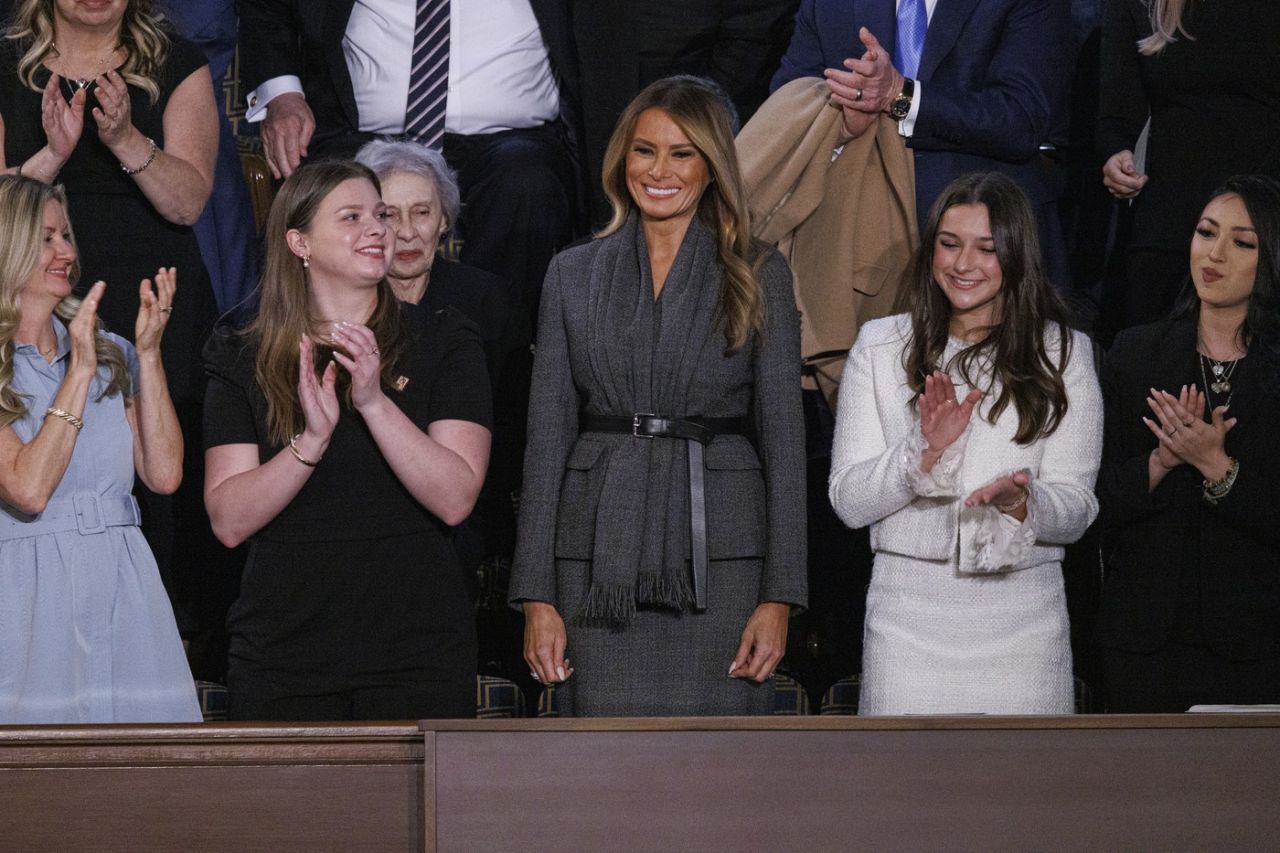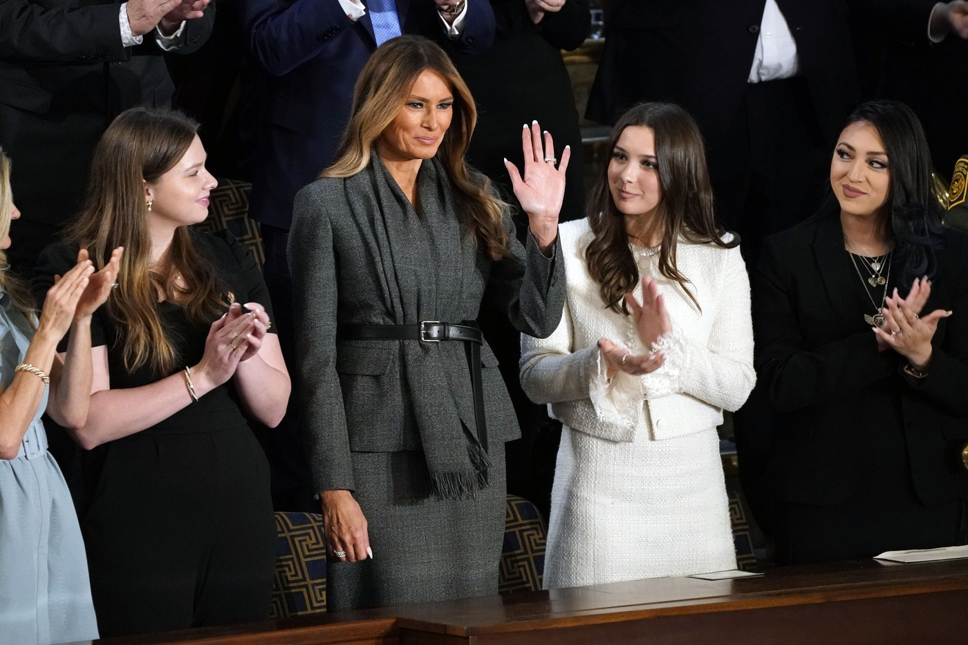 Prima doamnă Melania Trump a participat la discursul președintelui Donald Trump în fața unei sesiuni comune a Congresului, purtând un costum gri din două piese de la Dior.