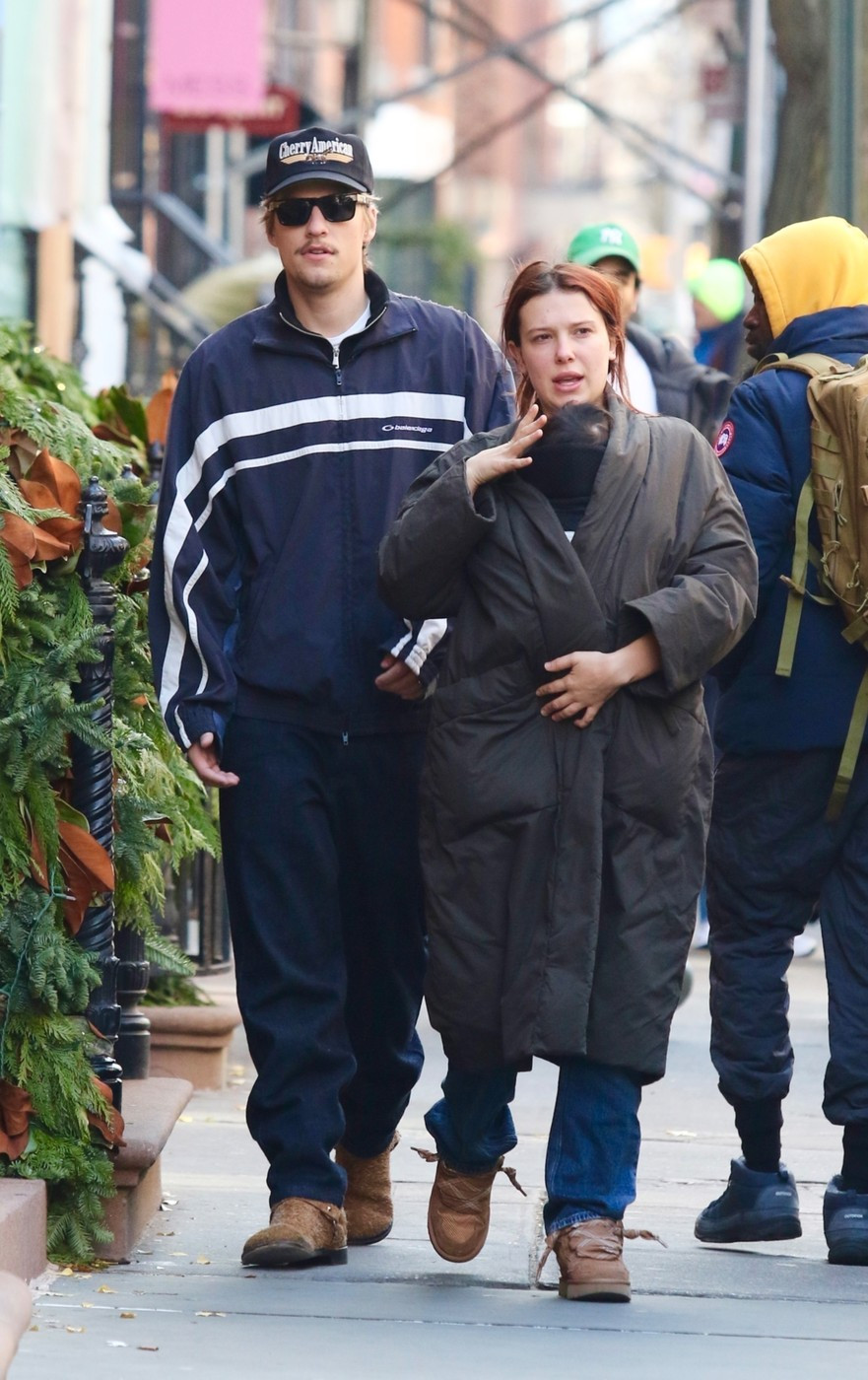Starul din Stranger Things, în vârstă de 21 de ani, era îmbrăcată gros, purtând o geacă oversized, în timp ce își ținea cu grijă fiica la piept într-un marsupiu ascuns sub haină. Bongiovi, 23 de ani, a mers aproape de ea, zâmbind larg în timp ce se plimbau ținându-se de mână, oprindu-se la un moment dat pentru a împărtăși o îmbrățișare tandră.