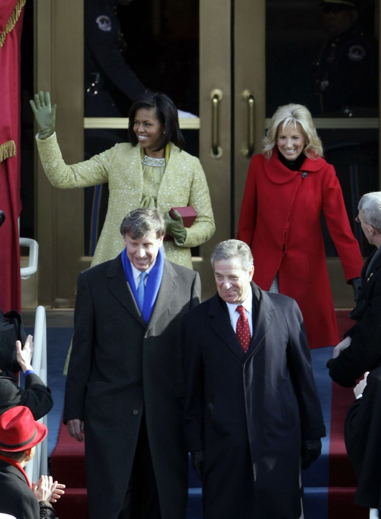 Palton a purtat si sotia vicepresedintelui Joe Bidden. Jill a ales o haina mare si calduroasa, rosie, si a avut incaltari negre de piele.