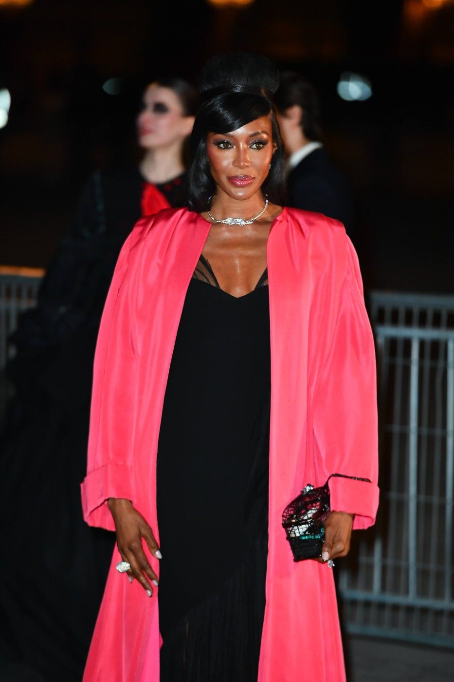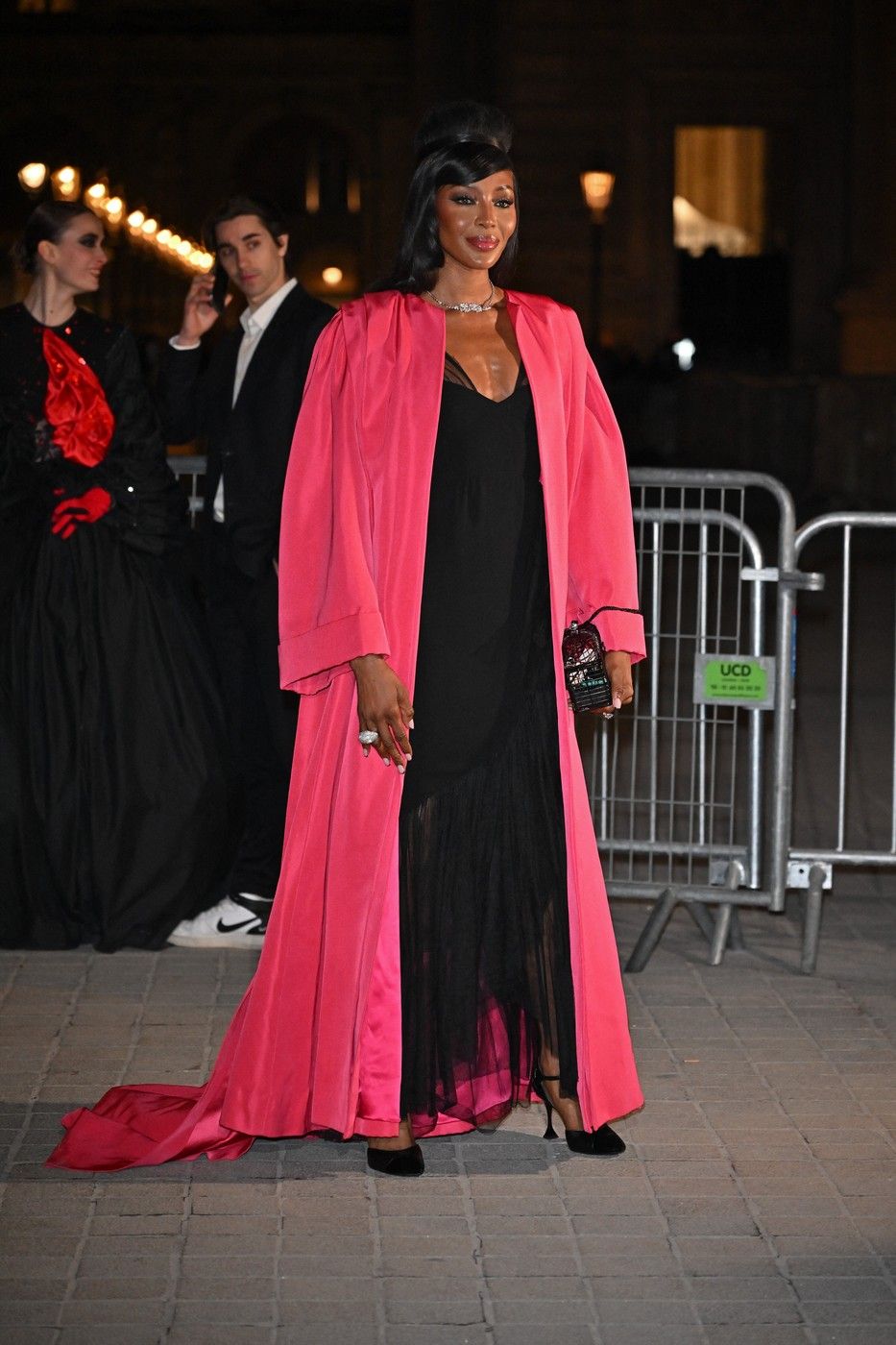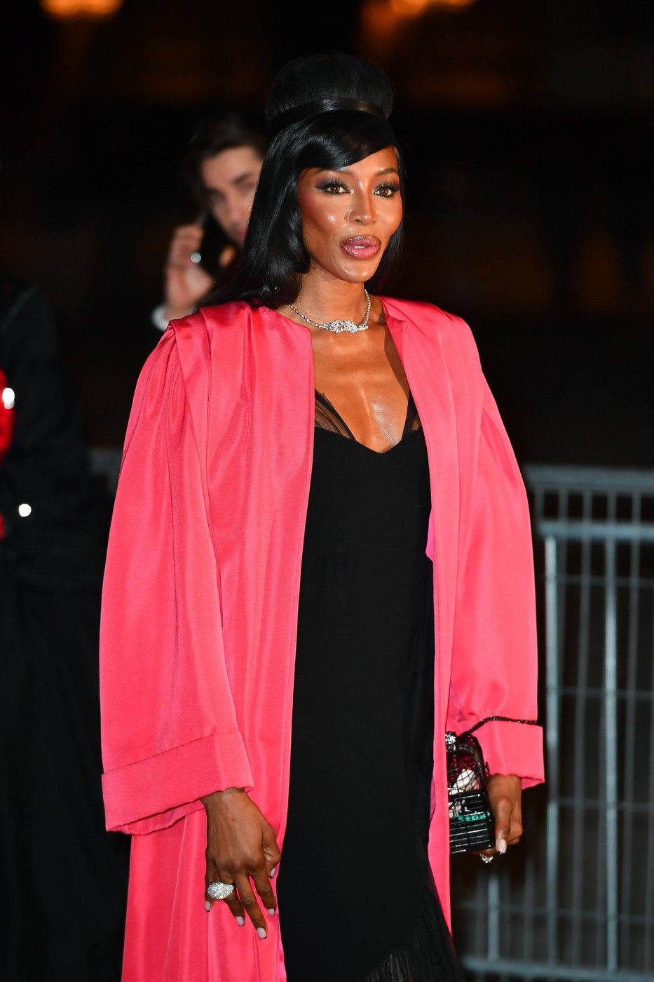 Naomi Campbell a purtat o robă roz din tafta, peste o rochie neagră, cu decolteu adânc și inserții din dantelă.