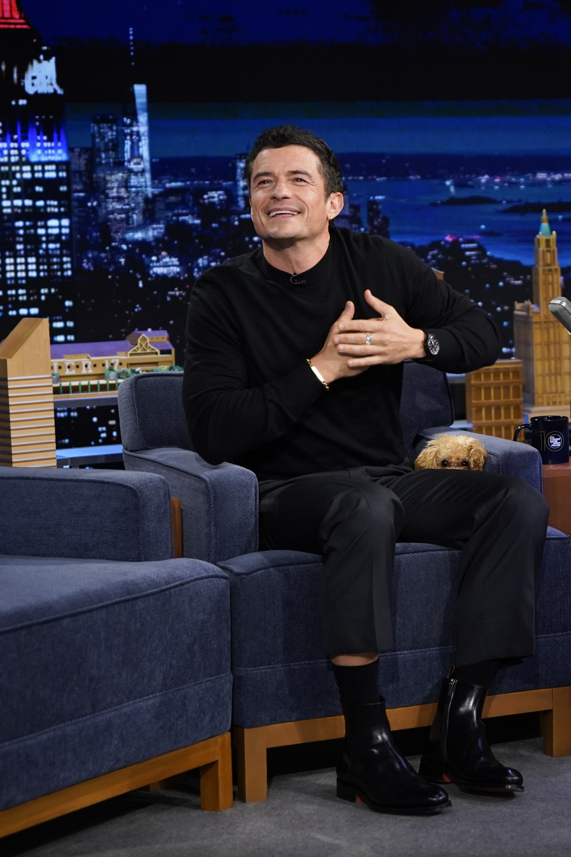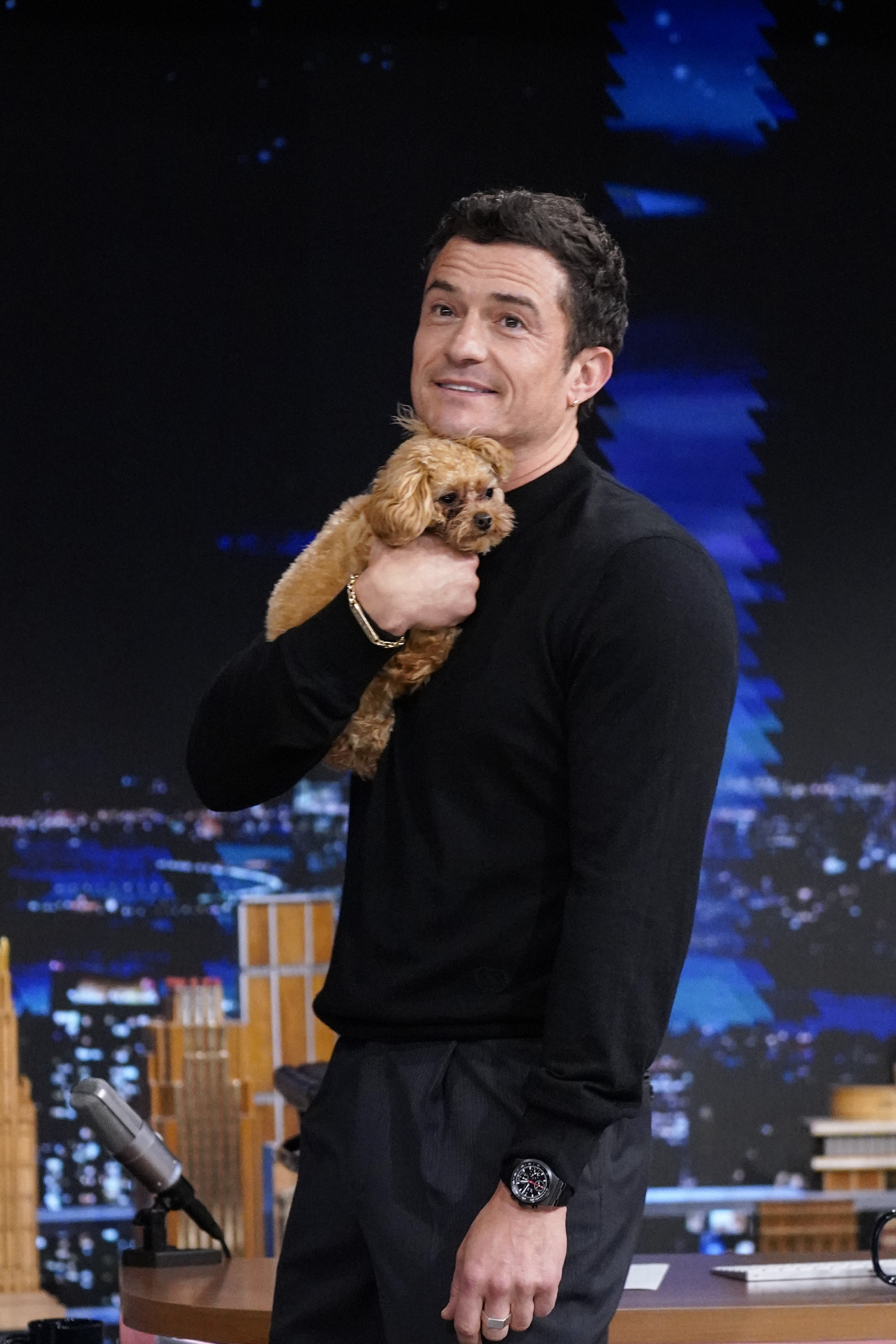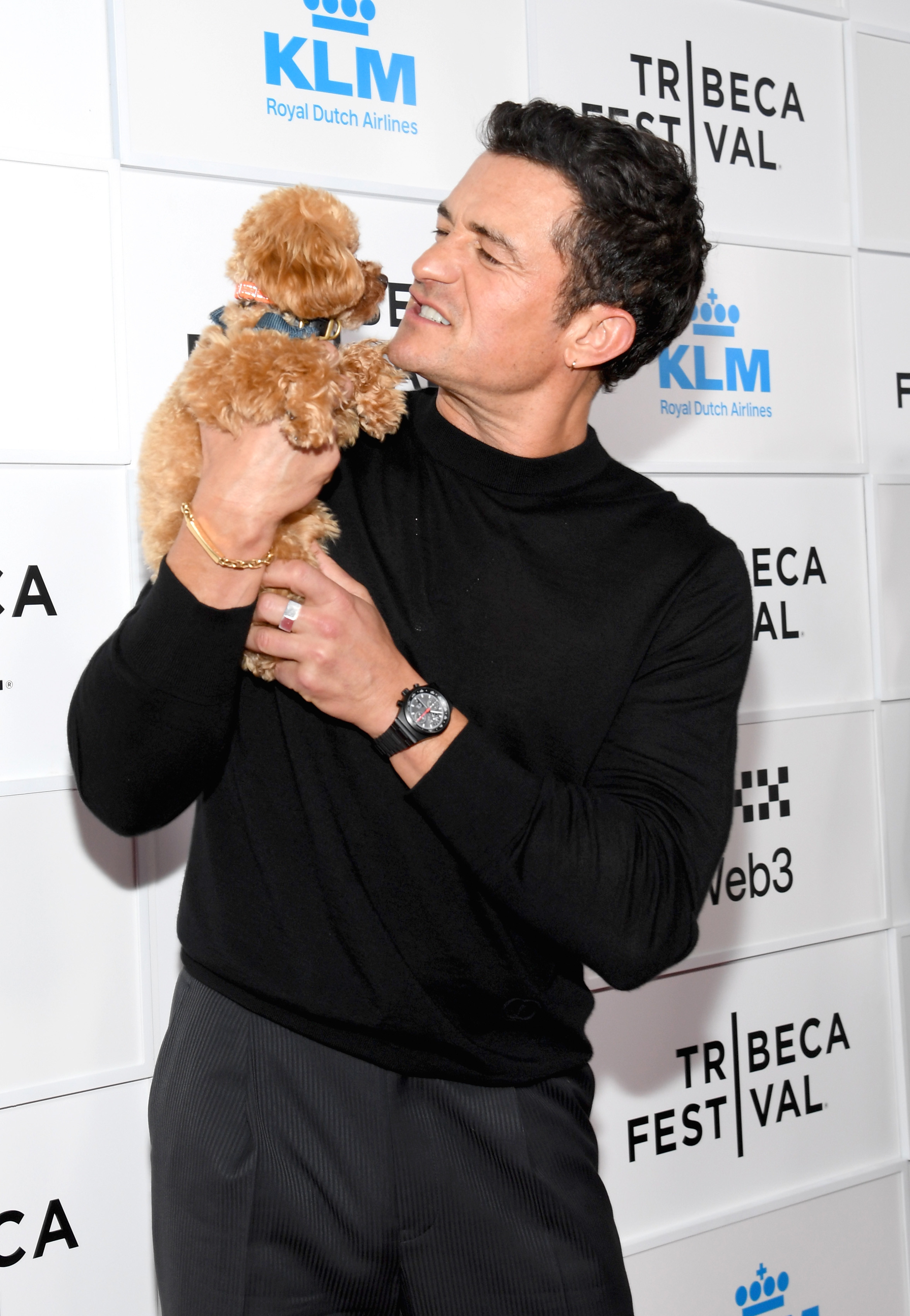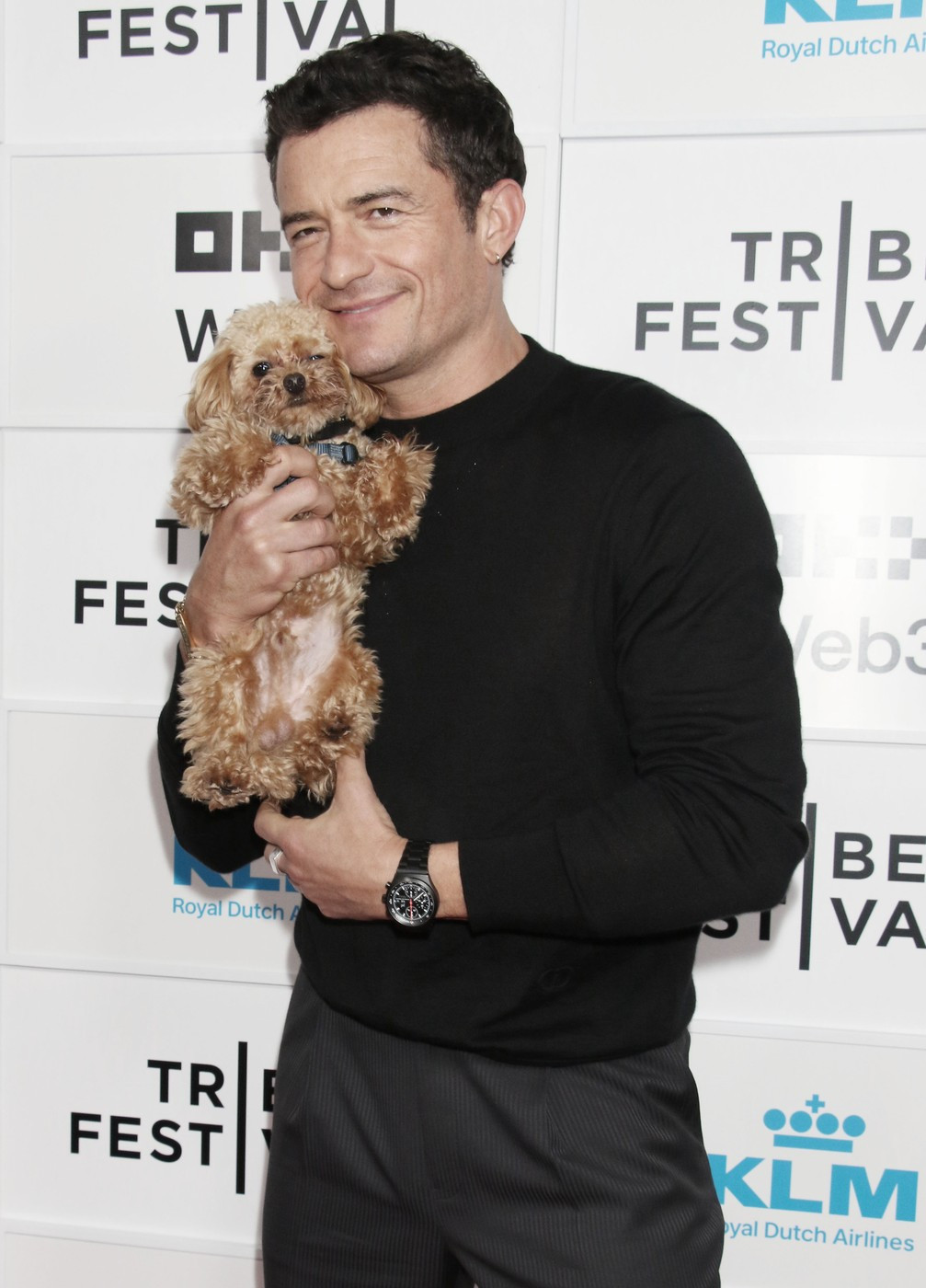 Bloom a dezvăluit că animăluțul său de companie are de doar 10 luni. „Mi s-a spus că am nevoie de un câine care să fie aproape inexistent,” a explicat el, făcând un gest către Biggie Smalls. „Călătoresc foarte mult, dar îmi plac câinii.”