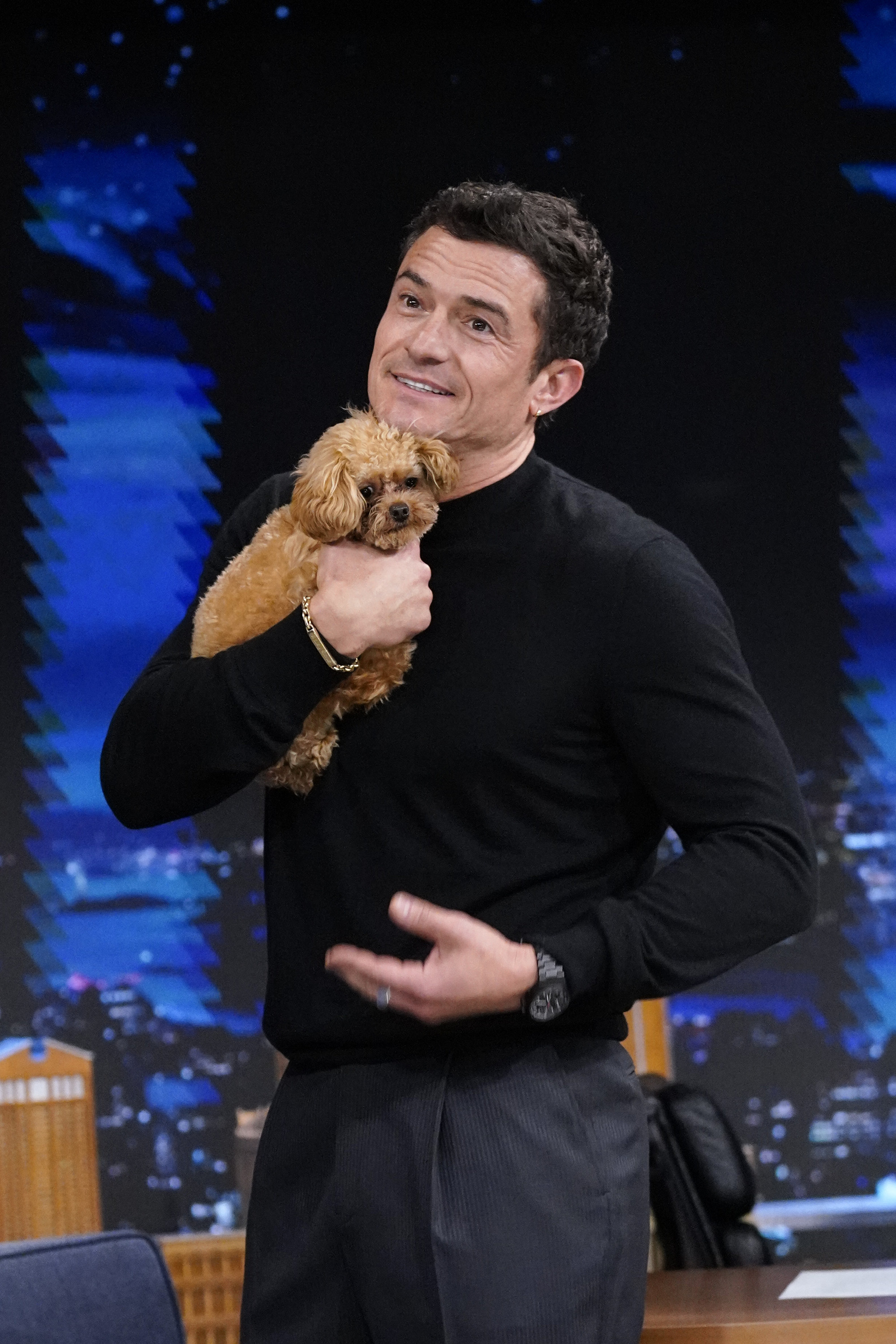 „Caută atenție,” a glumit Bloom în emisiune. „El nu ar lătra niciodată, doar că, evident, se gândește: „Stai, tata e acolo?’”