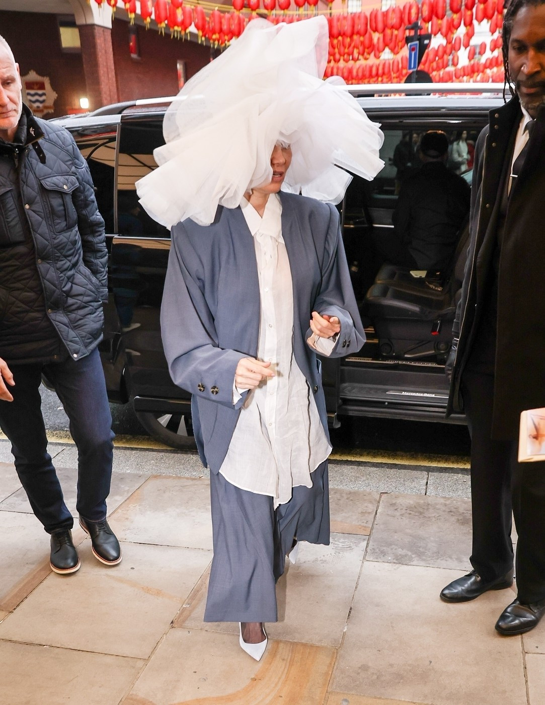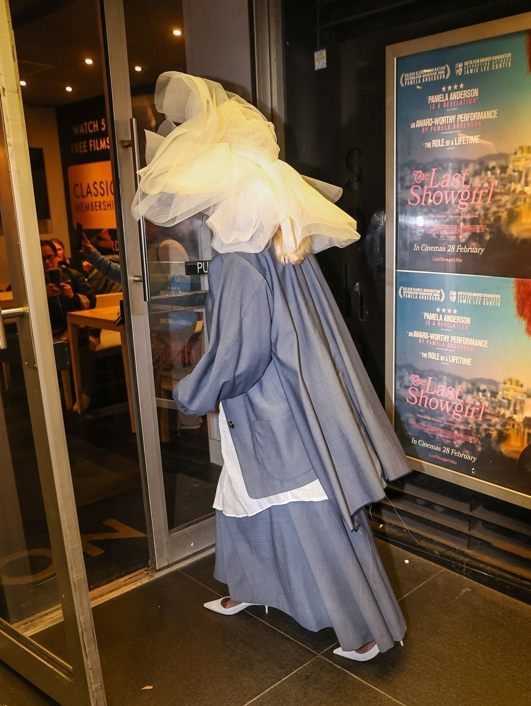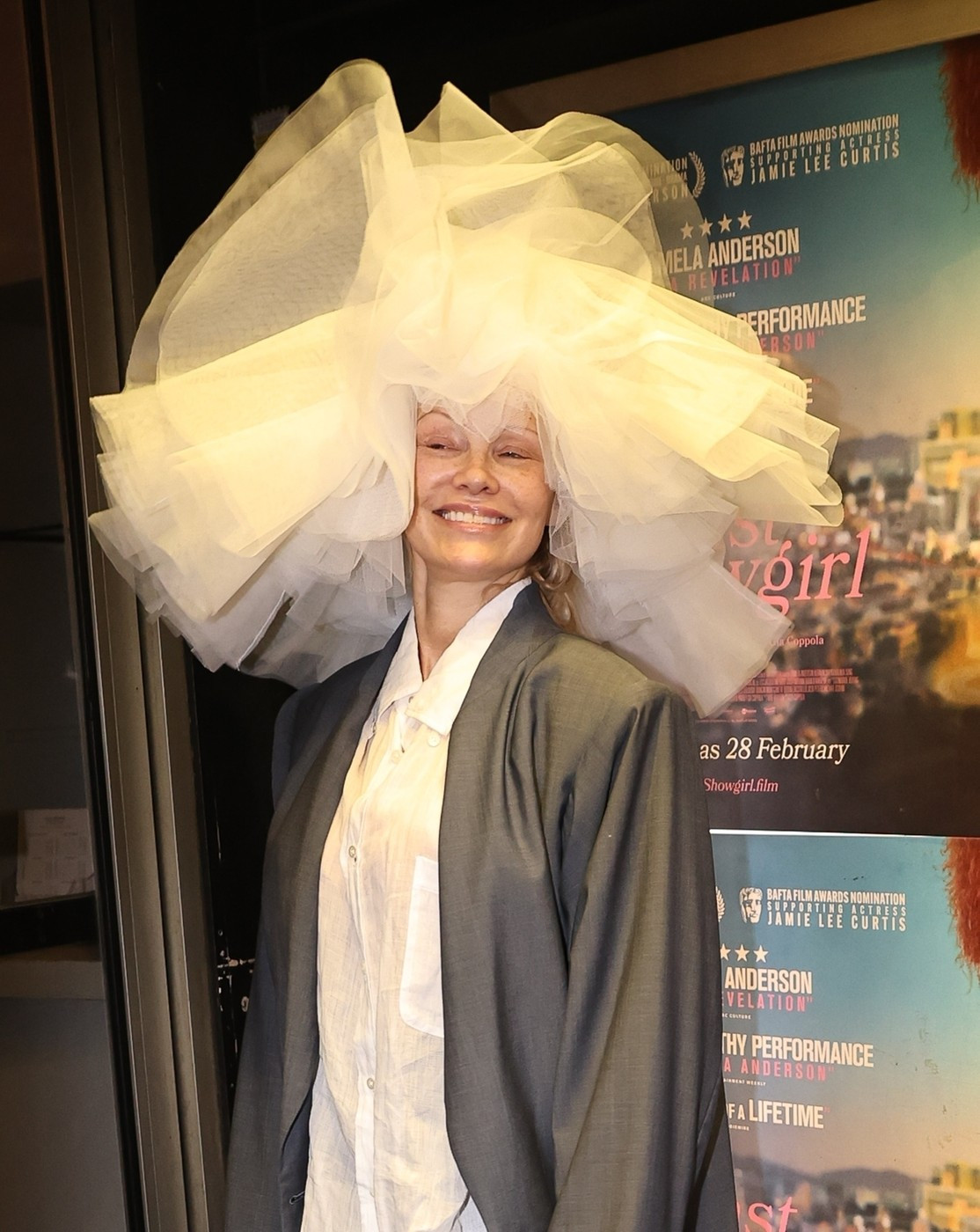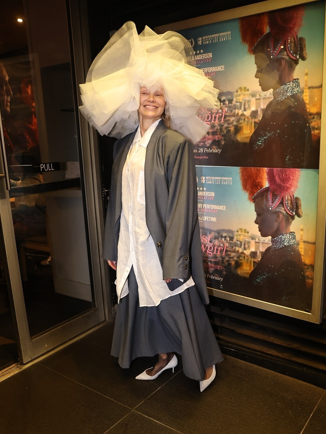 Ajunsă la cinematograful Curzon din Soho, și-a completat ținuta cu un sacou supradimensionat gri și o fustă cloș asortată.