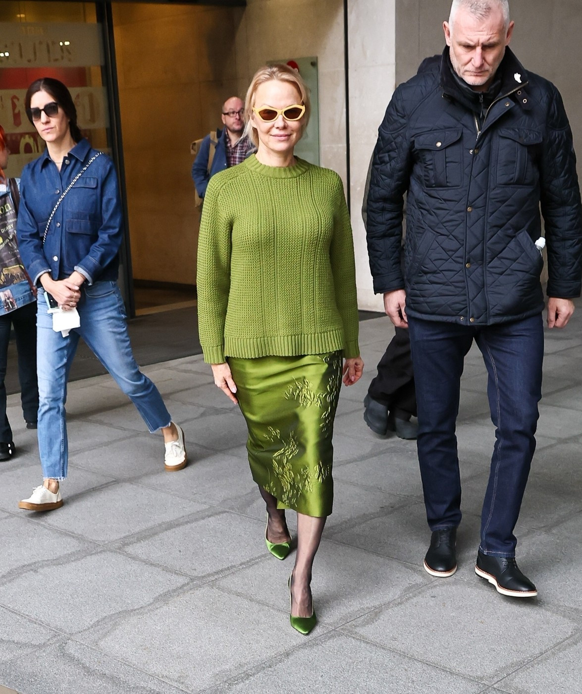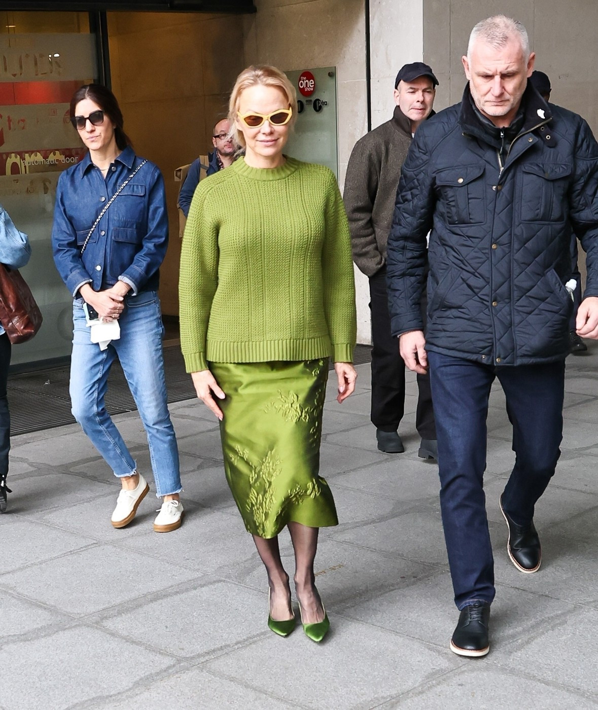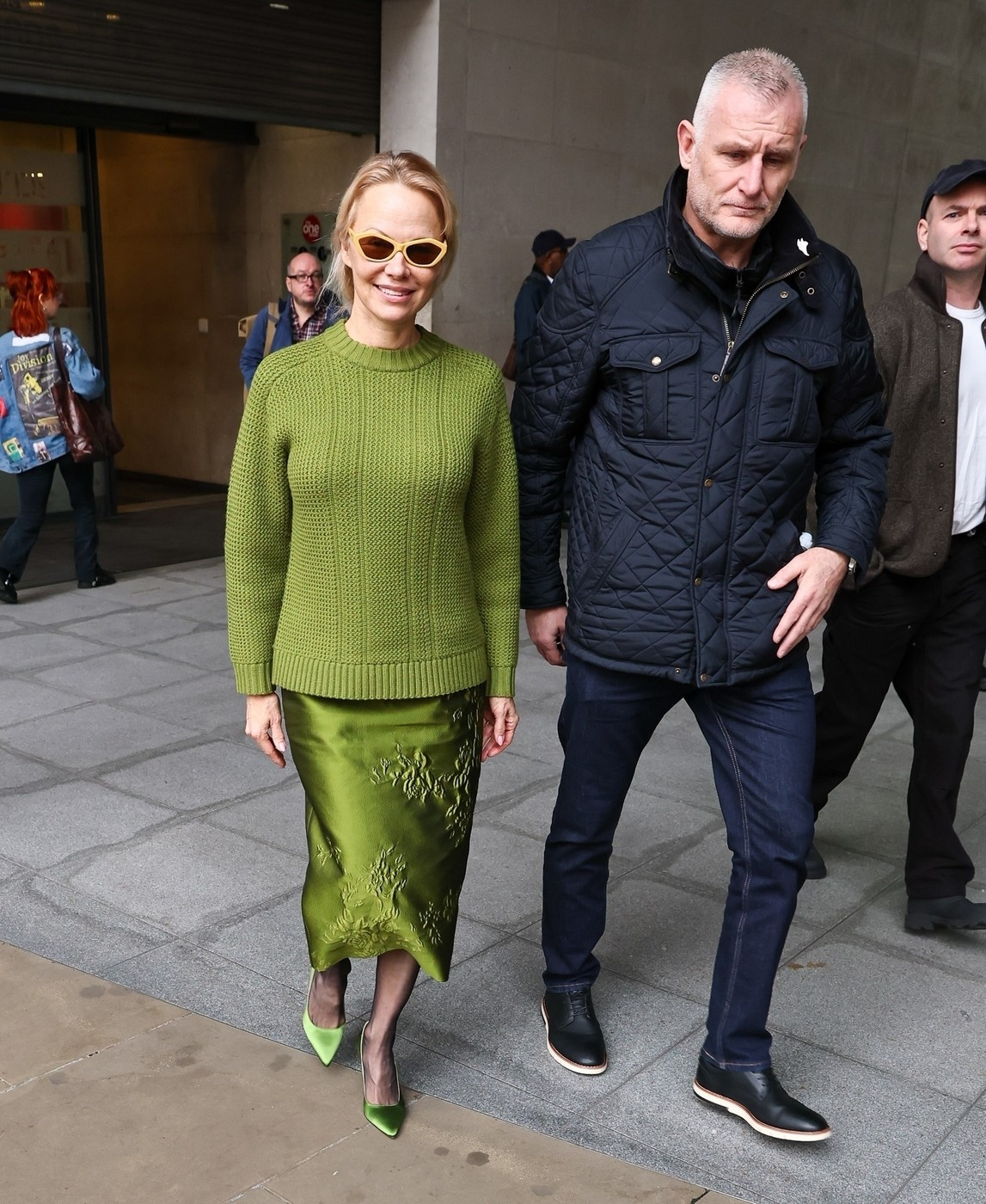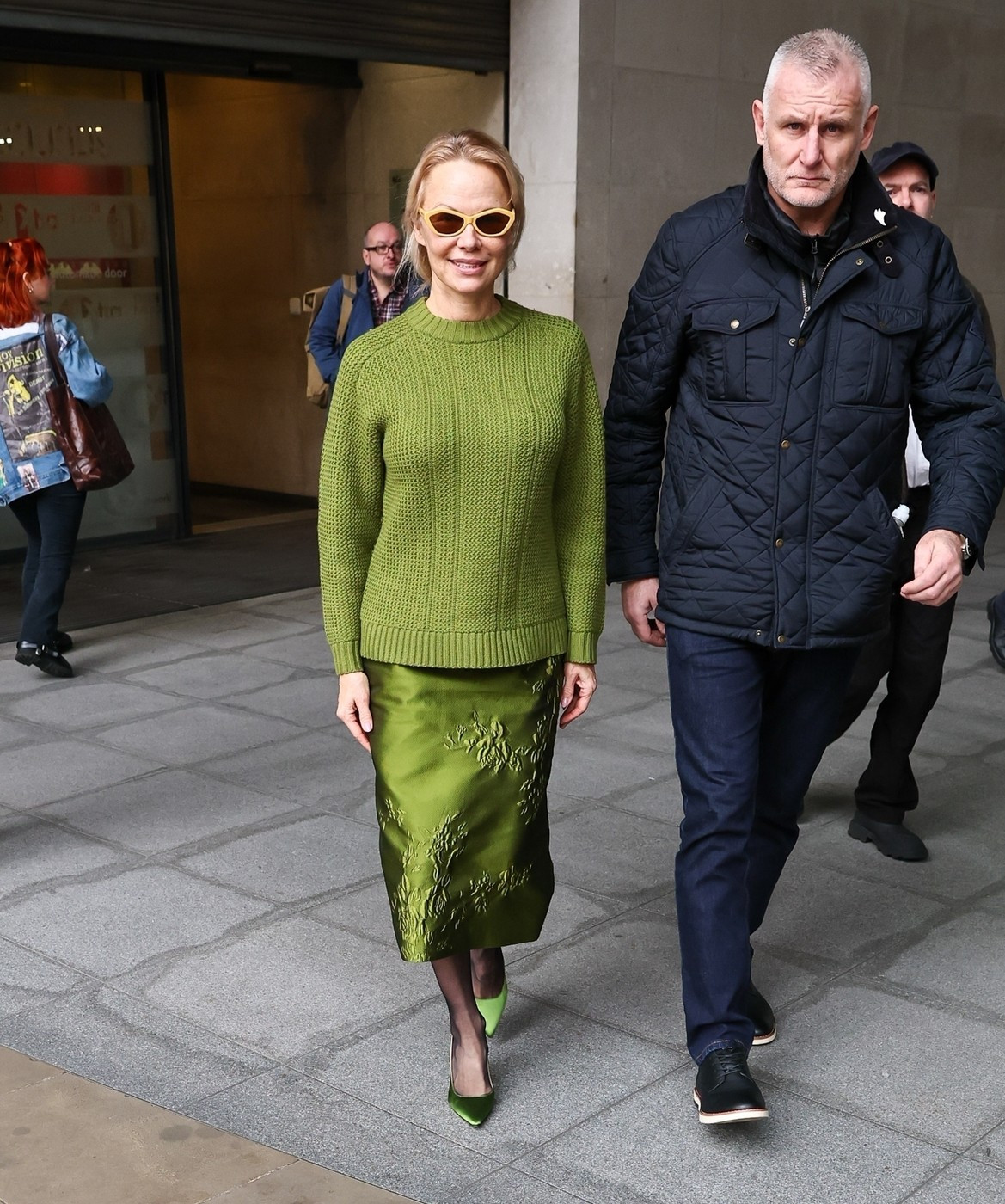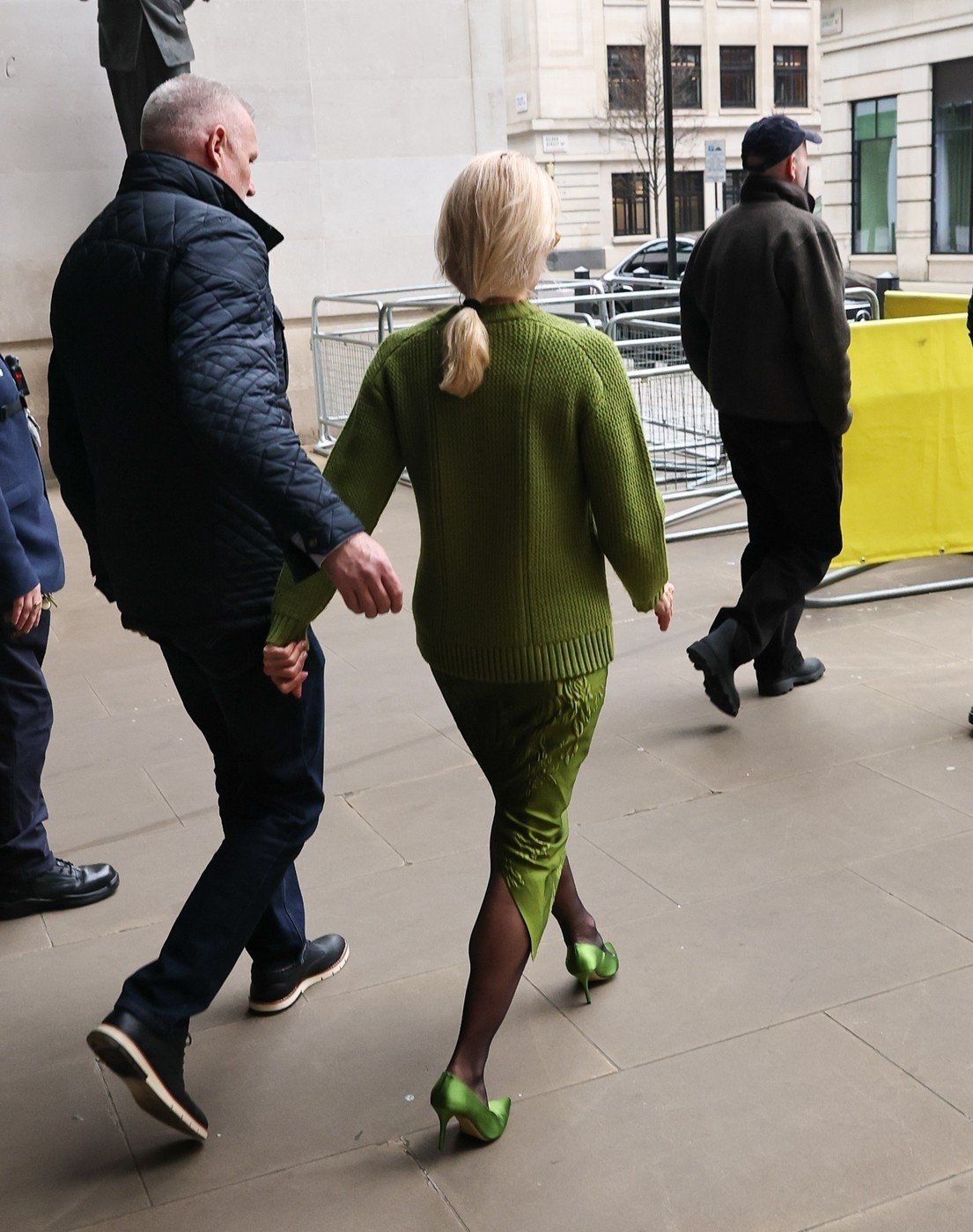 Ajunsă la cinematograful Curzon din Soho, și-a completat ținuta cu un sacou supradimensionat gri și o fustă cloș asortată.