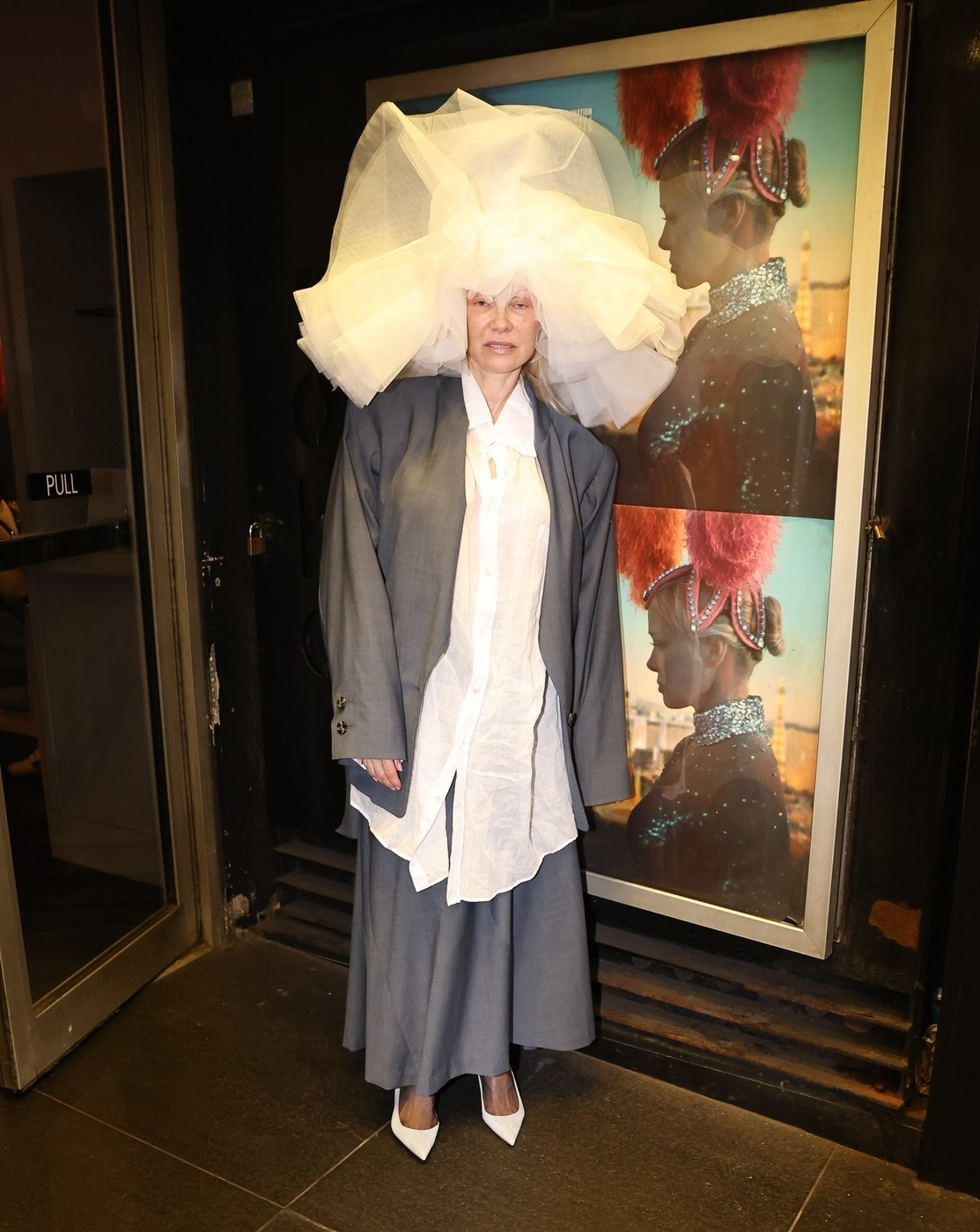 Pamela și-a completat ținuta excentrică cu o cămașă albă și o pereche de pantofi stiletto, alegând să apară fără machiaj.
