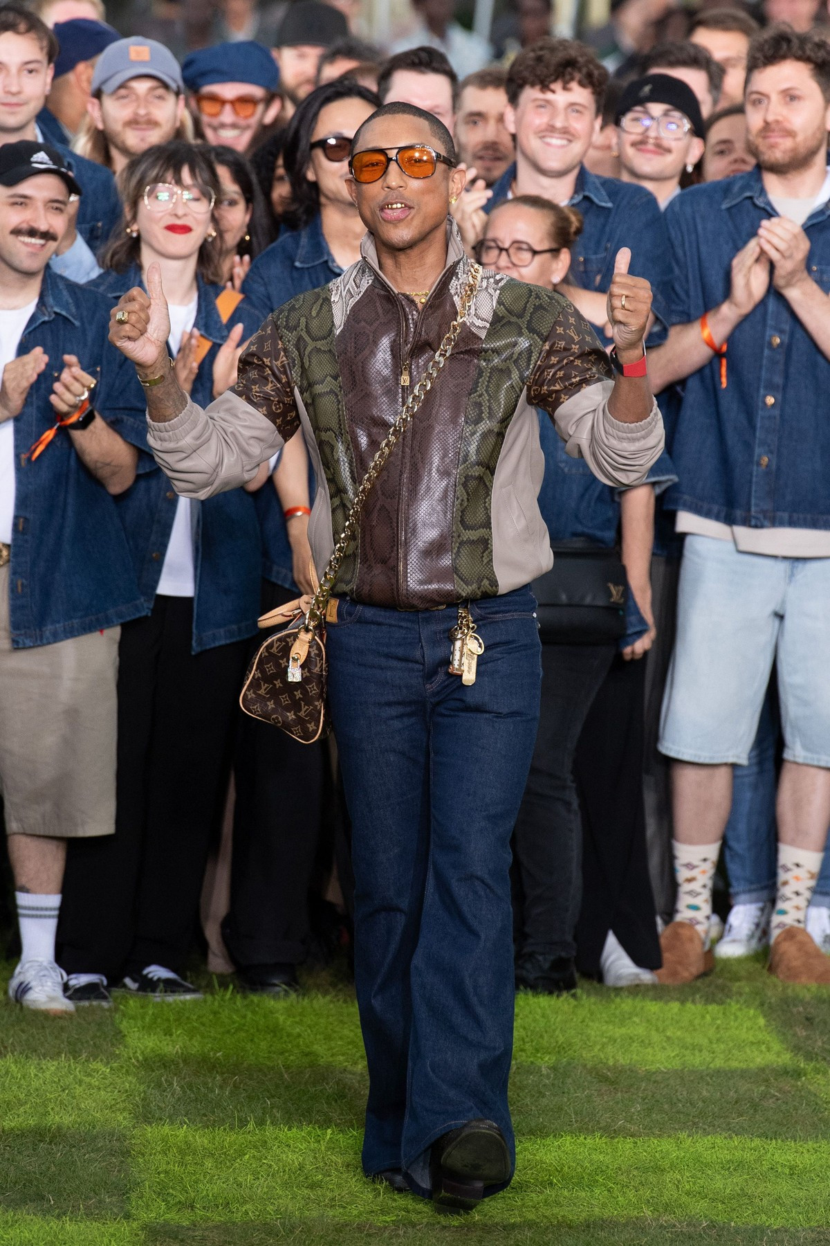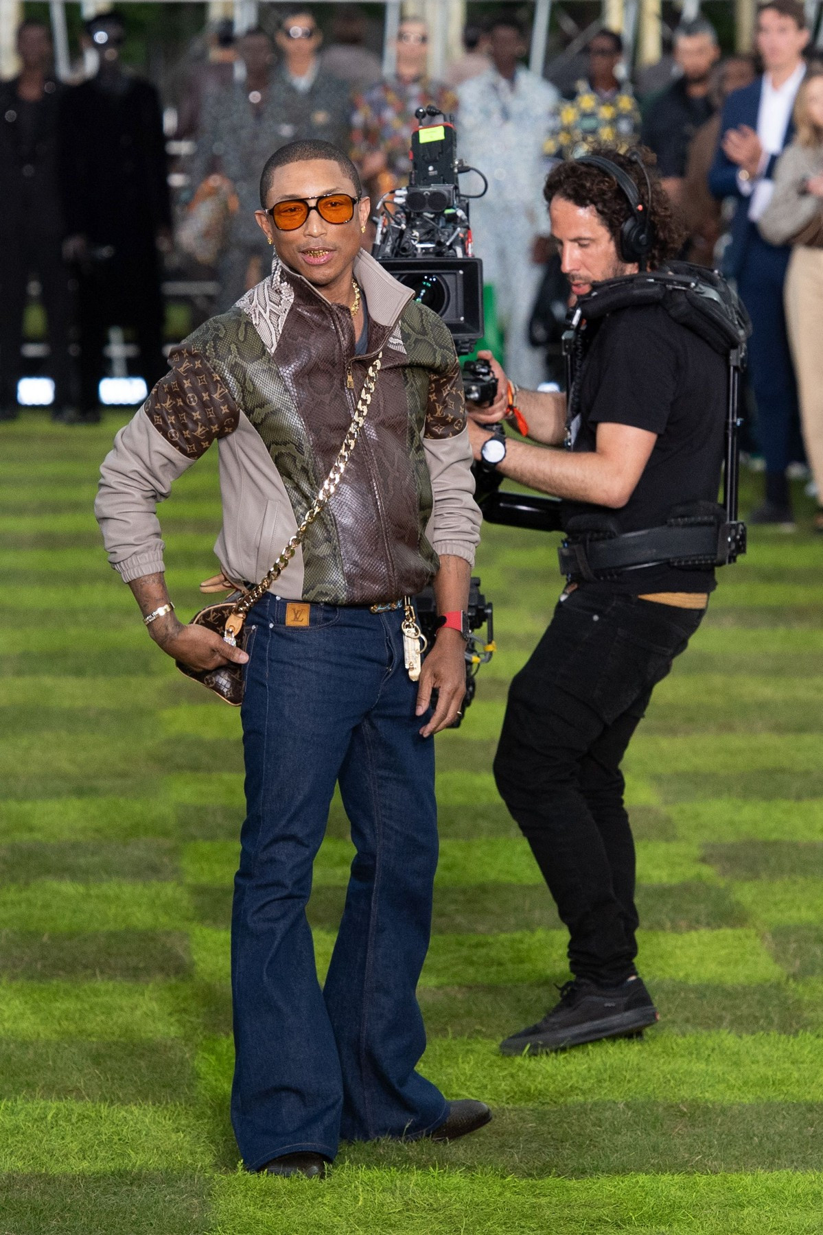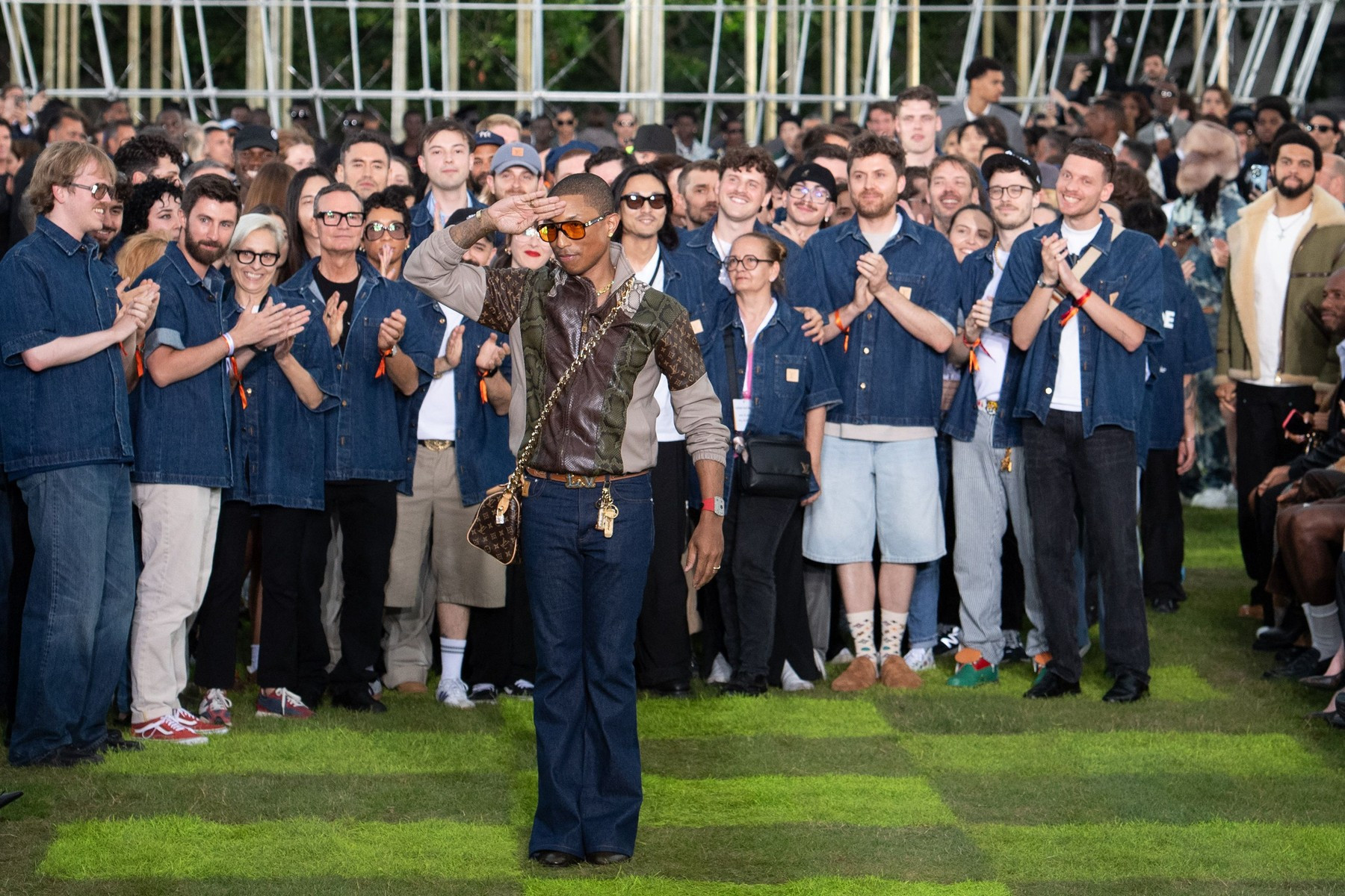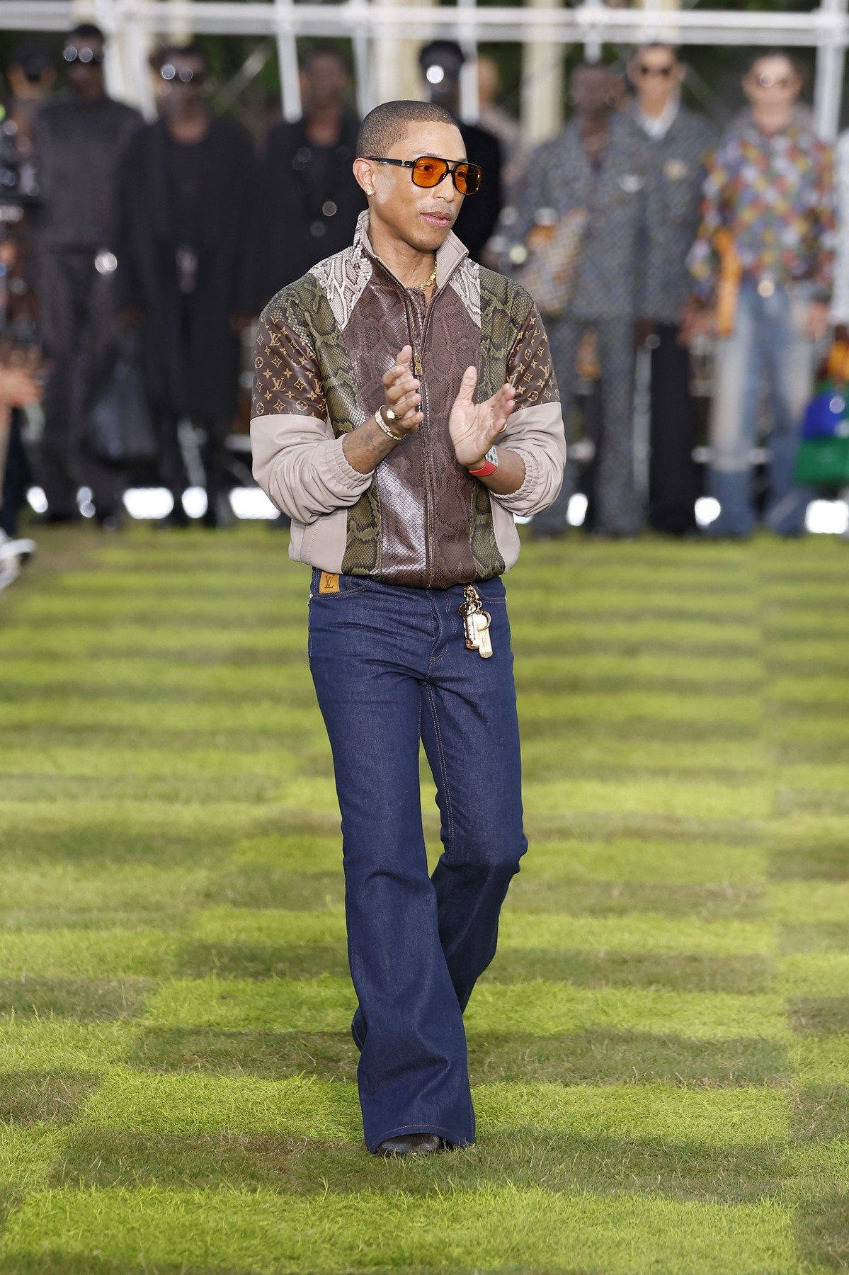 Modelele au defilat pe iarbă în costume croite cu precizie, jachete bomber lucioase, asortate cu ochelari de soare încrustaţi cu ştrasuri şi cu broşe colţuroase, sub forma unor aripi de avion, pe fundalul sonor compus de Pharrell Williams.