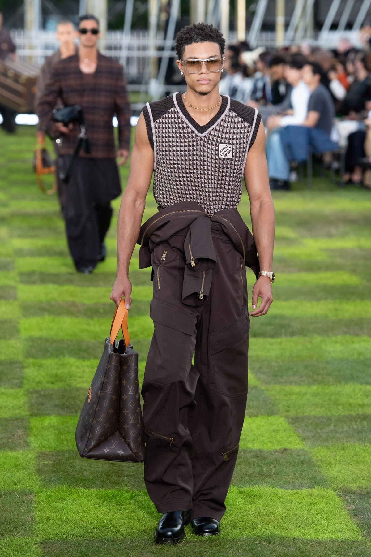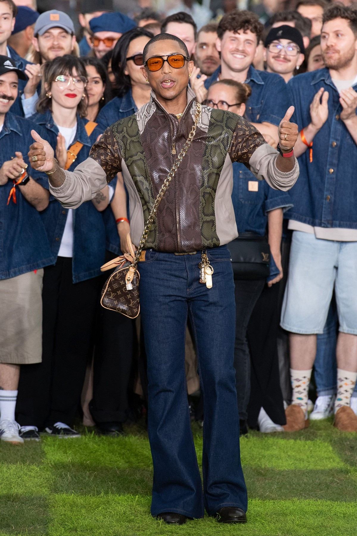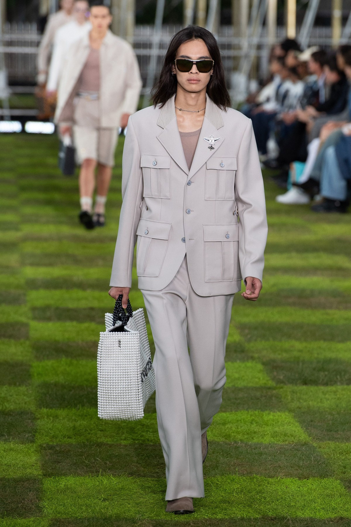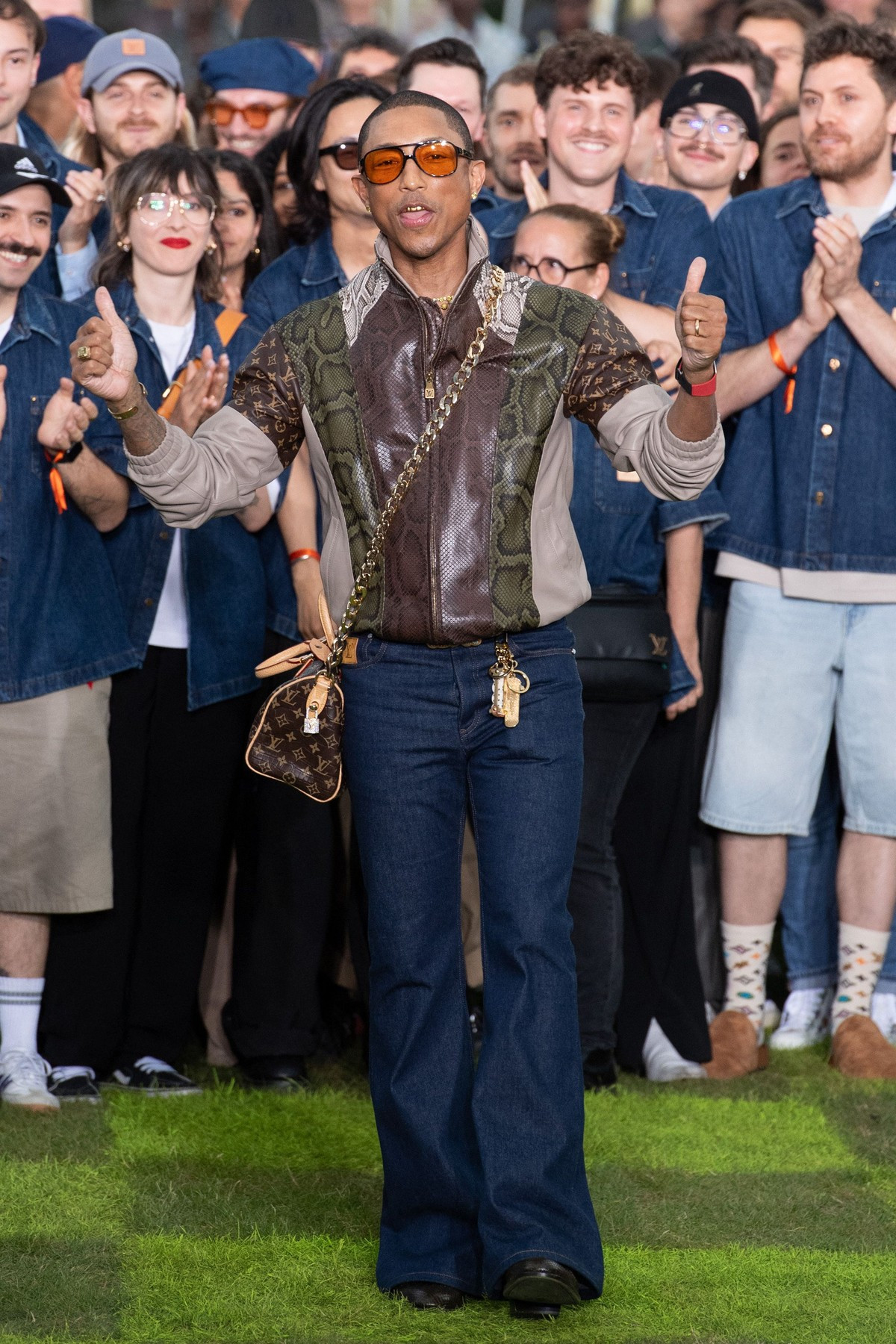 Modelele au defilat pe iarbă în costume croite cu precizie, jachete bomber lucioase, asortate cu ochelari de soare încrustaţi cu ştrasuri şi cu broşe colţuroase, sub forma unor aripi de avion, pe fundalul sonor compus de Pharrell Williams.
