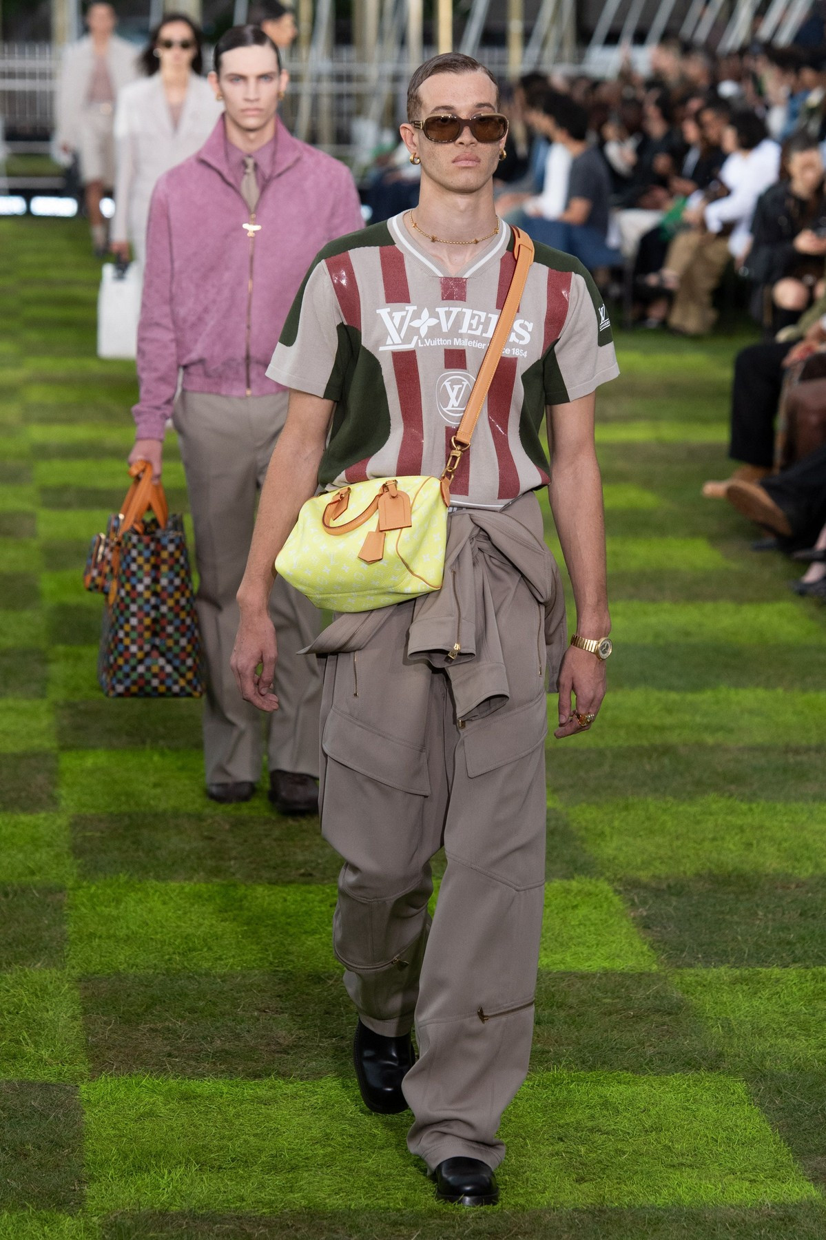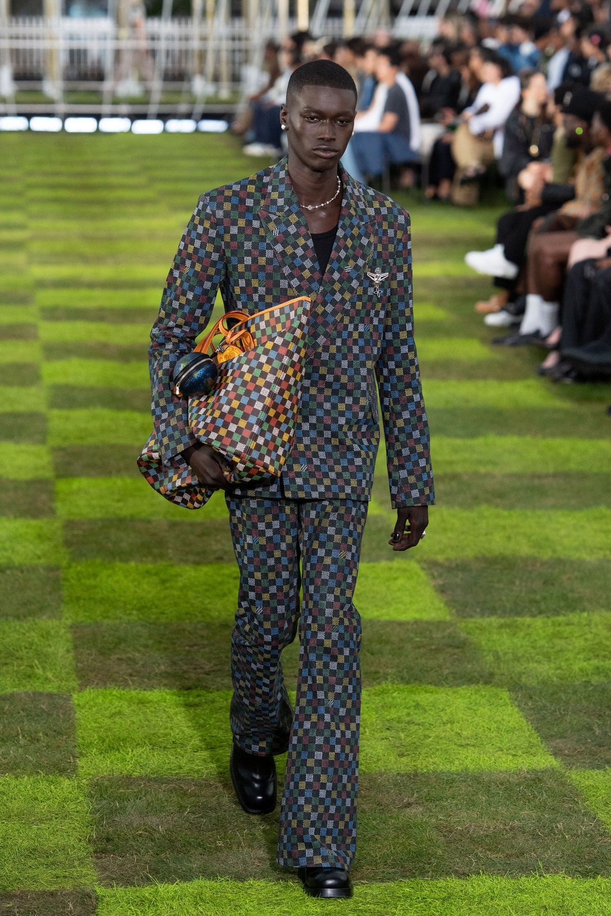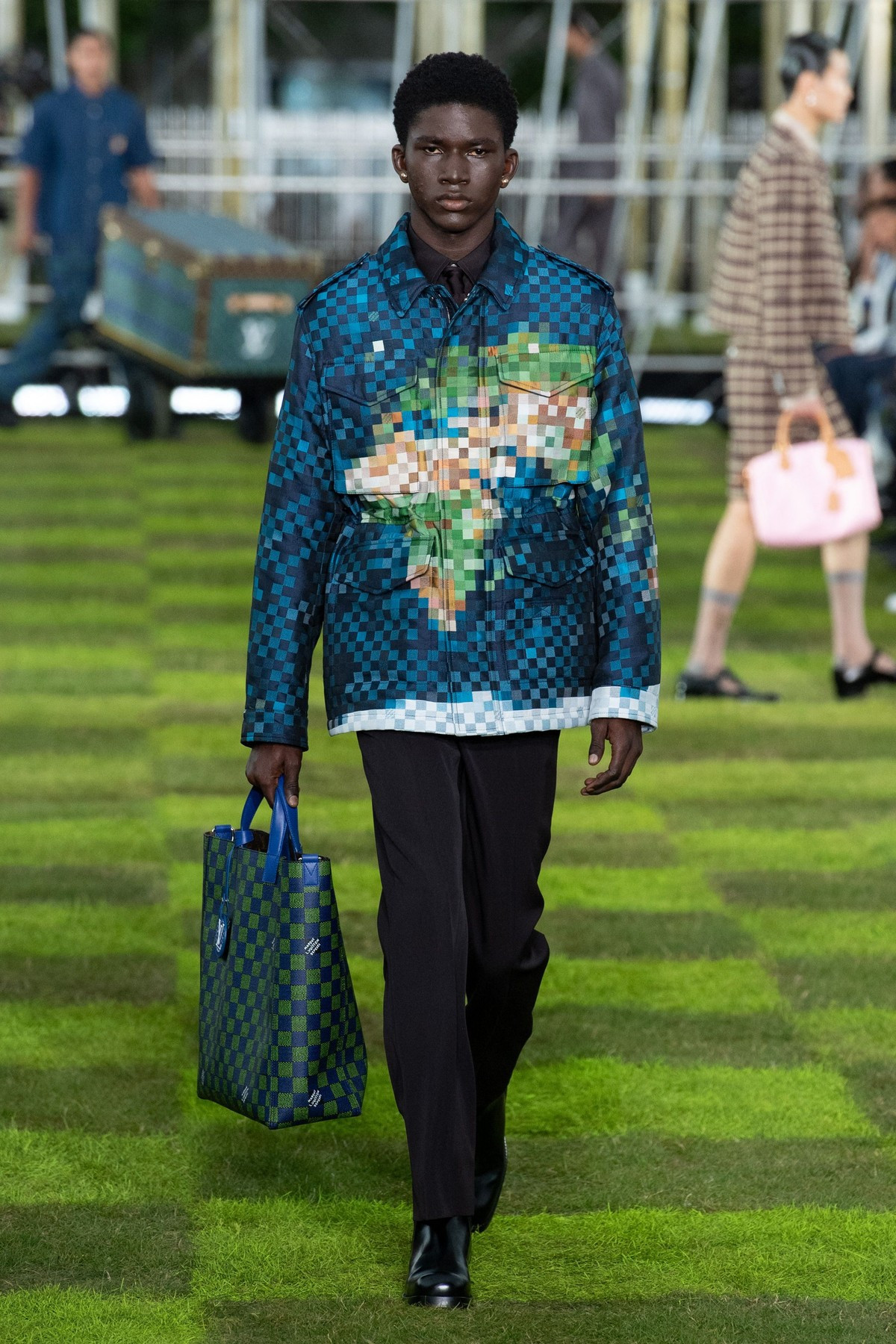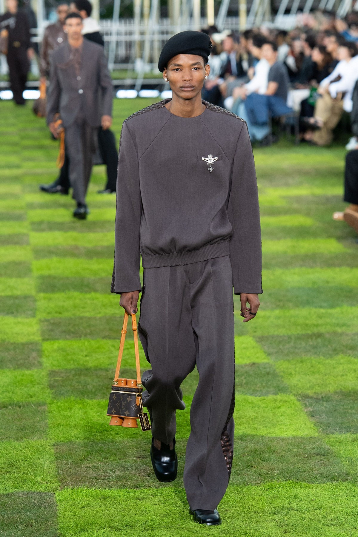 Louis Vuitton, cel mai mare brand de lux din lume, renumit pentru modele tablă de şah şi genţi de voiaj cu monograme, a explorat tema călătoriei cu prilejul colecţiei masculine primăvară/vară 2025, în decorul unei sculpturi înfăţişând globul pământesc, a şirurilor de drapele internaţionale şi a Turnului Eiffel care se zărea în depărtare.