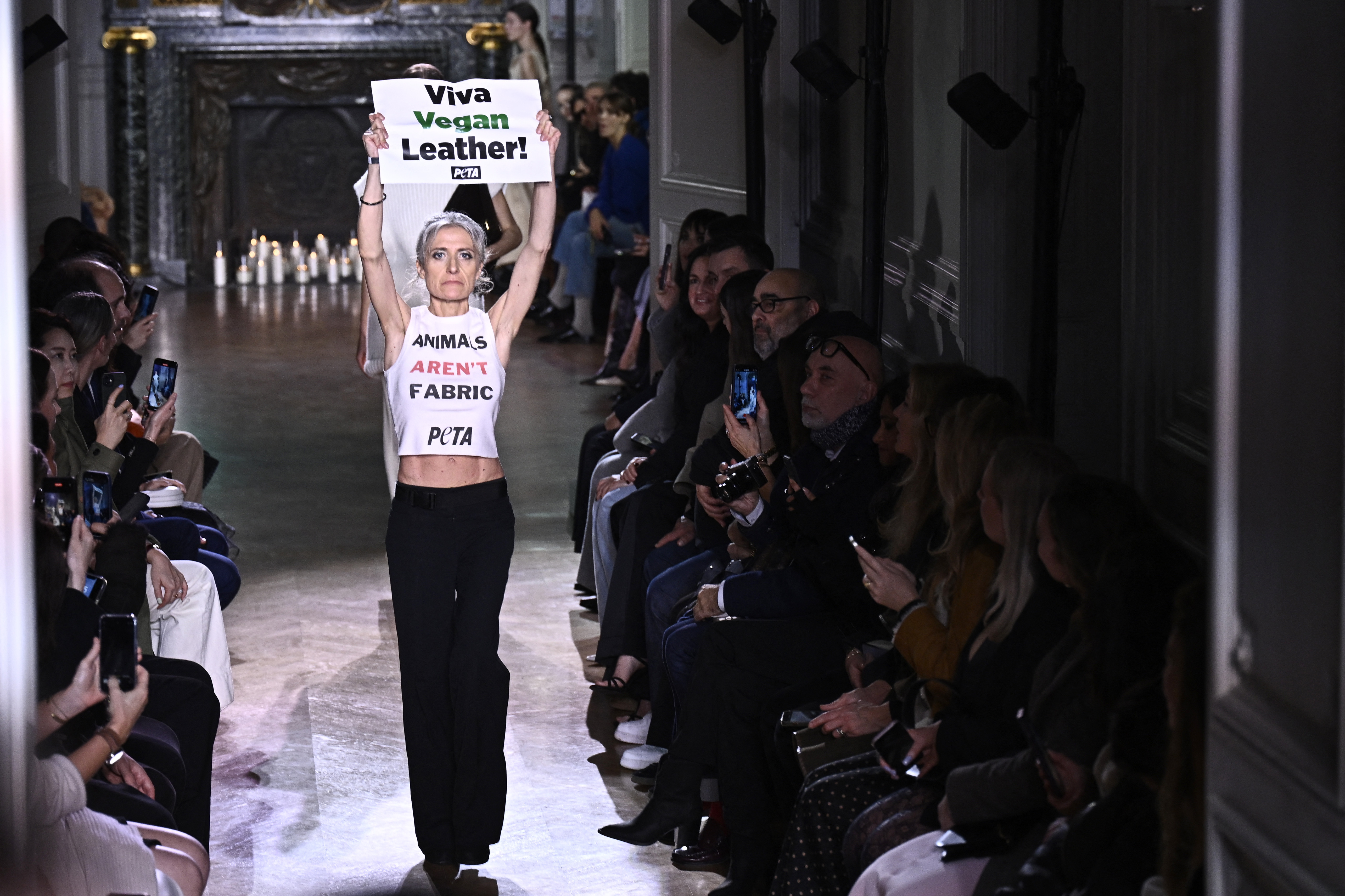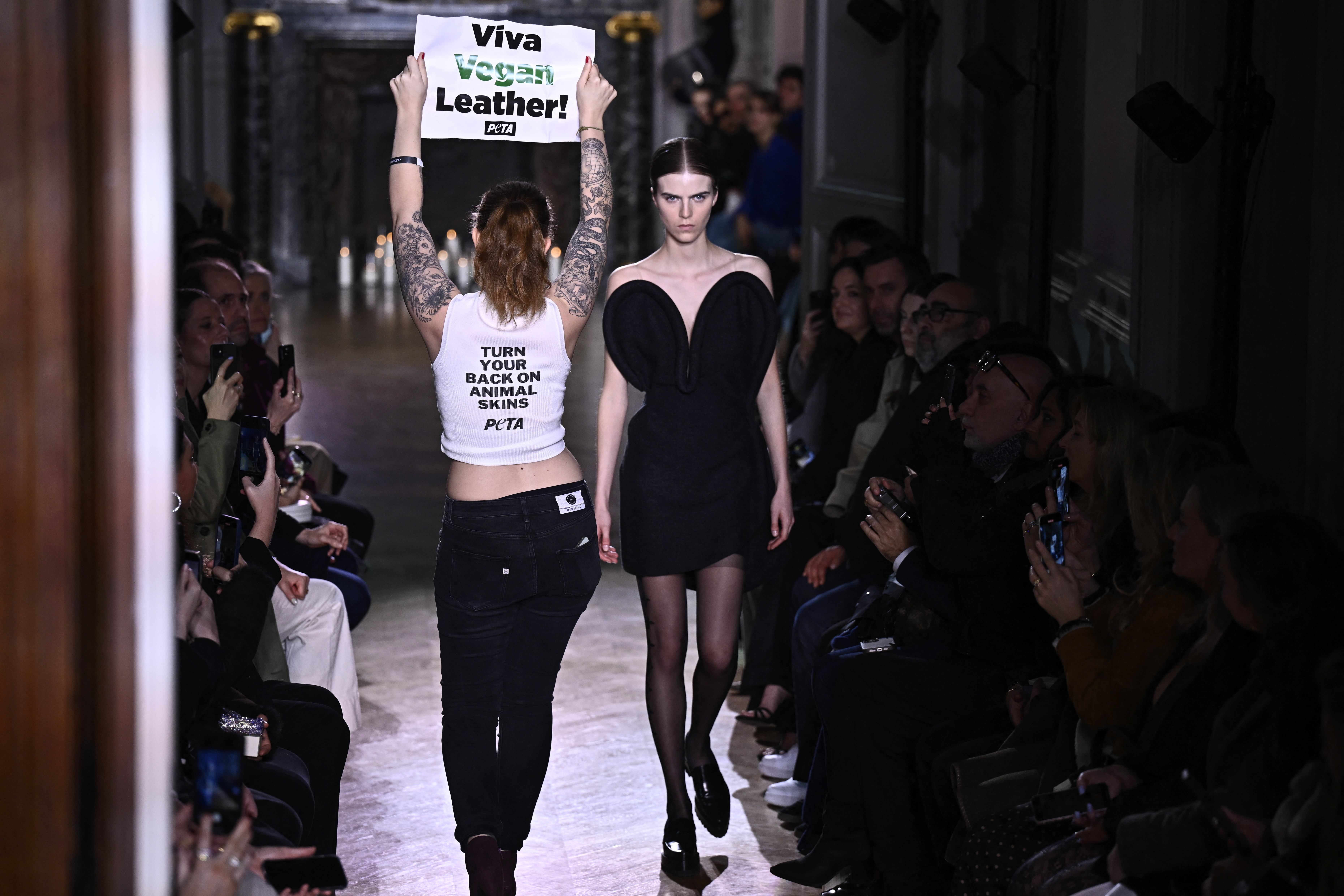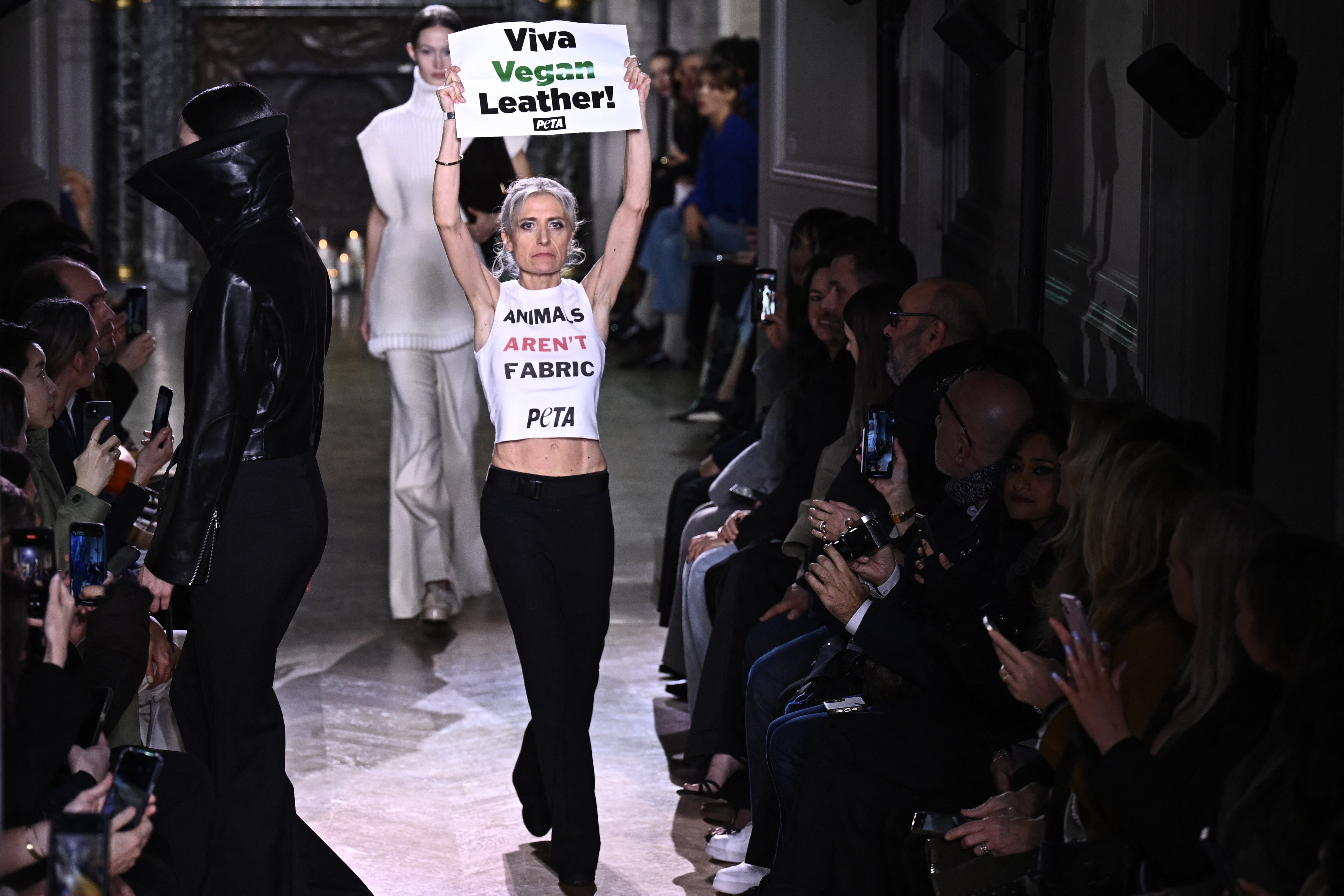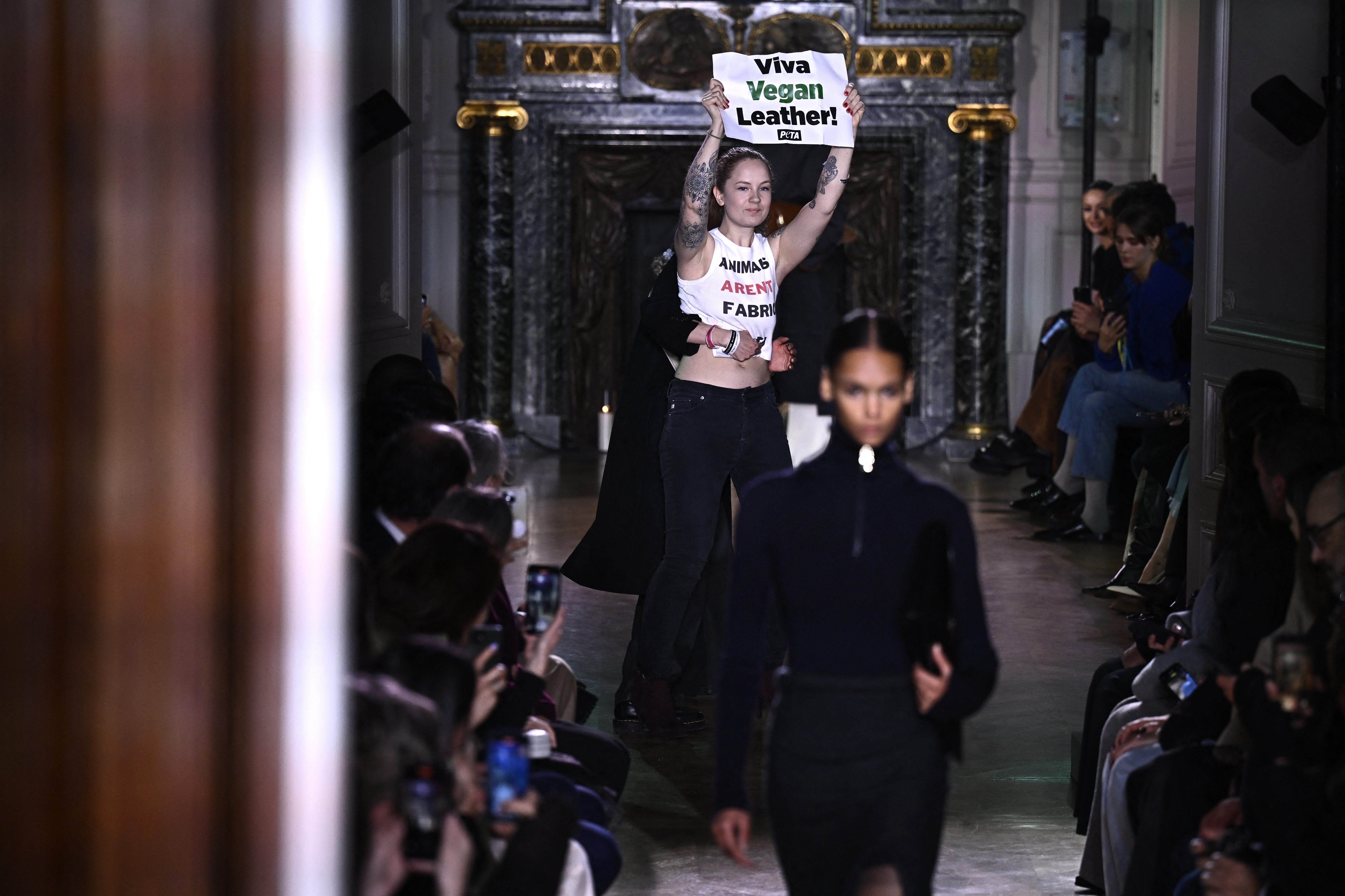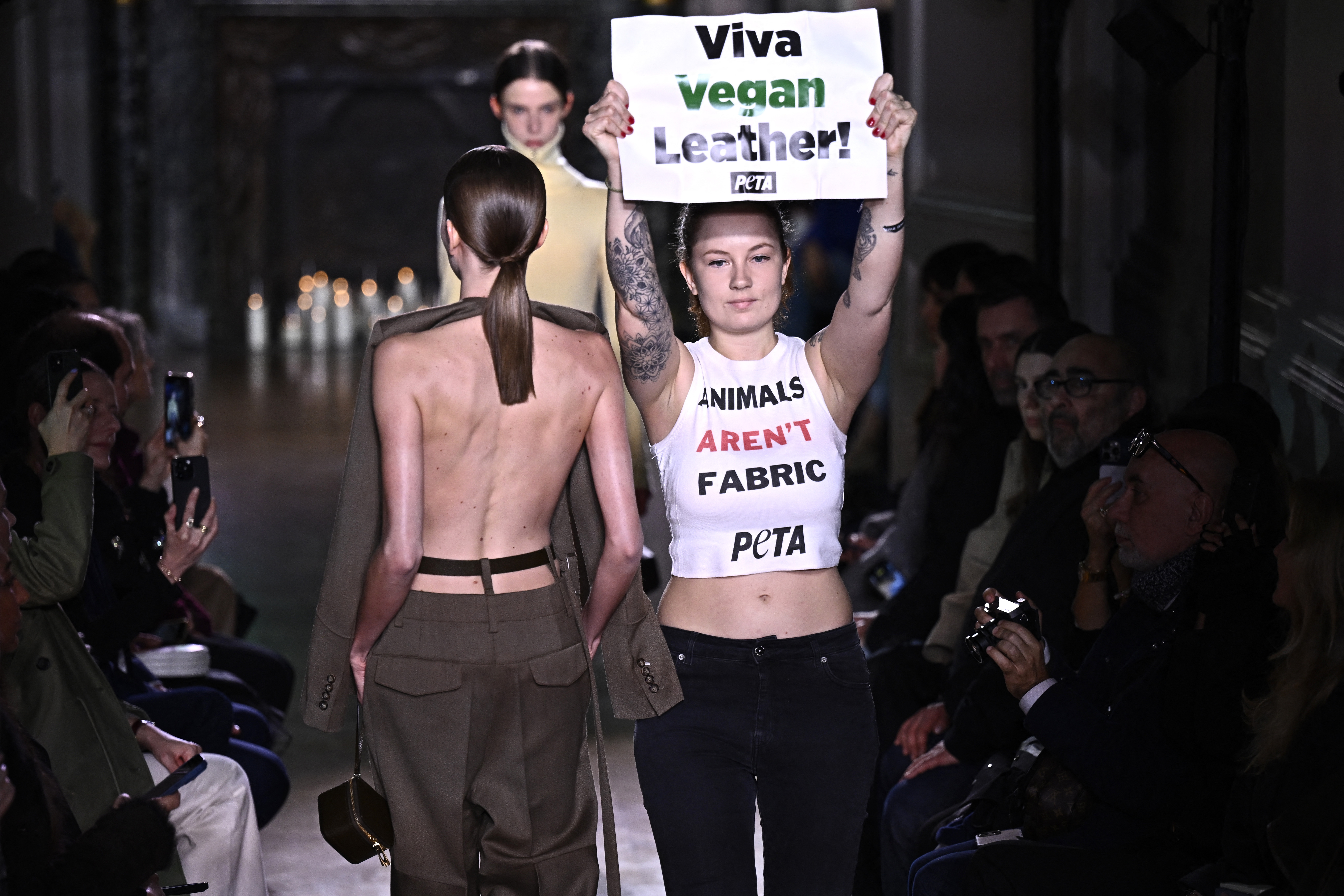 Activiştii au intrat pe podium în timp ce modelele defilau, ţinând pancarte pe care scria "Trăiască pielea vegană" şi purtând tricouri pe care scria "Întoarceţi spatele pieilor de animale" şi "Animalele nu sunt ţesături", înainte de a fi escortaţi de serviciile de securitate.