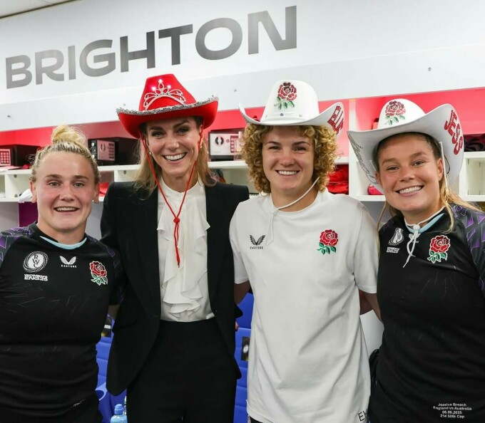 Alături de mesajul personal, a distribuit o fotografie în care apare alături de jucătoarele Megan Jones, Ellie Kildunne și Jess Breach, ultimele două purtând pălării de cowboy albe decorate cu trandafirul roșu – simbolul echipei – în timp ce Prințesa Kate purta o pălărie roșie similară, cu un design asemănător unei tiare în partea din față.