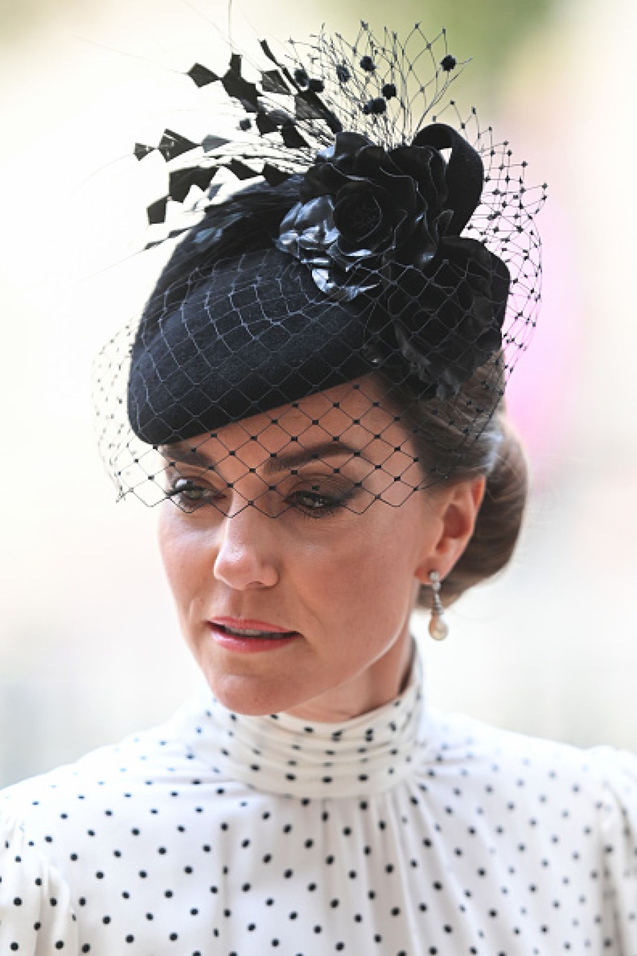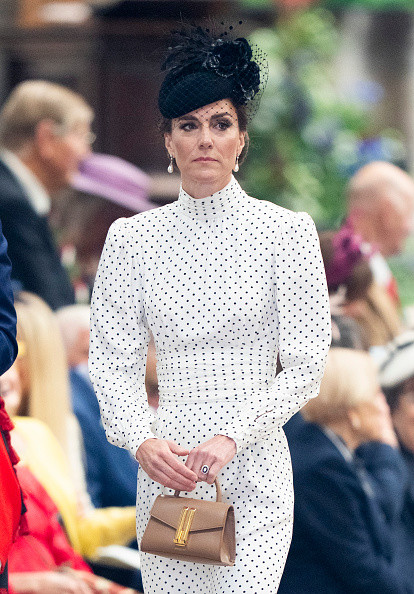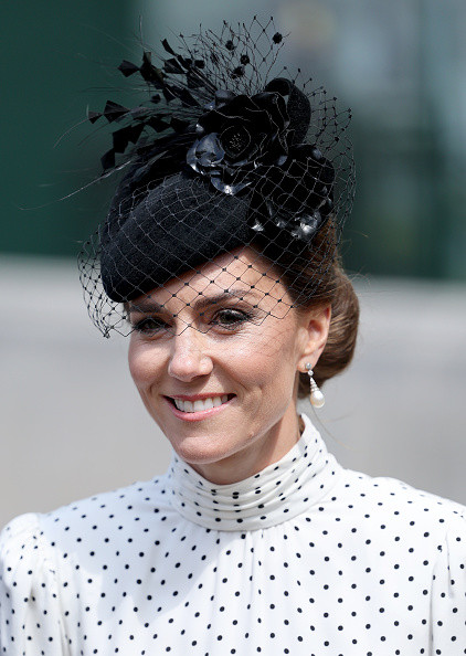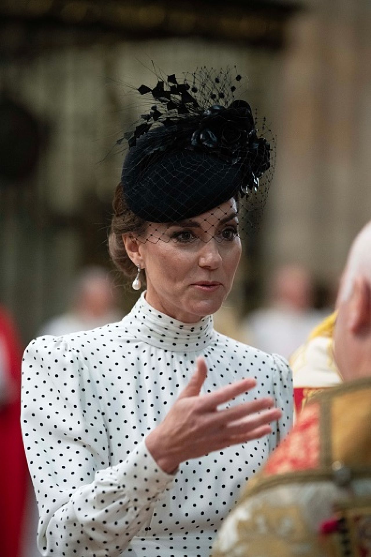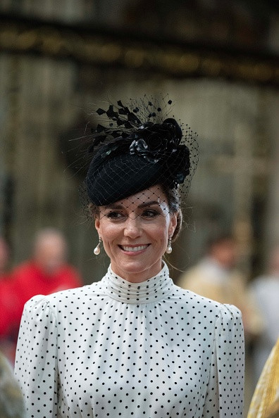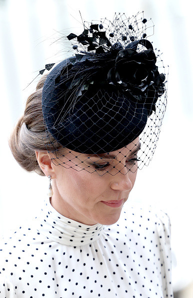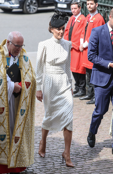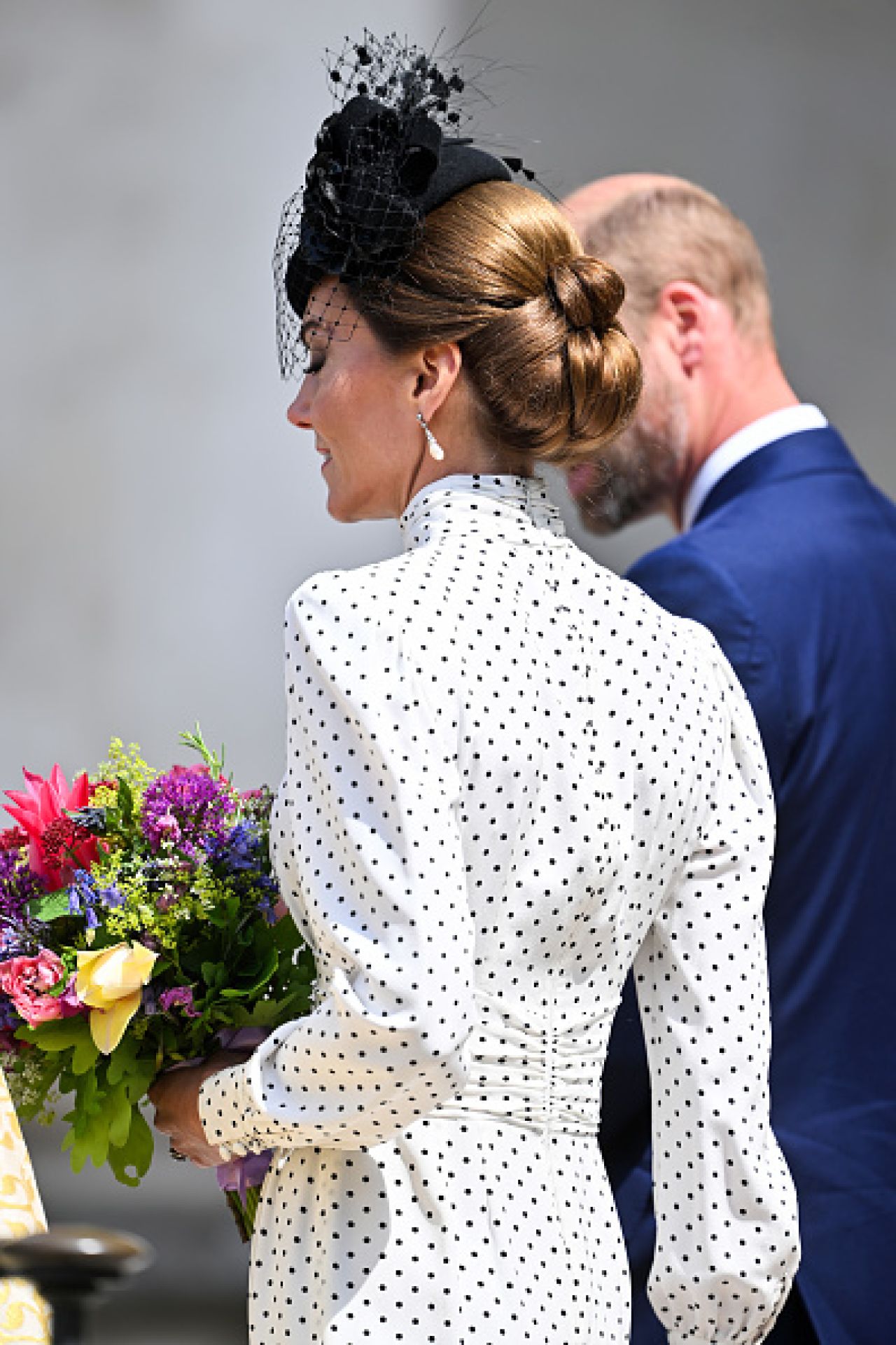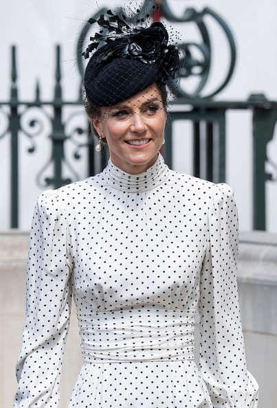 Kate a ales o rochie albă cu buline, semnată de Alessandra Rich, completată de o pălărie elegantă creată de Juliette Botterill. Ținuta a fost accentuată de o pereche de cercei cu valoare simbolică deosebită, care au aparținut regretatei Prințese Diana, mama lui William.