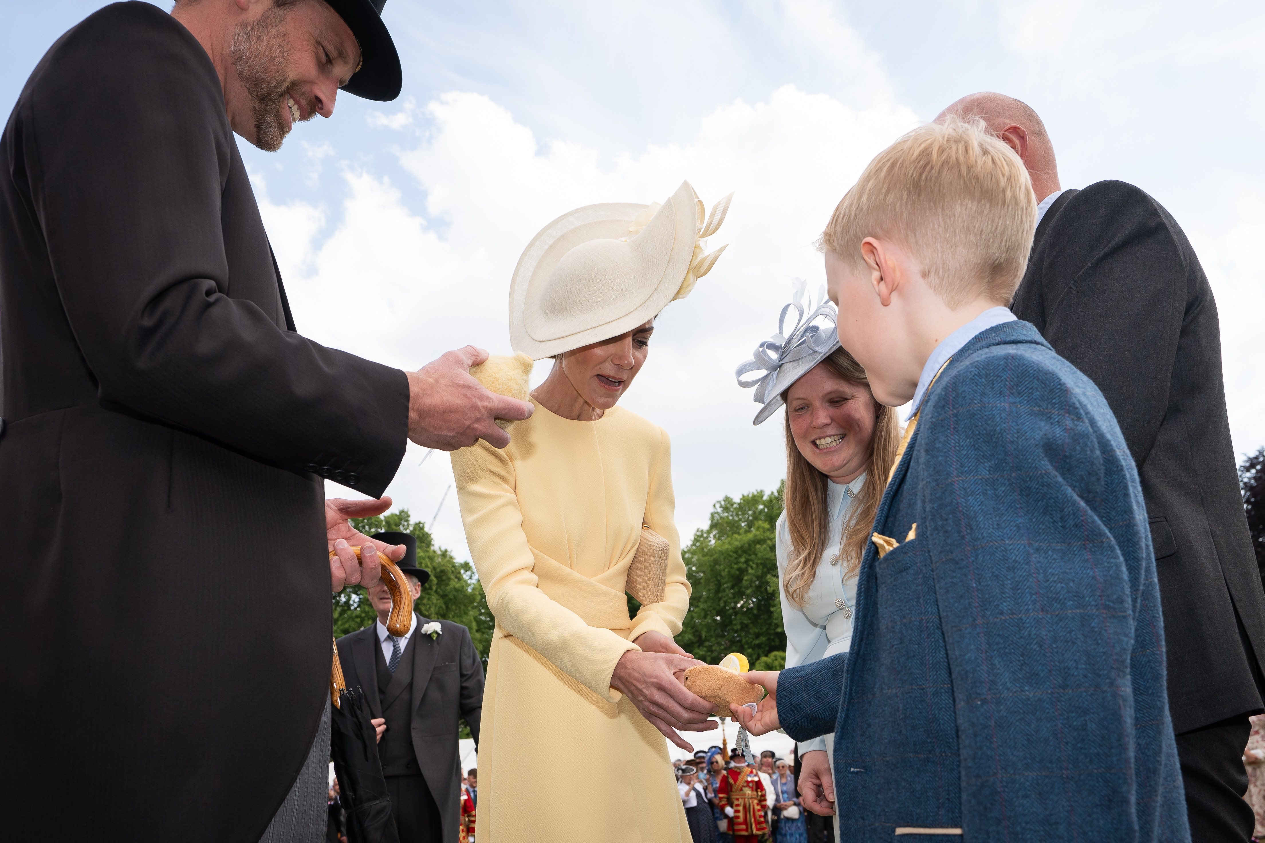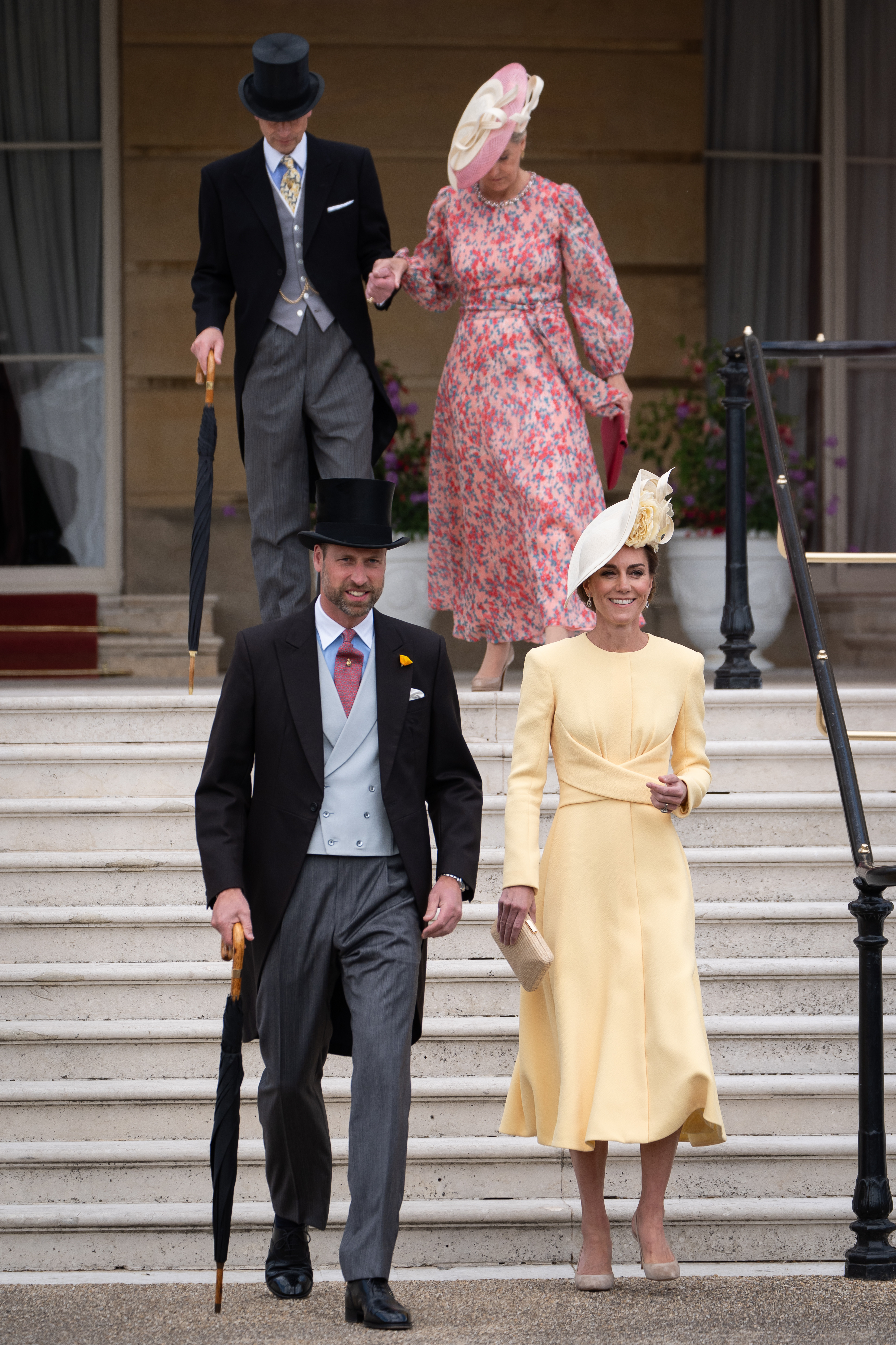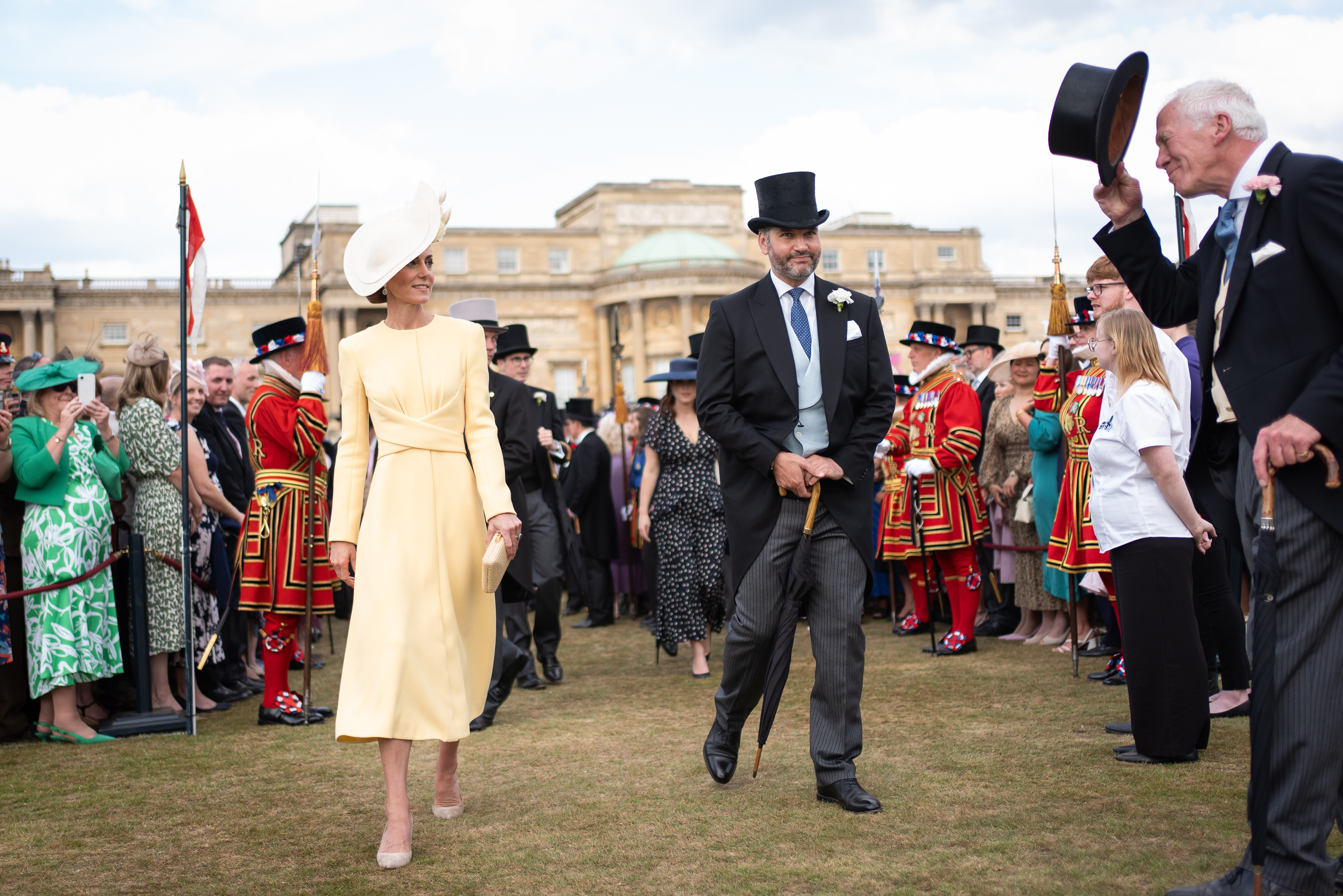 Prințesa Kate, în vârstă de 43 de ani, și Prințul William, 42, s-au plimbat printre miile de invitați prezenți pe peluzele palatului, purtând ținute impecabile. William a fost elegant într-un costum cu joben, iar Kate a atras toate privirile într-o rochie galbenă semnată Emilia Wickstead și o pălărie Philip Treacy.