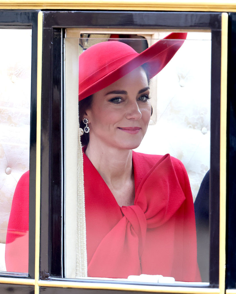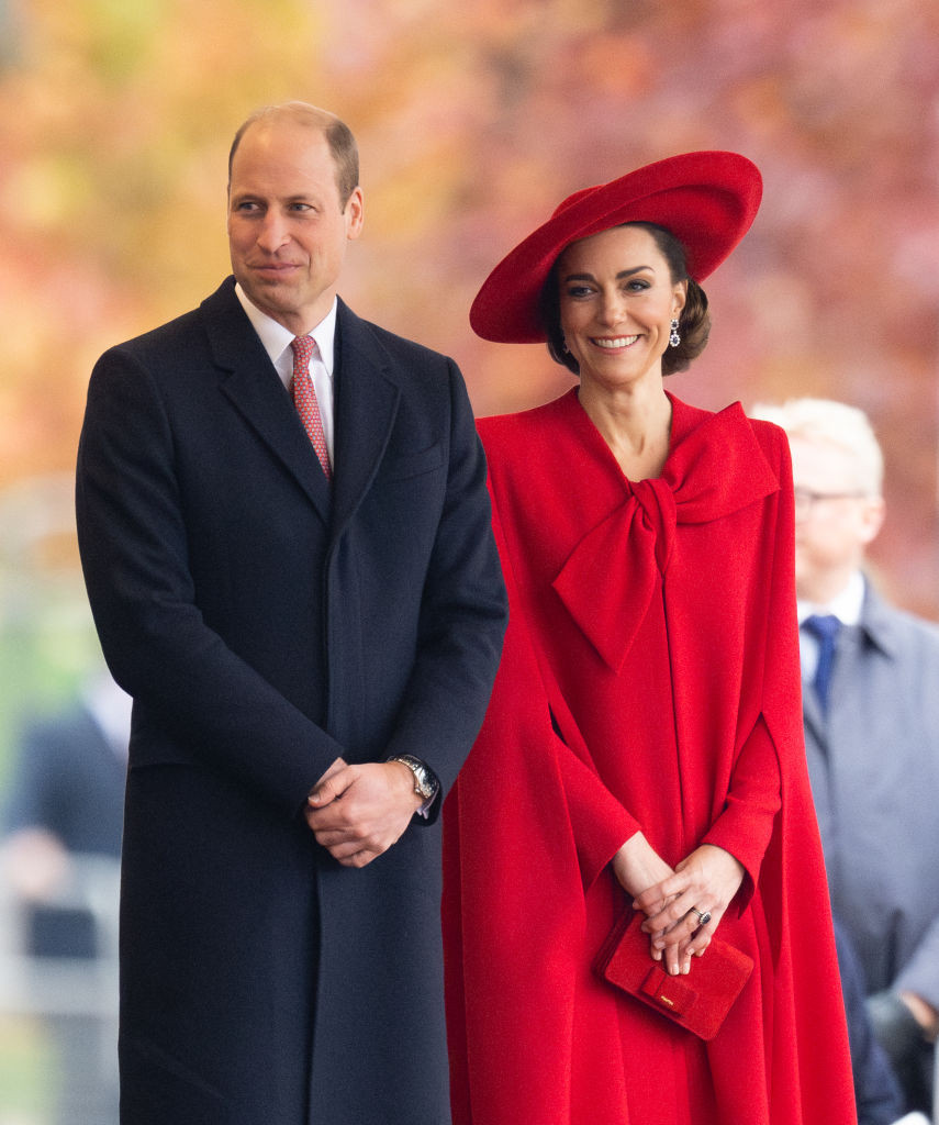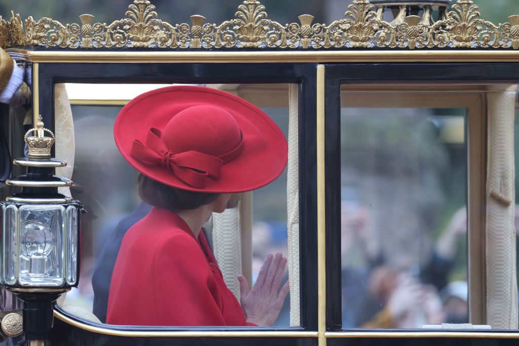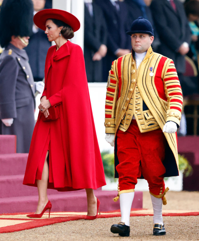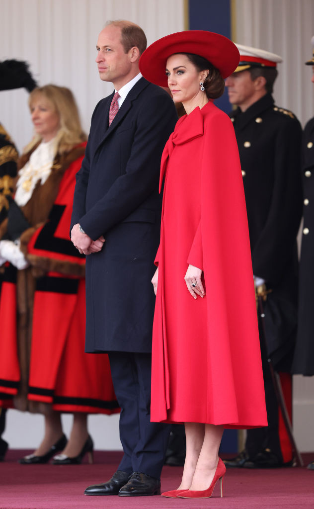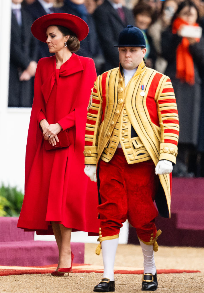 La ocazia vizitei de stat a președintelui sud-coreean și a soției sale, Kate, alături de William, a participat la o ceremonie organizată la parcul Horse Guards Parade din Londra. La eveniment a purtat o capă roșie pe care a accesoizat-o cu o pălărie de aceași culoare.