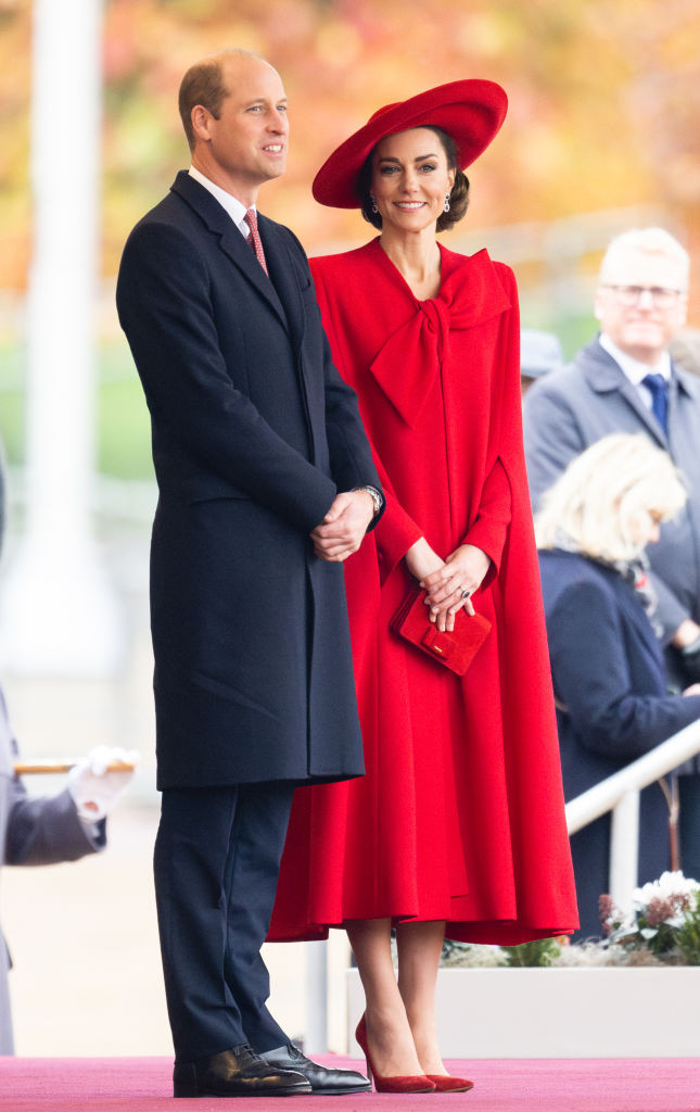 Pentru această ocazie, care marchează a doua vizită de stat găzduită de noul rege, Kate a uimit într-o rochie cu mantie semnată Catherine Walker, de un roșu aprins. Ținuta festivă era compusă dintr-un palton cu pelerină împodobit cu o fundă mare la decolteu, care ascundea o rochie roșie mai scurtă, asortată. Kate a completat look-ul monocromatic îndrăzneț cu o pereche de pantofi din piele de căprioară purpurie de la Gianvito Rossi, o pălărie roșie cu boruri largi și o geantă de umăr dreptunghiulară roșie cu o fundă mică, de la Miu Miu.