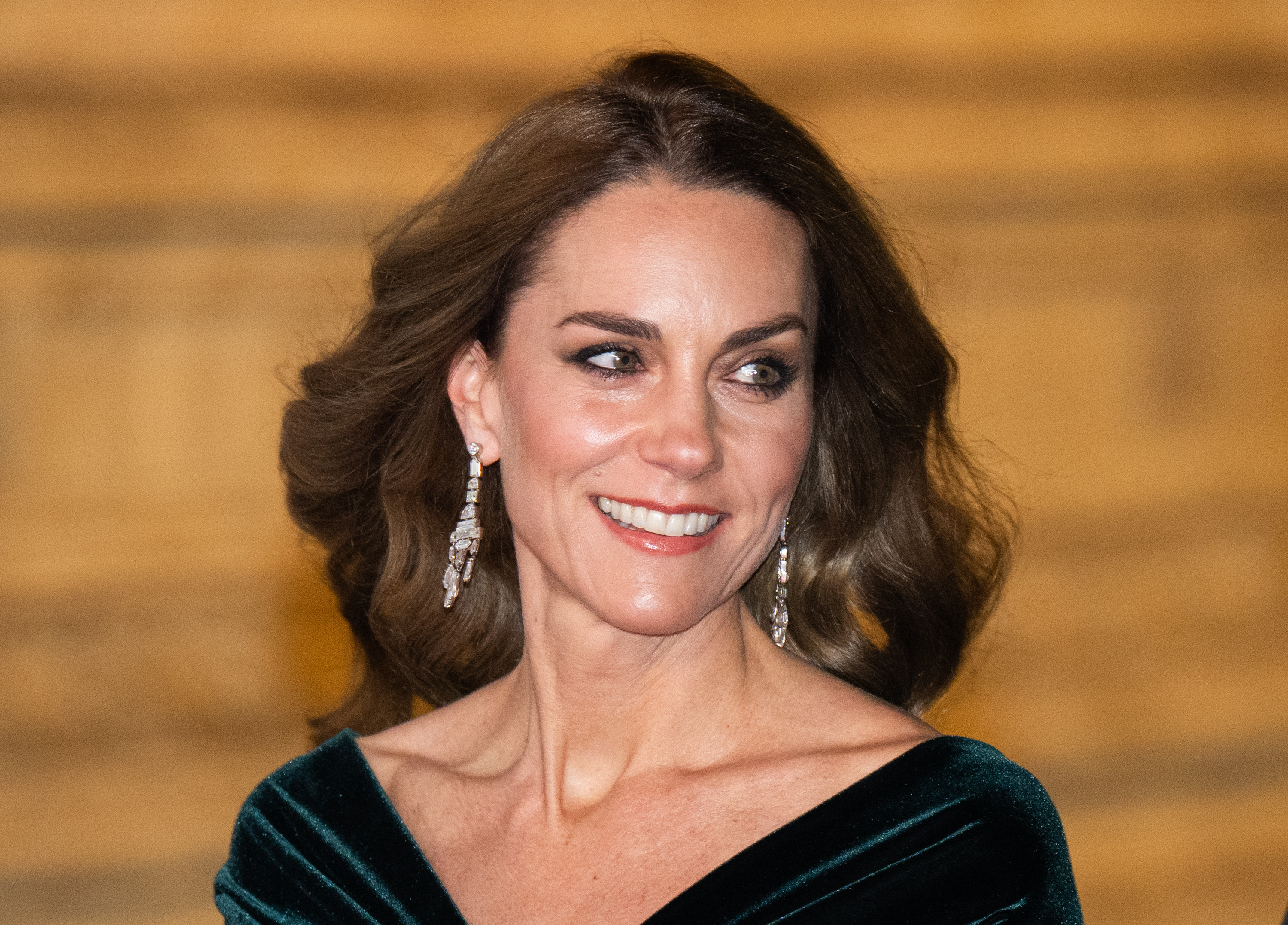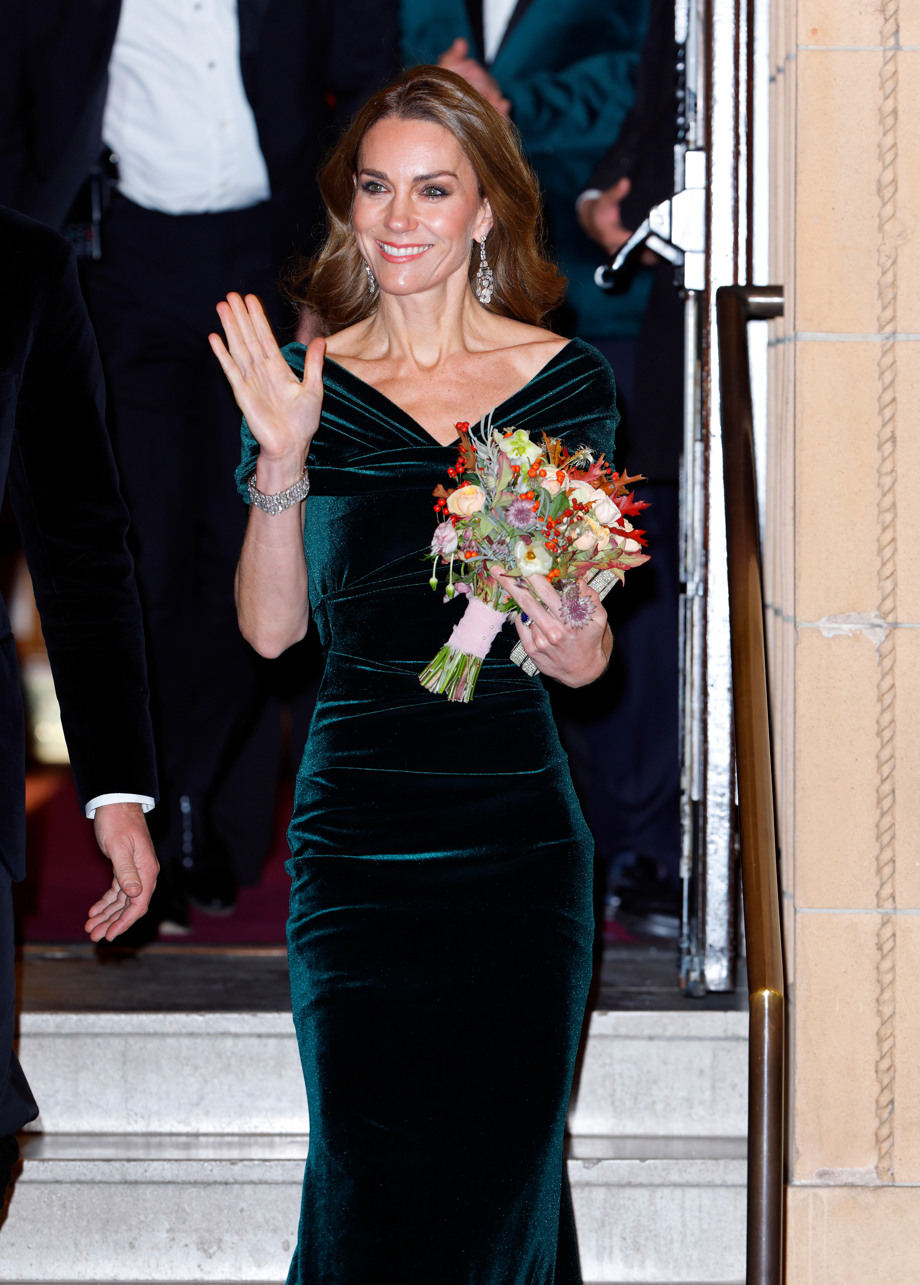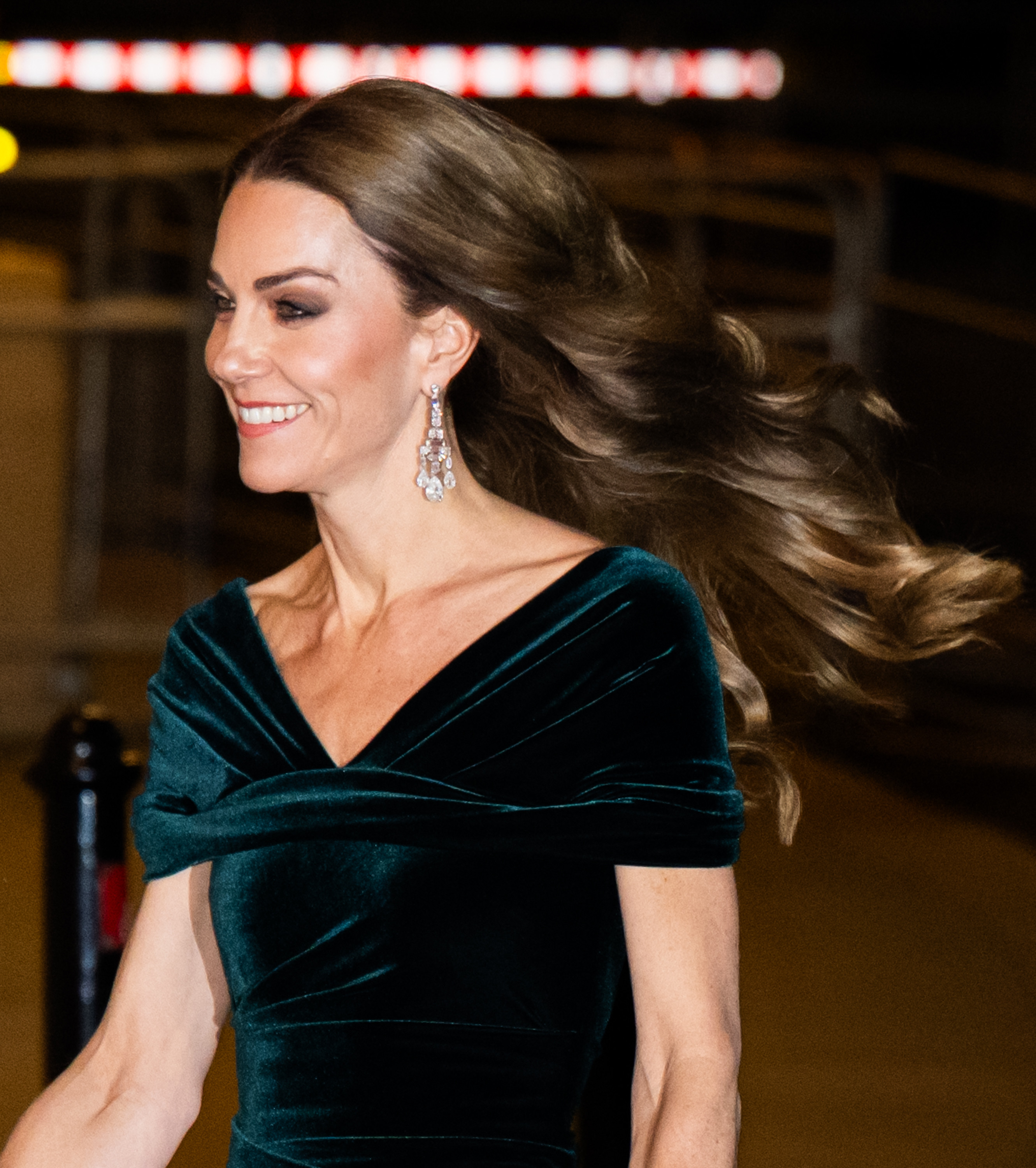 Catherine şi-a asortat rochia smarald, despre care se crede că este de la brandul german de lux Talbot Runhof, cu o pereche de cercei „candelabru” Greville, preferaţi altădată de regretata Regină şi realizaţi de Cartier de-a lungul a 11 ani.