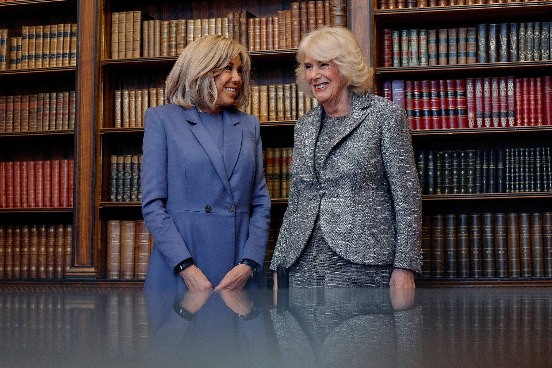 Cele două femei, care se cunosc bine, s-au sărutat miercuri pe obraz atât la venire, cât şi la plecare. Ele au purtat şi o discuţie privată care a durat peste 15 minute. Brigitte Macron i-a oferit reginei Camilla o carte despre restaurarea Catedralei Notre-Dame din Paris.