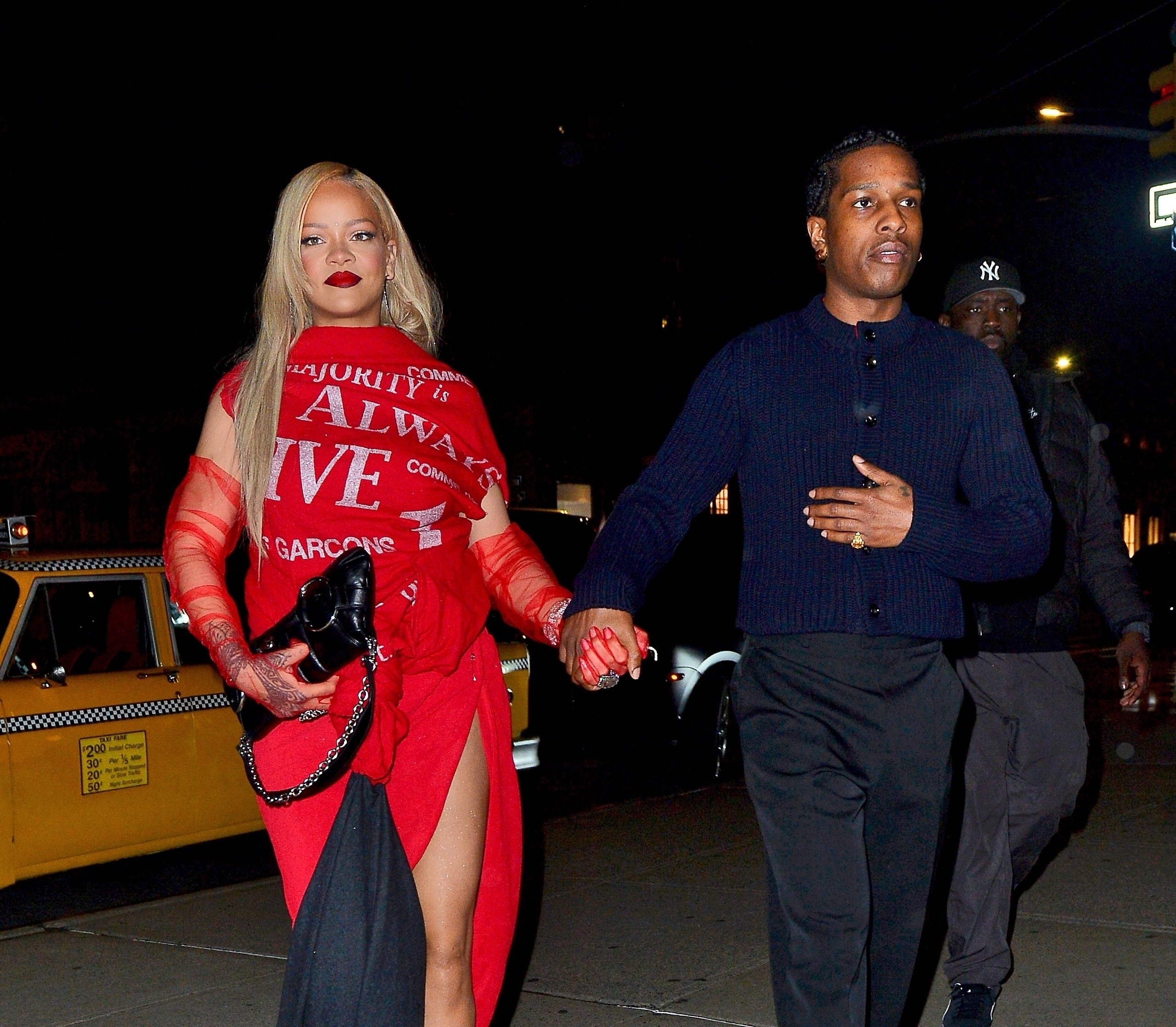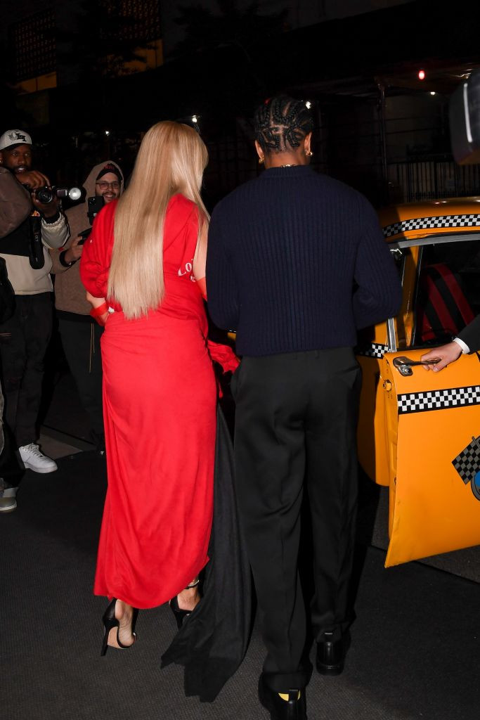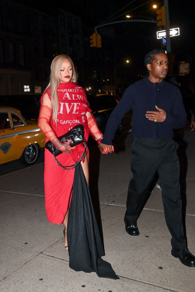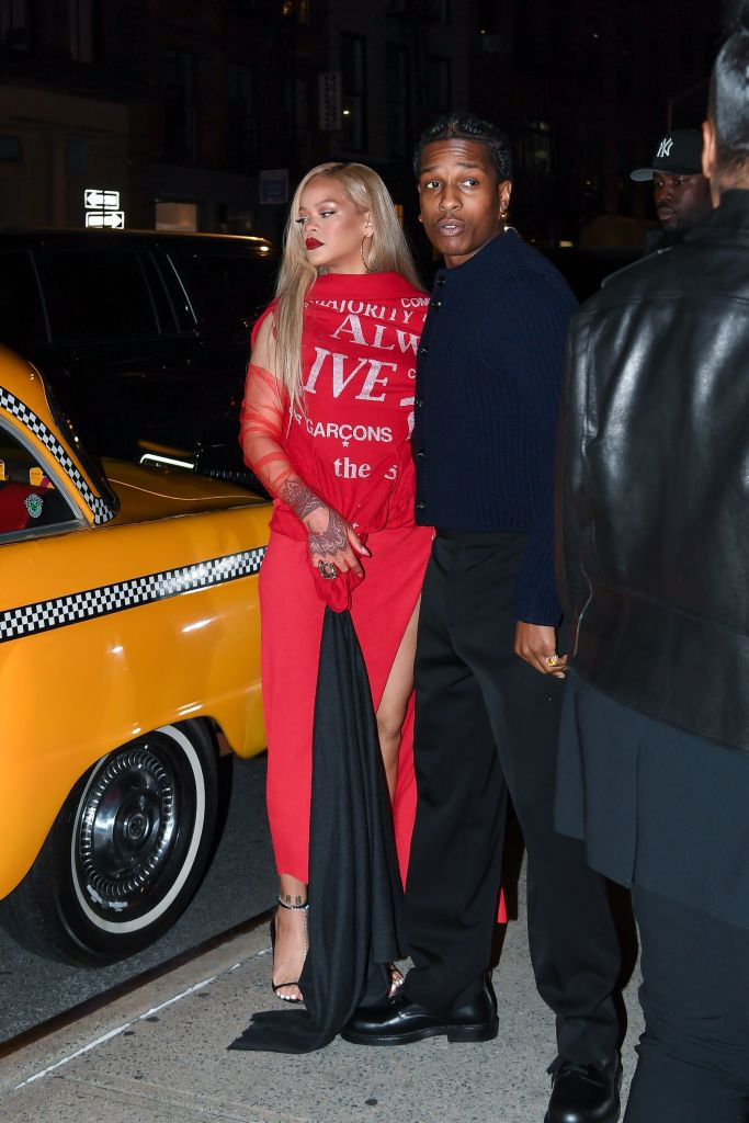 Cântăreața în vârstă de 36 de ani și-a petrecut seara în compania iubitului ei, A$AP Rocky. Ea a purtat un tricou roșu și o fustă maxi roșie, cu crăpătură pe unul dintre picioare, scrie Daily Mail.
