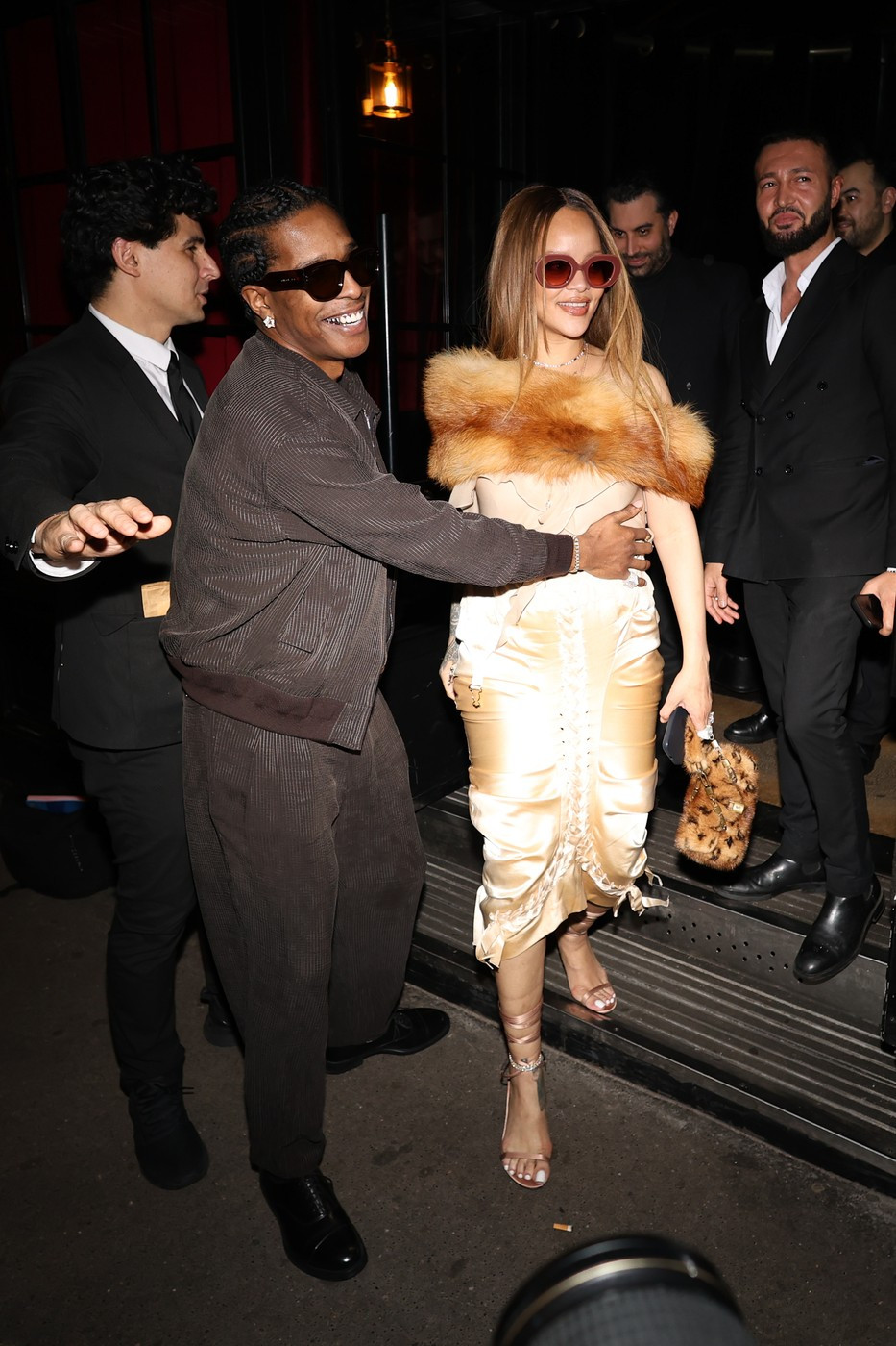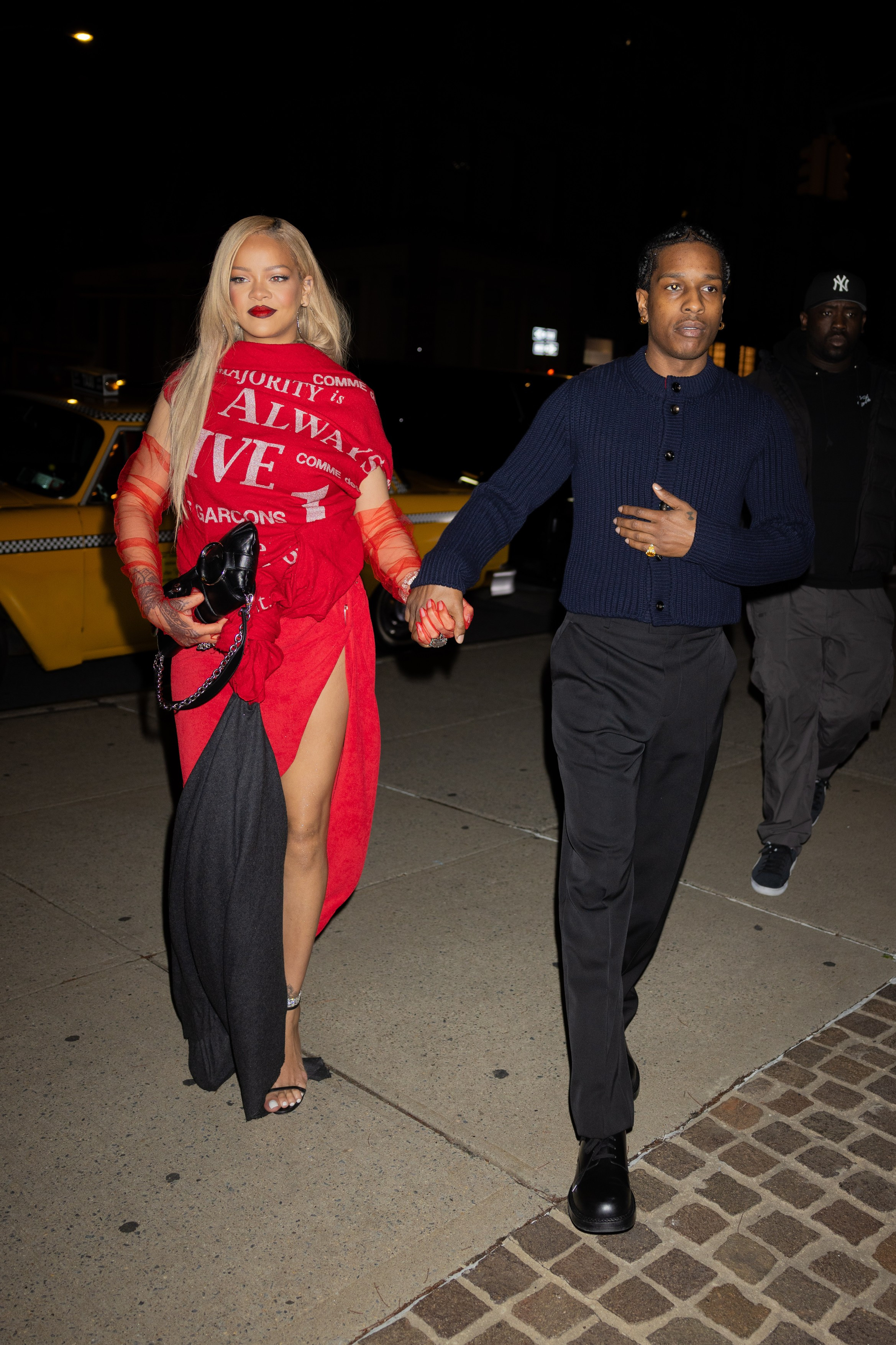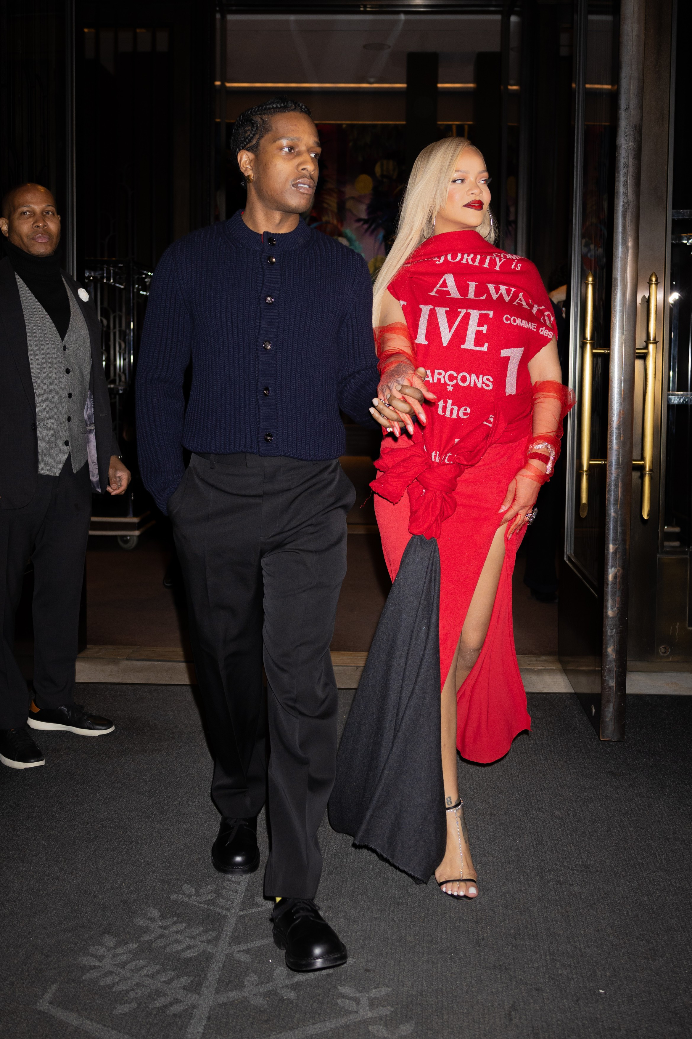 Cântăreața în vârstă de 36 de ani și-a petrecut seara în compania iubitului ei, A$AP Rocky. Ea a purtat un tricou roșu și o fustă maxi roșie, cu crăpătură pe unul dintre picioare, scrie Daily Mail.