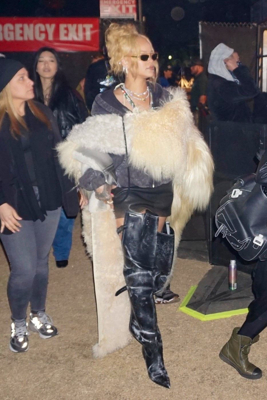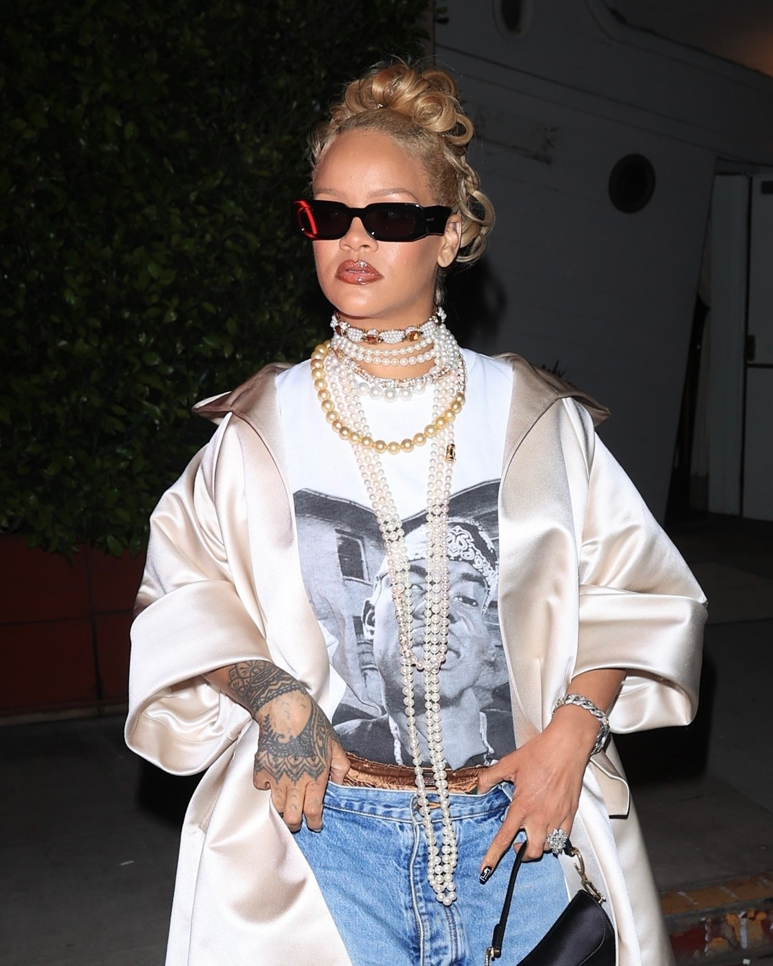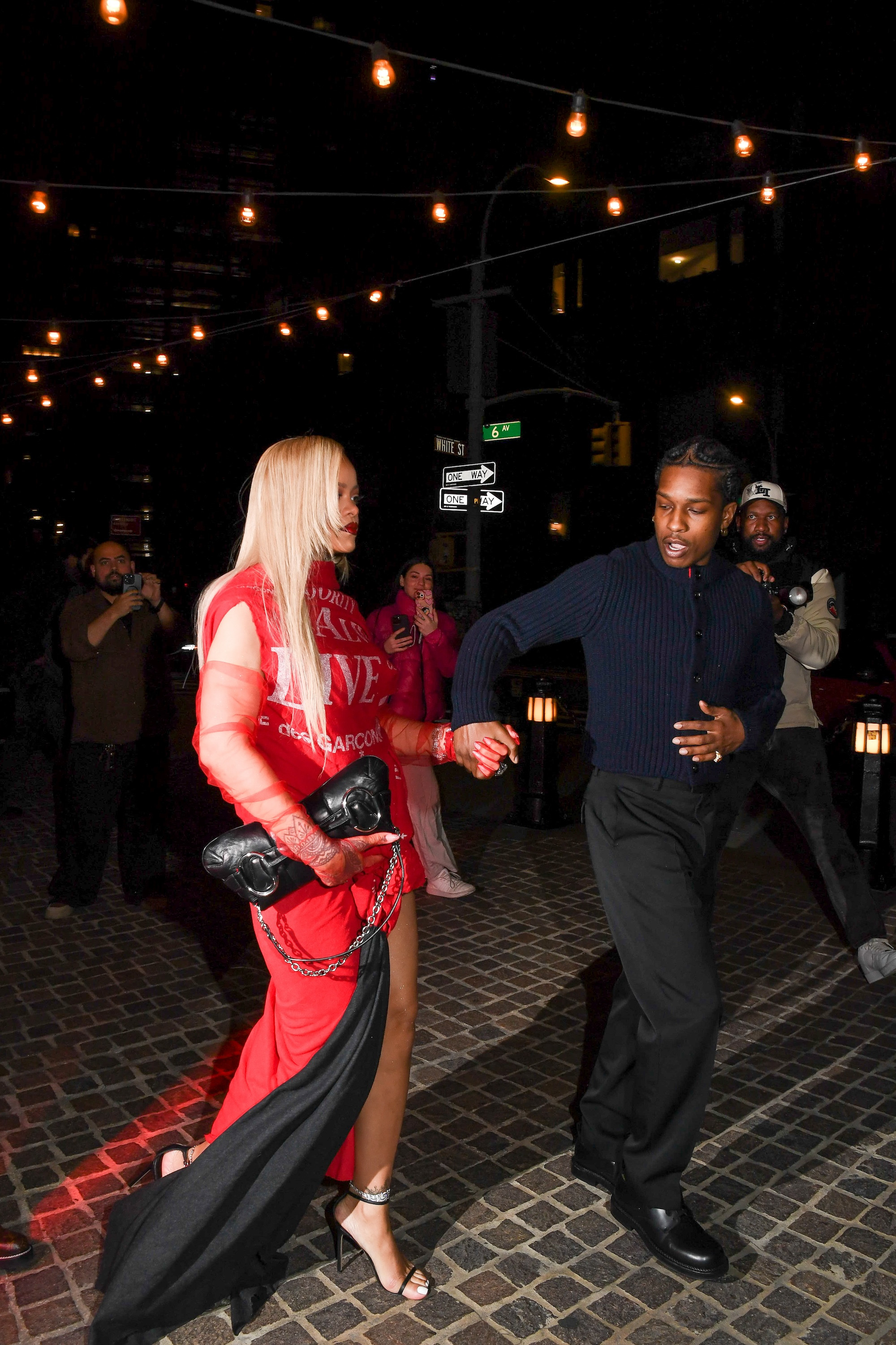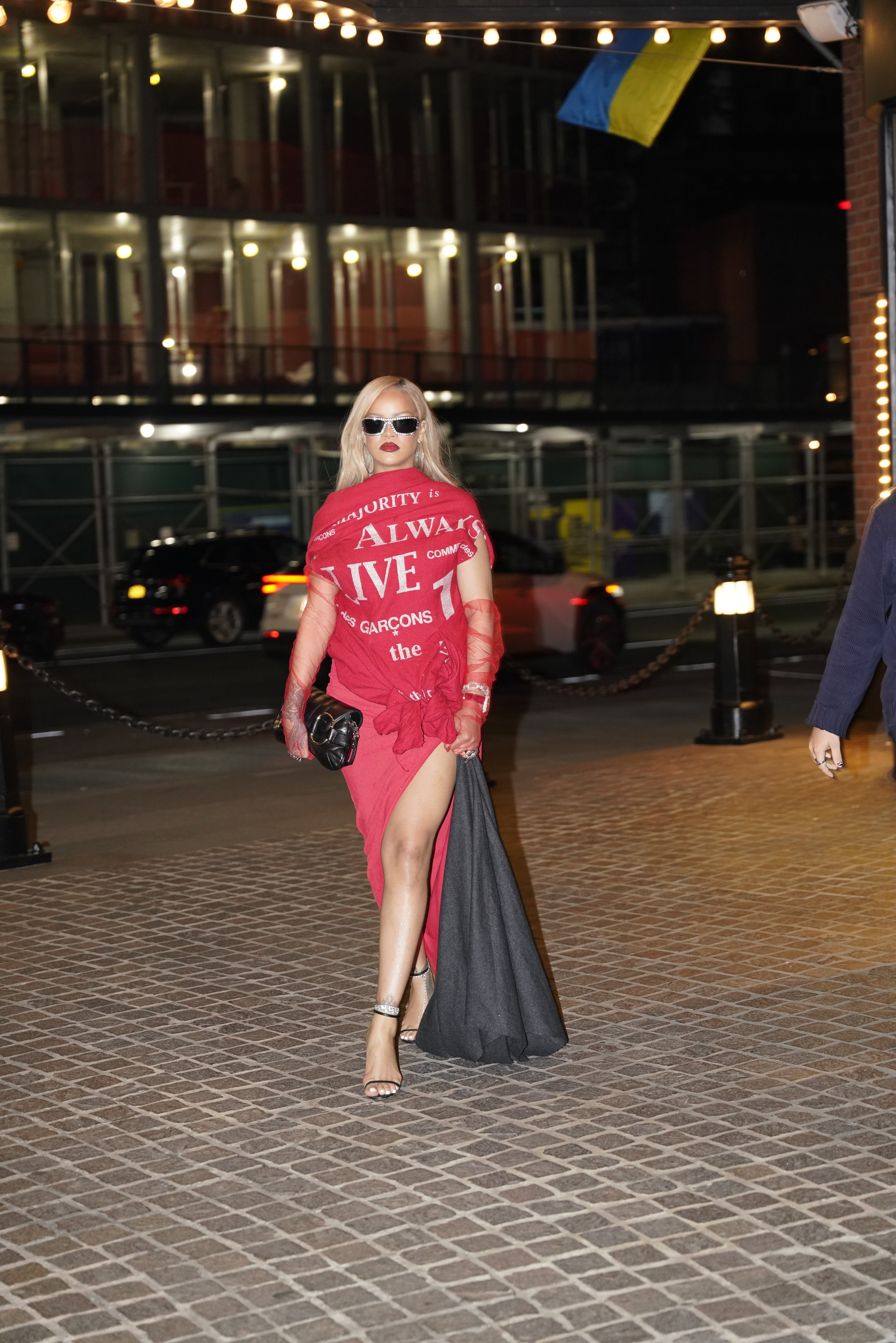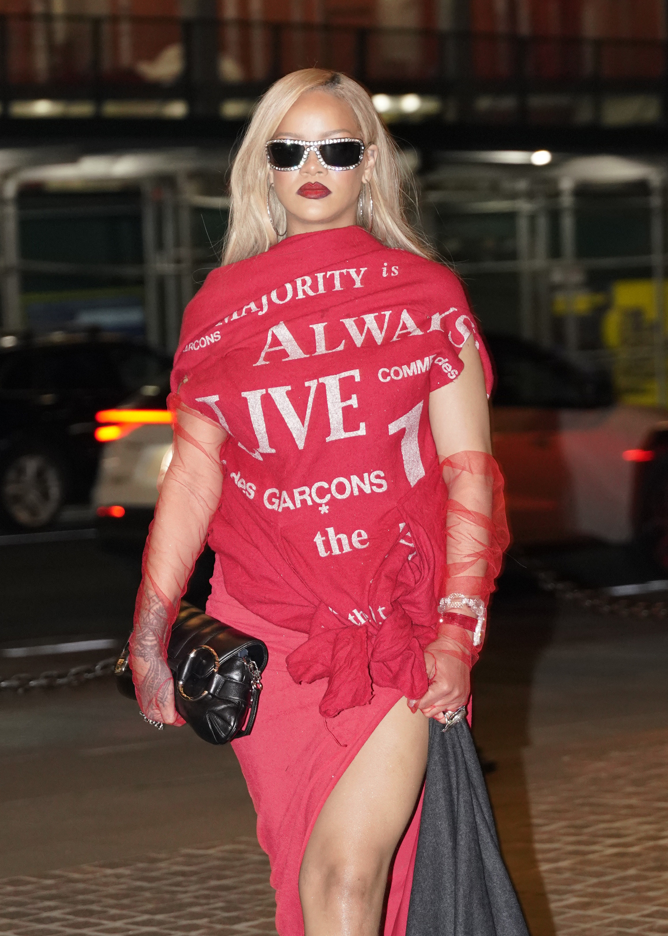 Rihanna și-a accesorizat ținuta cu o pereche de mănuși roșii transparente, o pereche de sandale negre cu toc înalt, o poșetă neagră și bijuterii prețioase. Inelul de argint pe degetul inelar stâng, purtat peste mănuși, a atras atenția paparazzilor.