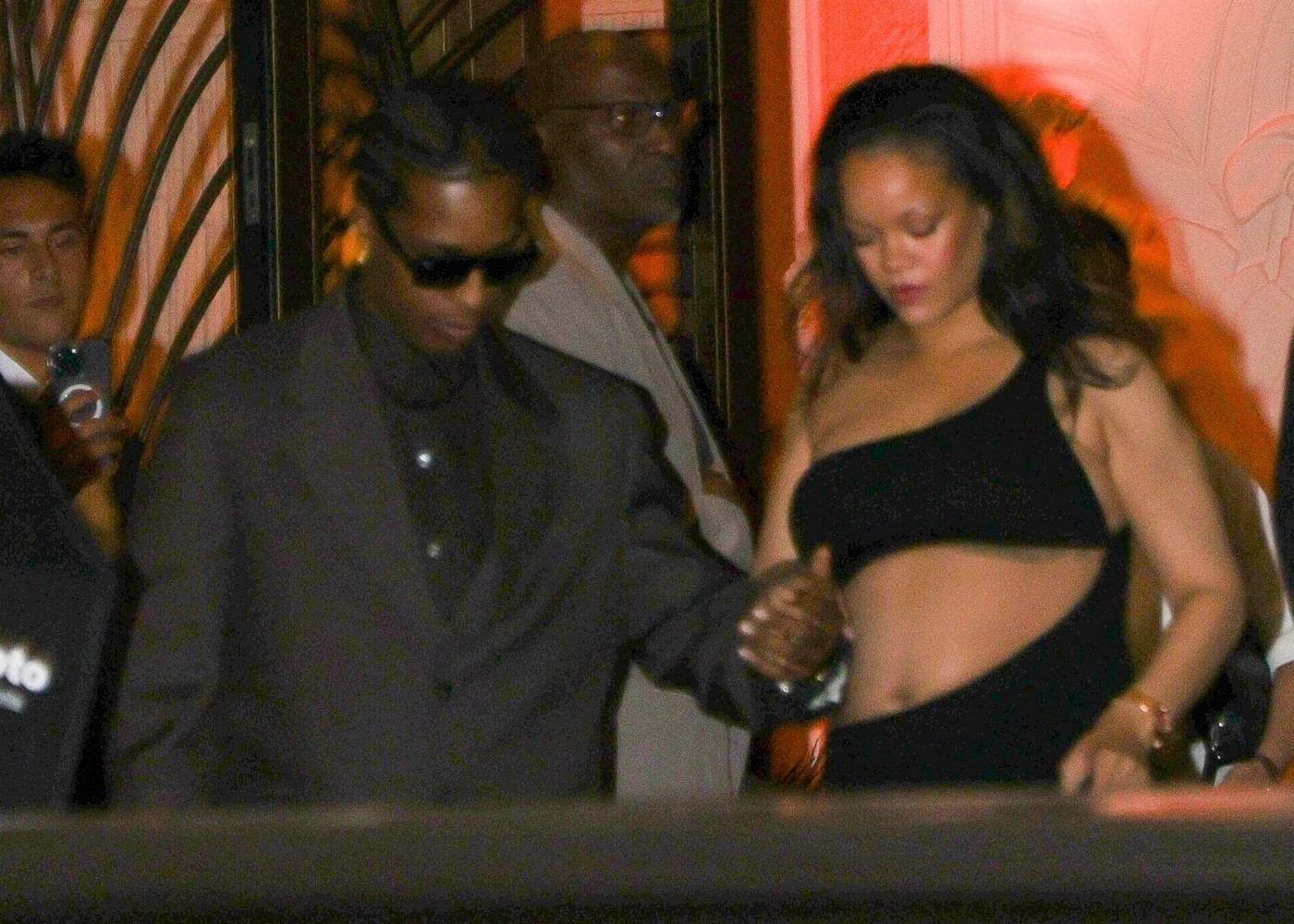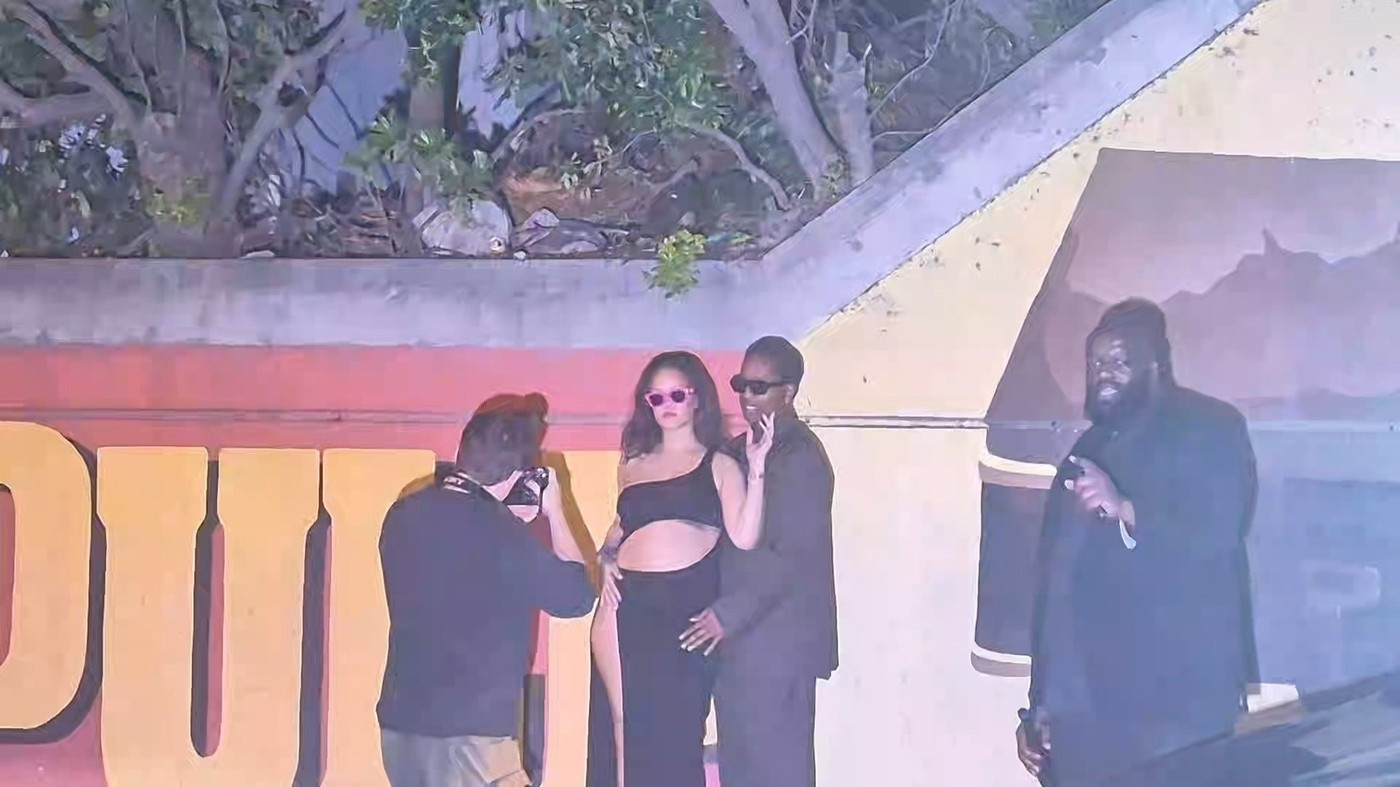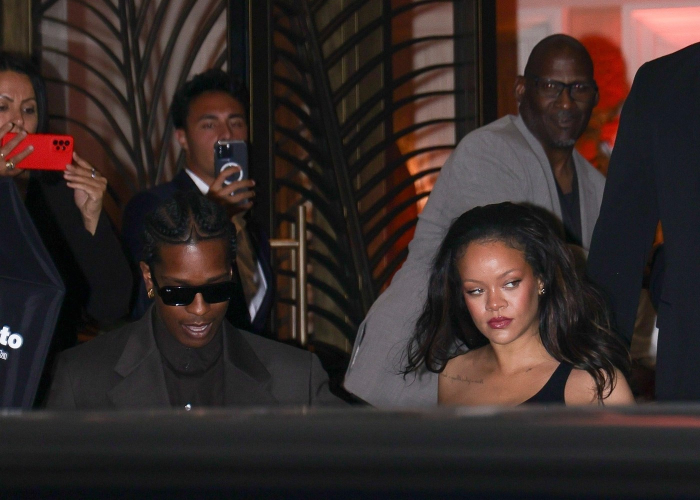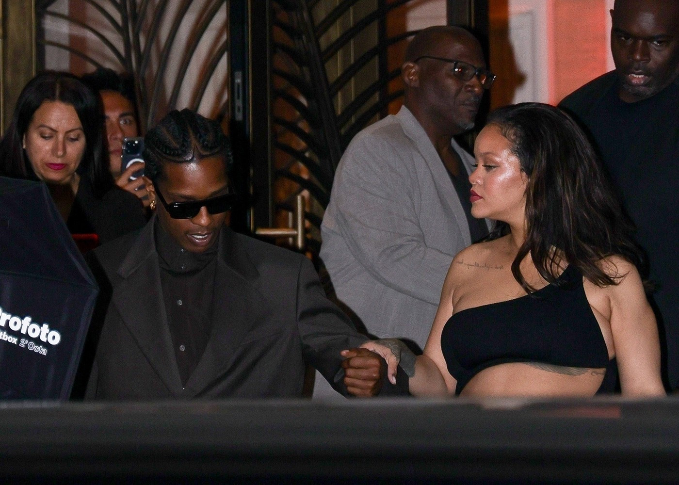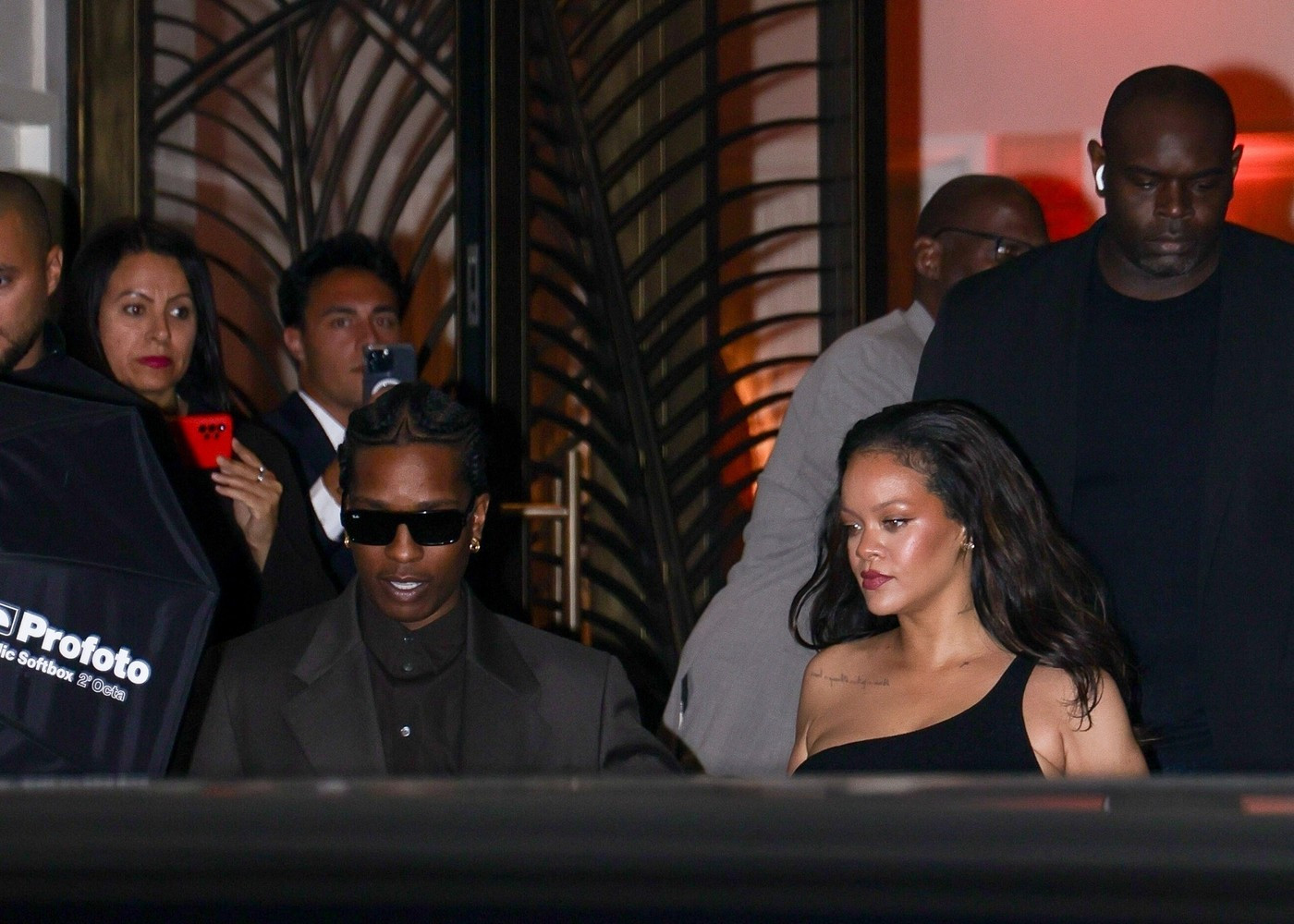 Ținuta a fost accesorizată cu un clutch negru, pantofi cu toc negri, bijuterii aurii. Părul l-a lăsat desfăcut, ondulat lejer. Rocky a purtat un trenci maro, pantofi negri și ochelari de soare, potrivit Aol.