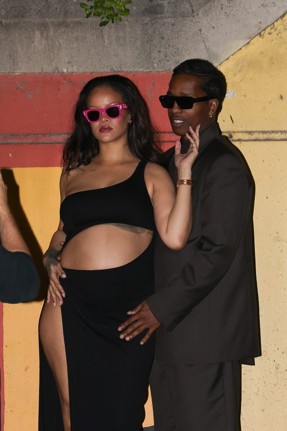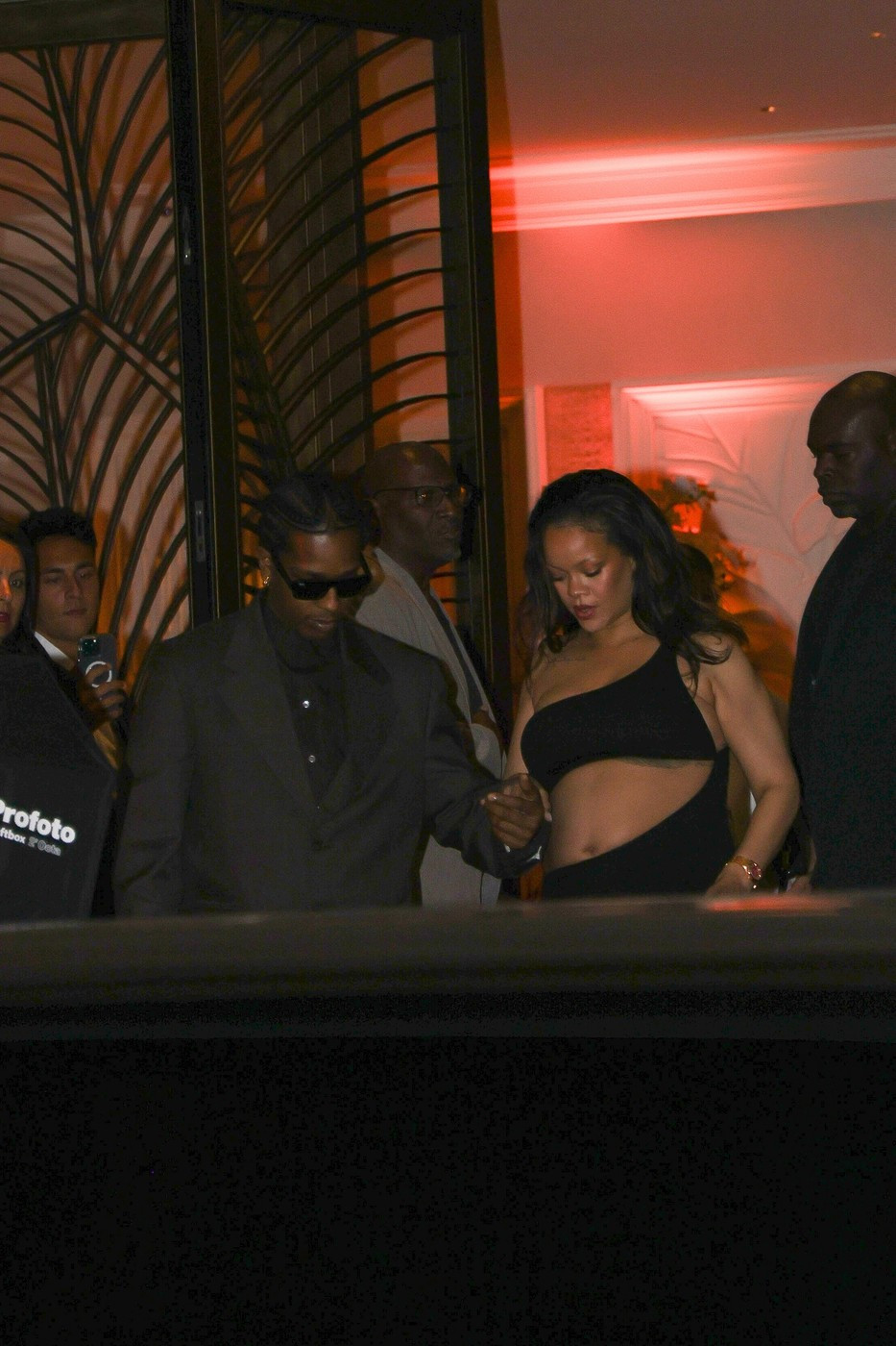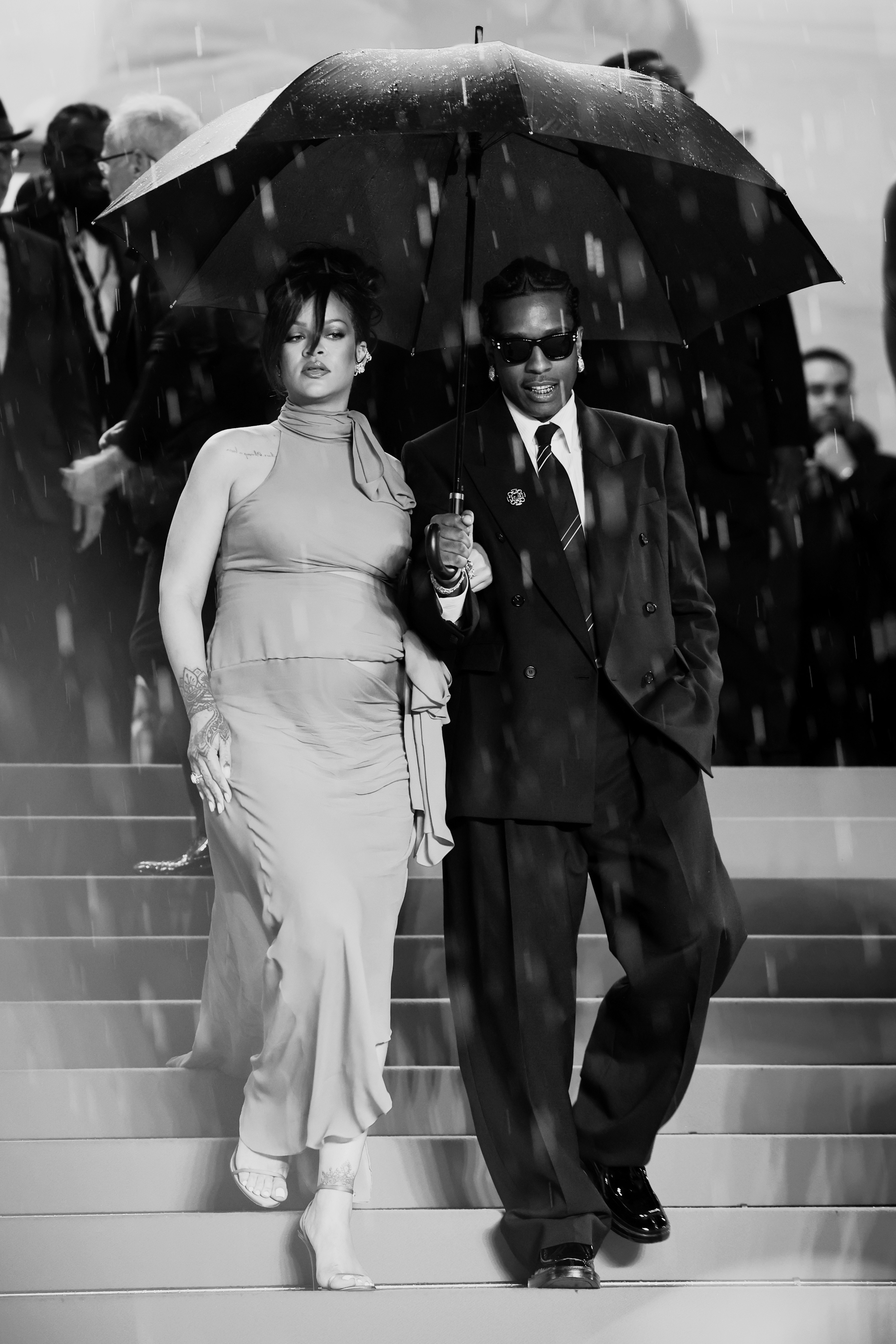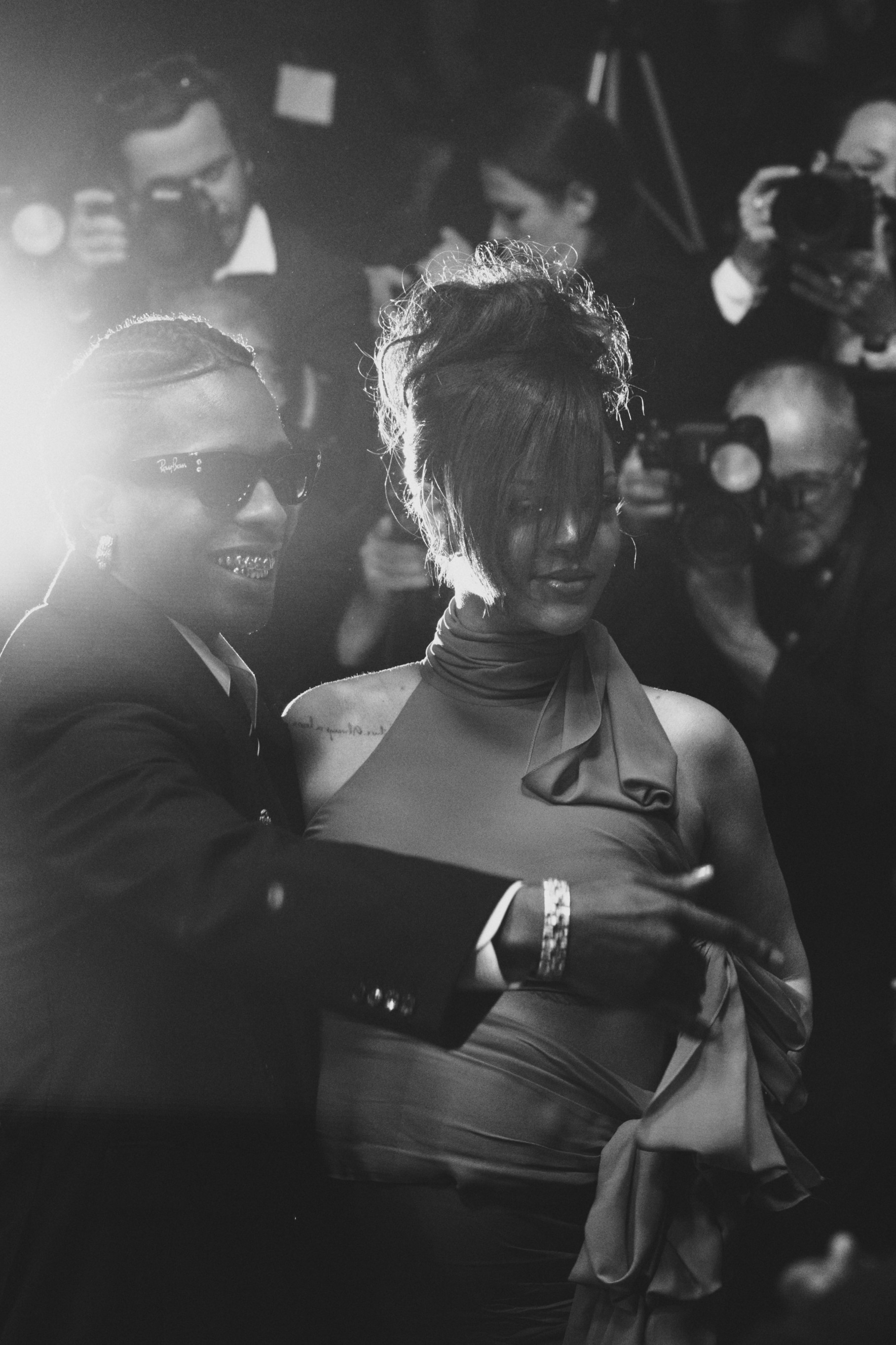 Ținuta a fost accesorizată cu un clutch negru, pantofi cu toc negri, bijuterii aurii. Părul l-a lăsat desfăcut, ondulat lejer. Rocky a purtat un trenci maro, pantofi negri și ochelari de soare, potrivit Aol.