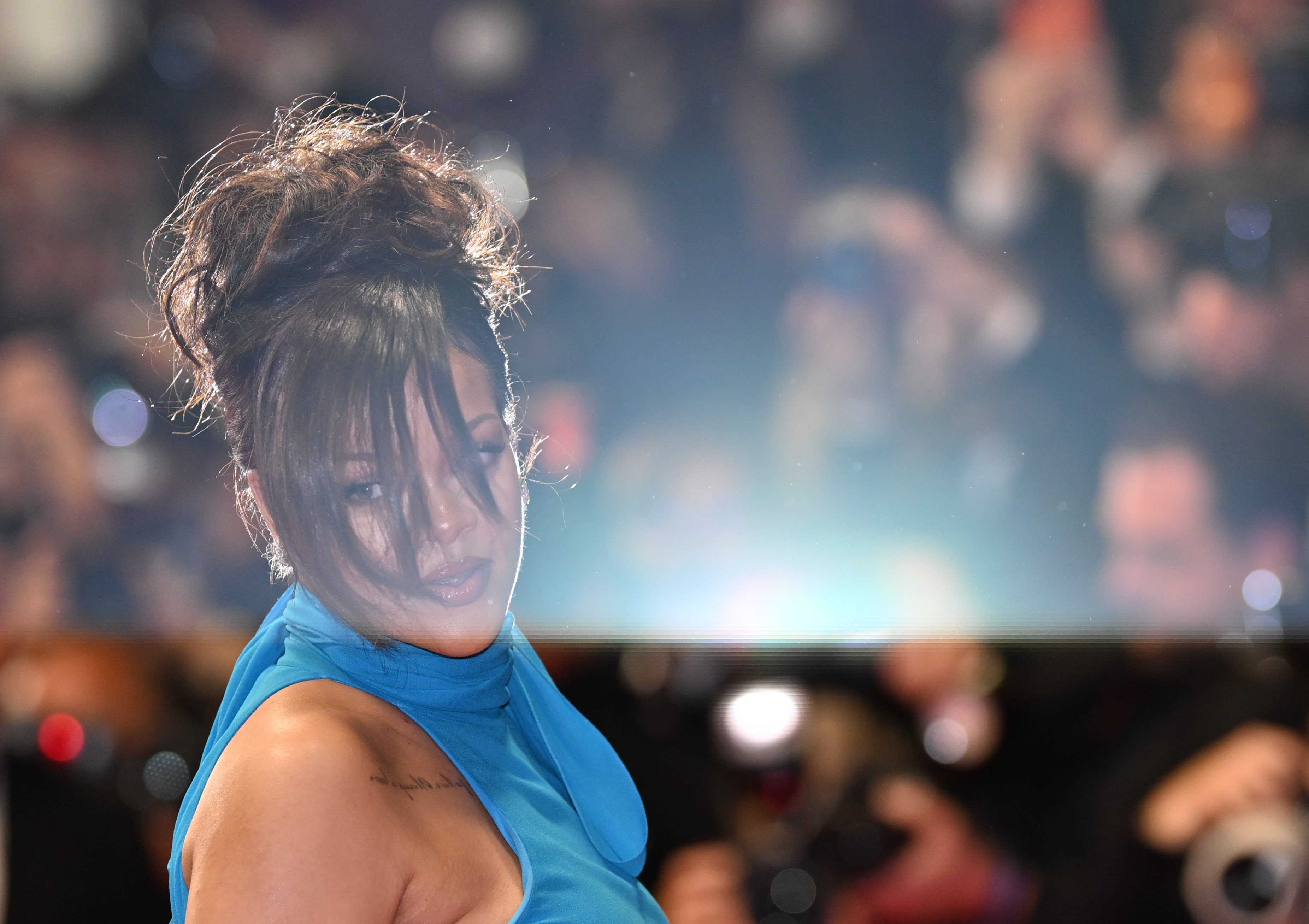 Și-a prins părul într-un coc, și a accesorizat ținuta cu pantofi stiletto albaștri.