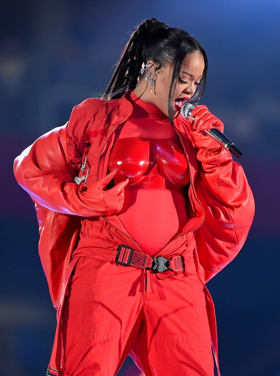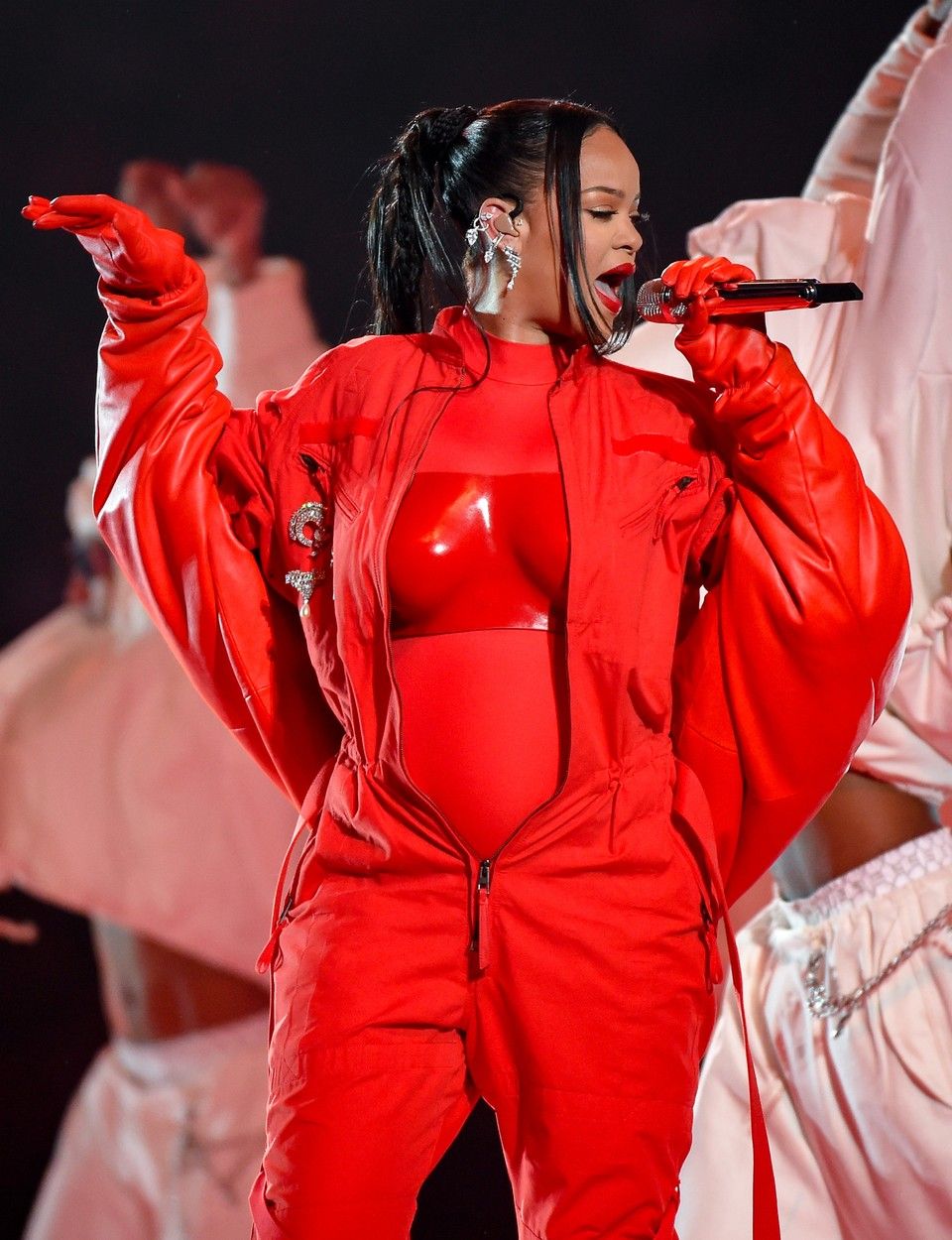 Îmbrăcată din cap până în picioare în roșu aprins, în timpul concertului Rihanna și-a arătat burtica de gravidă. Vestea a fost confirmată pentru People de un reprezententat al artistei.