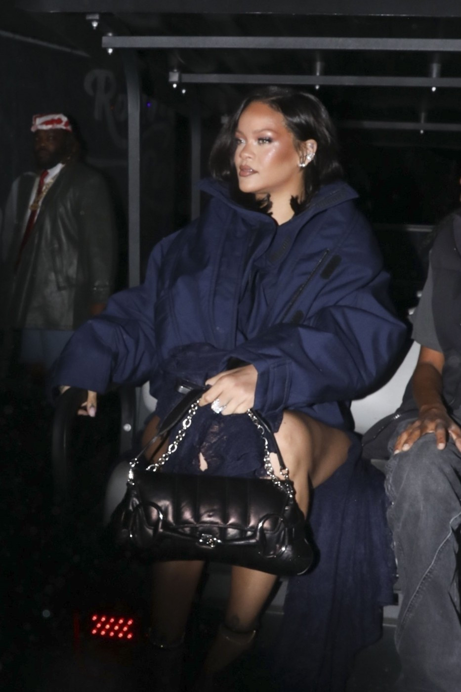Rihanna, în vârstă de 37 de ani, a accesorizat ținuta cu un colier din diamante și tocuri negre cu bretele. Părul ei a fost coafat într-un bob lung, iar pentru acest outing de noapte a optat pentru un ruj într-o nuanță maro-nude.