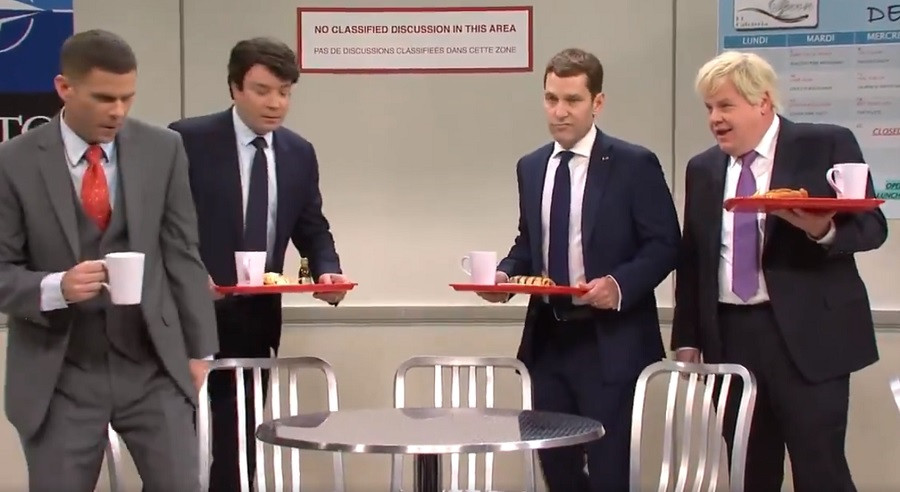 Prezentat sub titlul "Bad Boys" in NATO Cafeteria", materialul începe când cei trei lideri mondiali, interpretați de Jimmy Fallon (premierul Canadei), Paul Rudd (președintele Franței) și James Corden (premierul britanic) își fac intrarea în cantina summit-ului.