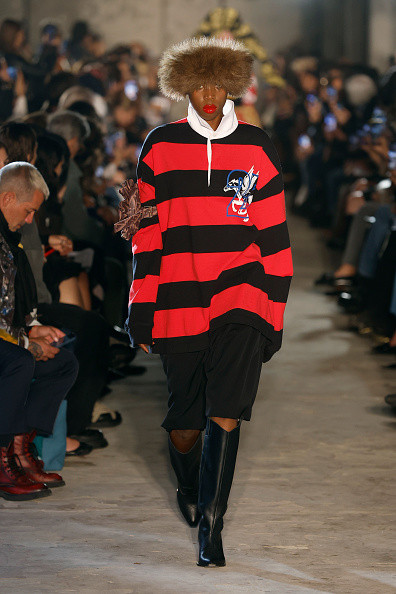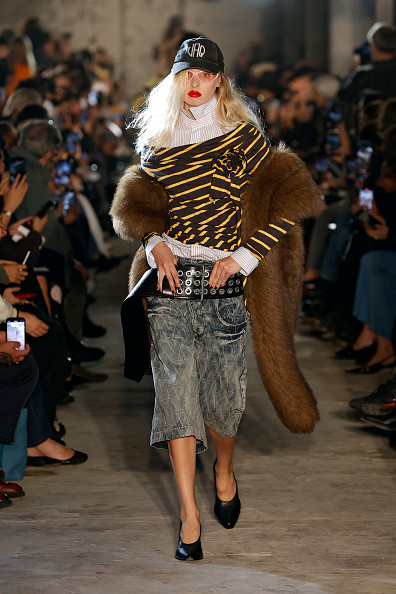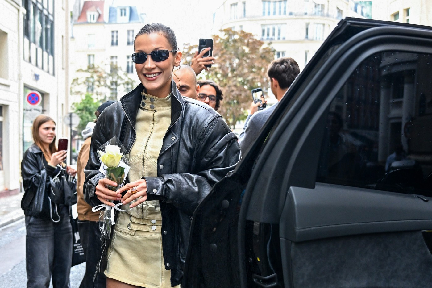Bella Hadid, în schimb, a purtat un compleu din denim crem: o jachetă cu fermoar și o fustă mini asortată. Și-a completat look-ul îndrăzneț cu o altă jachetă din piele neagră supradimensionată, dresuri negre, transparente, o geantă mare, neagră, o pereche de cizme înalte, asortate, și ochelari de soare.