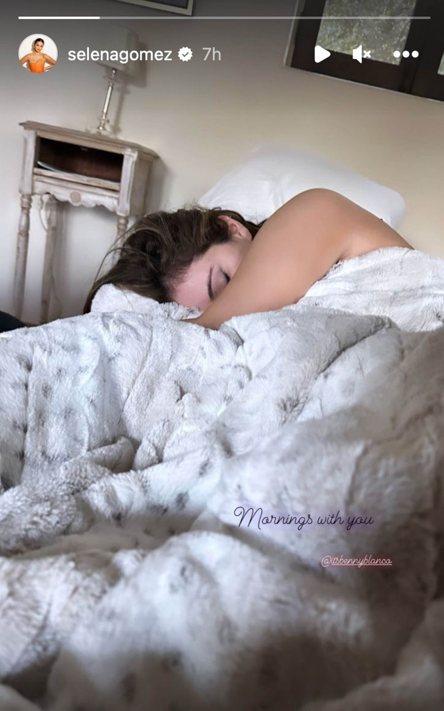 Selena Gomez a postat pe Instagram Story o poza în care apare alături de iubitul ei, Benny Blanco, având un moment foarte afectuos într-o cameră cu perne roșii.