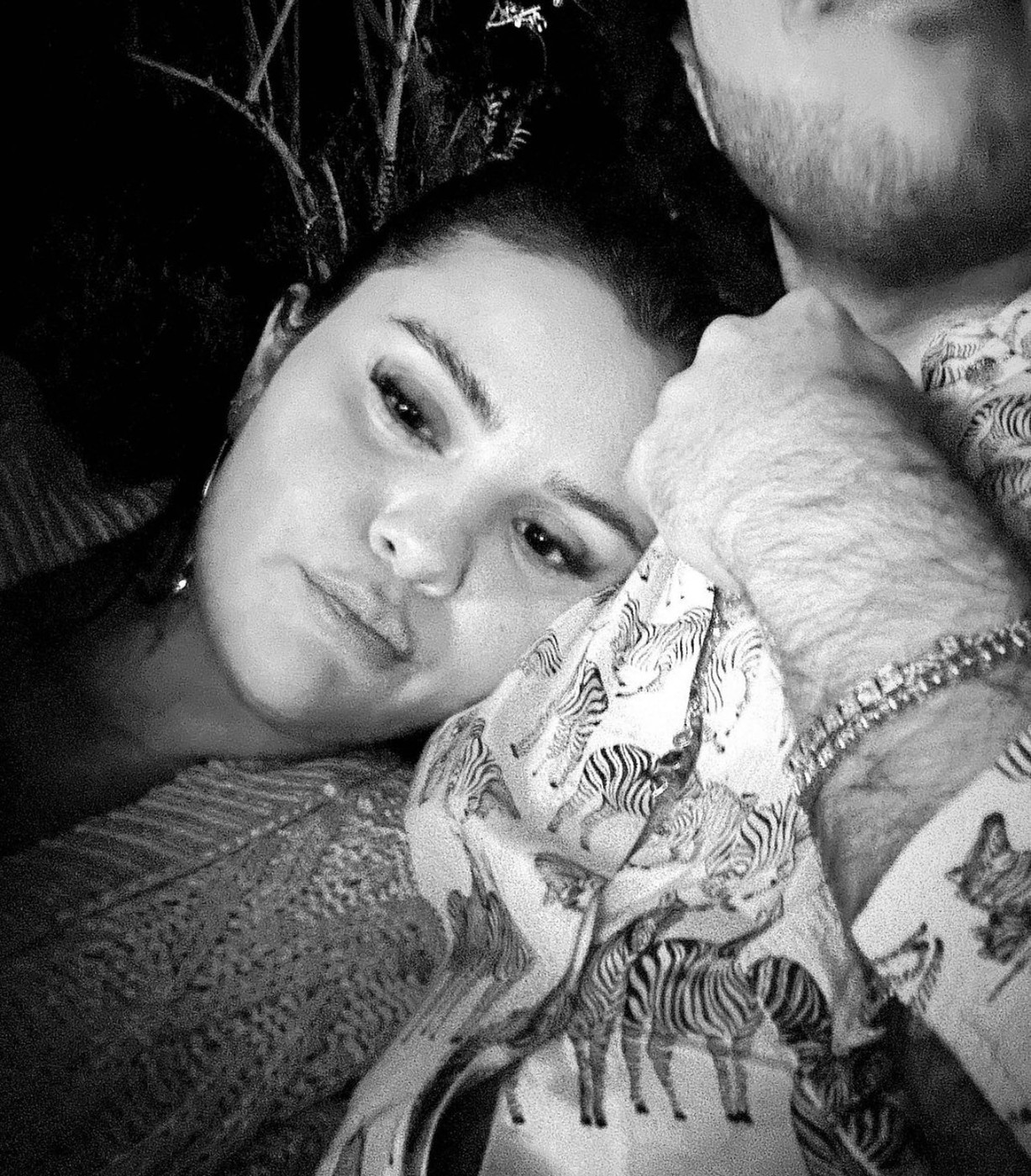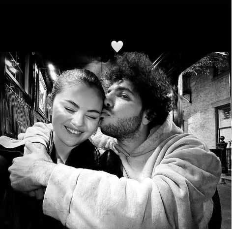În fotografia alb-negru, Benny Blanco o sărută pe tâmplă pe Selena în timp ce o îmbrățișează.