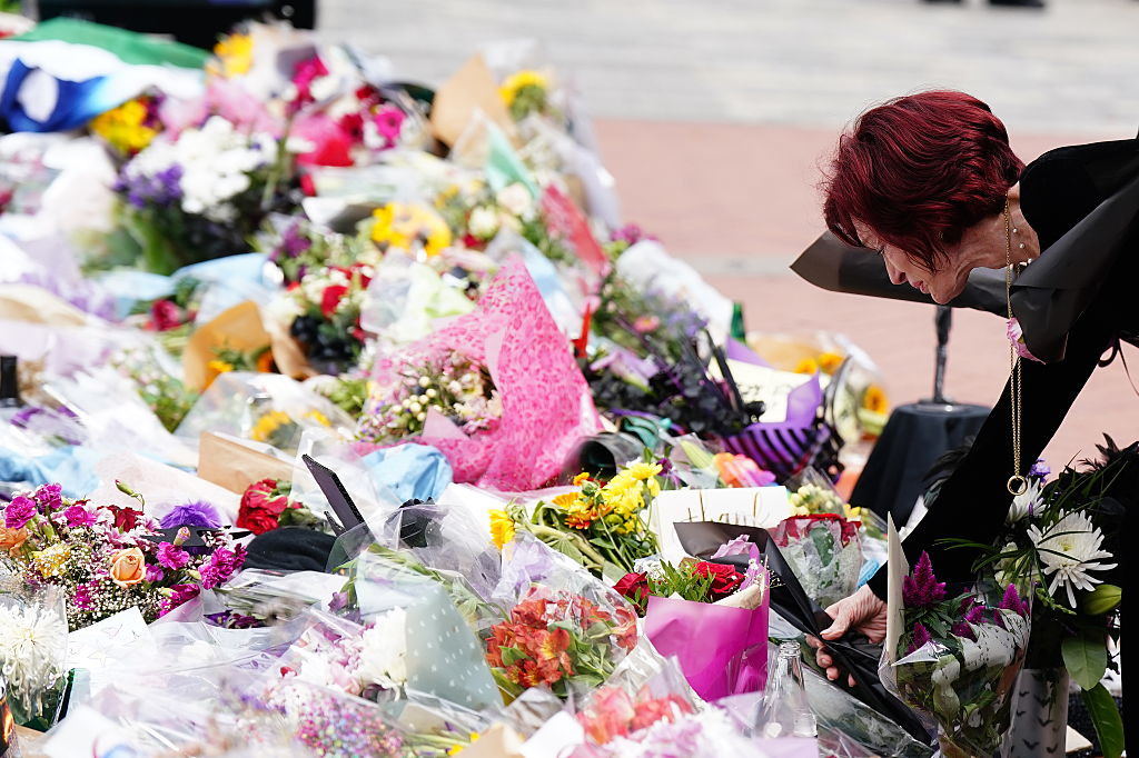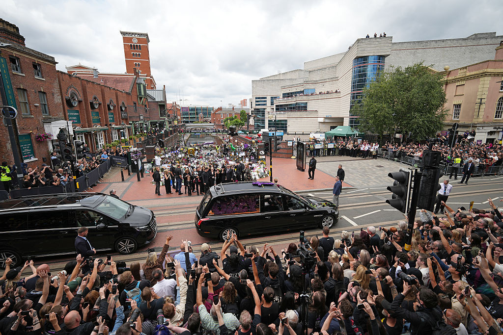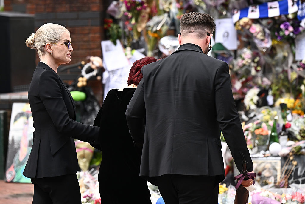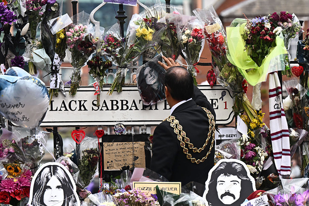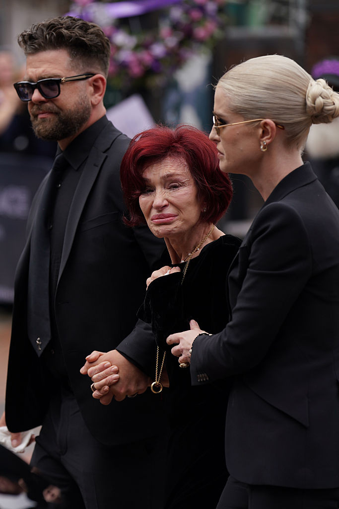 Văduva lui Ozzy Osbourne, Sharon, a izbucnit în lacrimi când ea și familia lui s-au oprit să citească mesajele de condoleanțe scrise pe florile aduse legendei trupei Black Sabbath în timpul procesiunii funerare prin Birmingham.