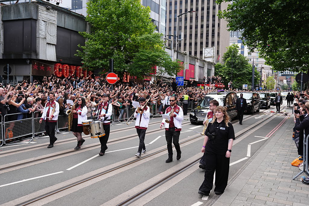 Numeroşi fani, îmbrăcaţi în ţinute negre, tricouri şi bluze cu chipul ''Prinţului Întunericului", s-au reunit înainte de începerea procesiunii, programată la ora 13:00 (12:00 GMT), pentru a-i aduce un ultim omagiu părintelui heavy metal-ului în oraşul natal, a constatat un fotograf AFP.