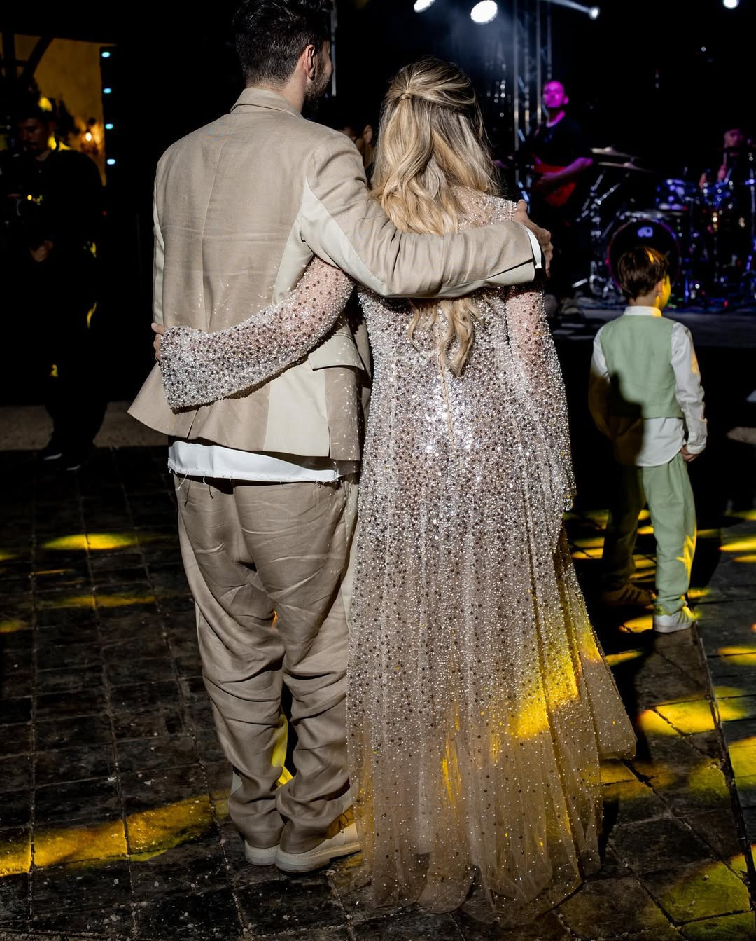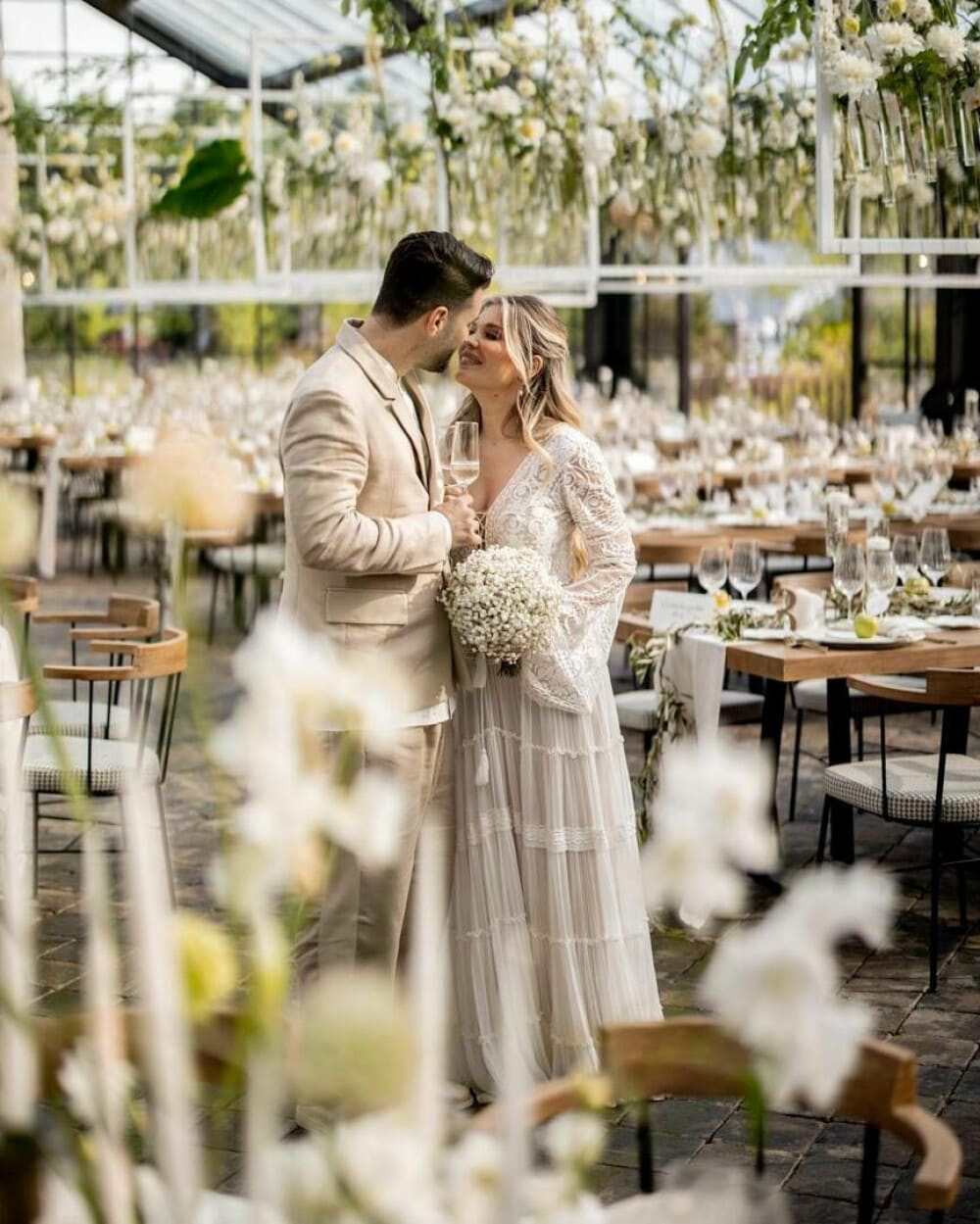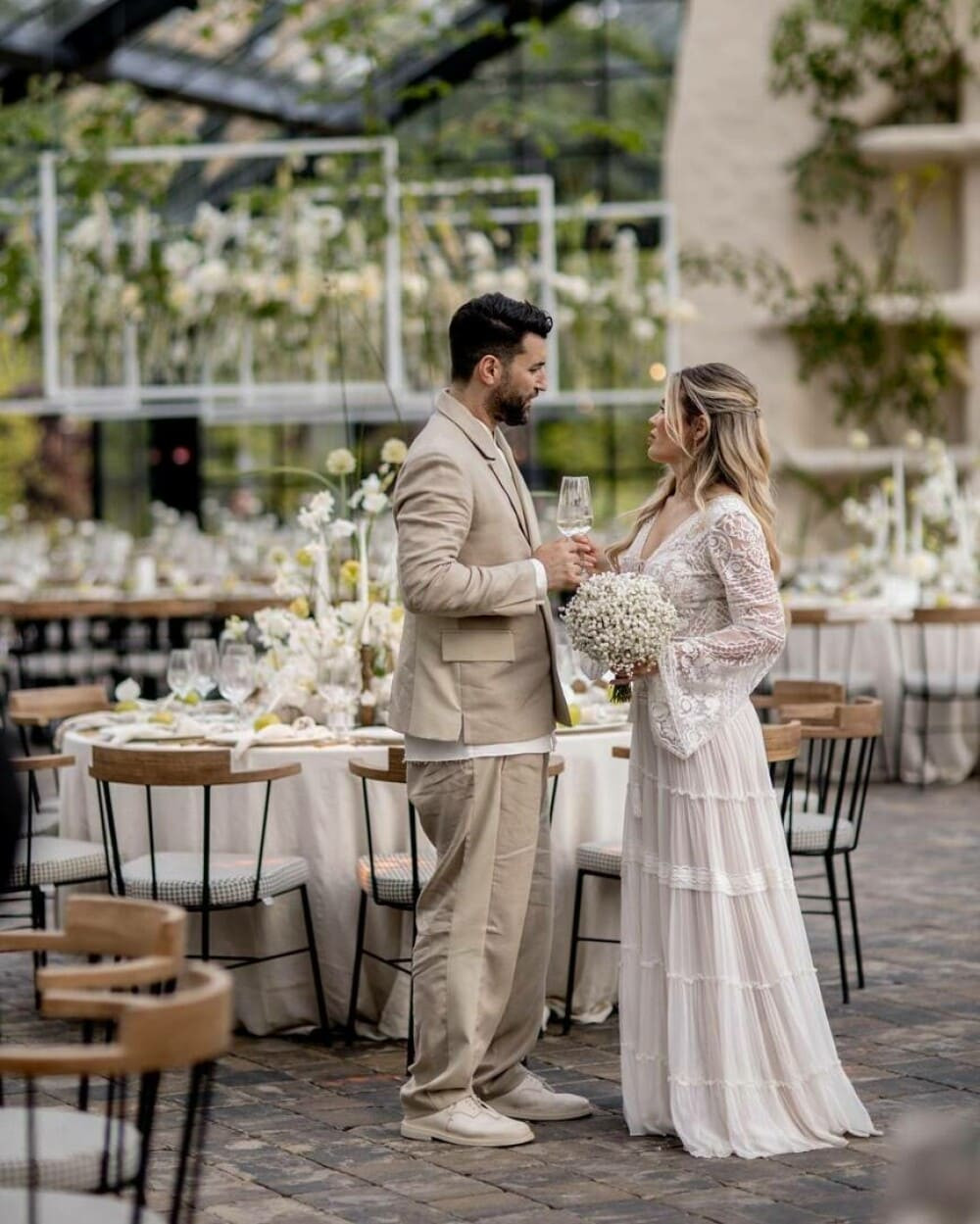 Gina și Smiley au adoptat ținute lejere la cununia civilă. Ea a purtat o rochie lungă, albă, vaporoasă, în timp ce artistul a fost îmbrăcat într-un costum de culoare bej și o cămașă albă.