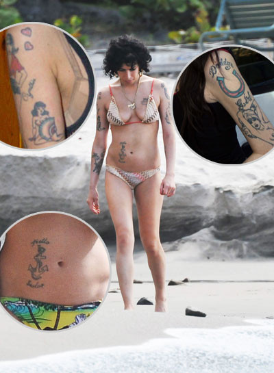 O ancora, fetite vesele, culori indraznete, o pana si o pasare sunt toate adunate pe trupul lui Amy Winehouse.