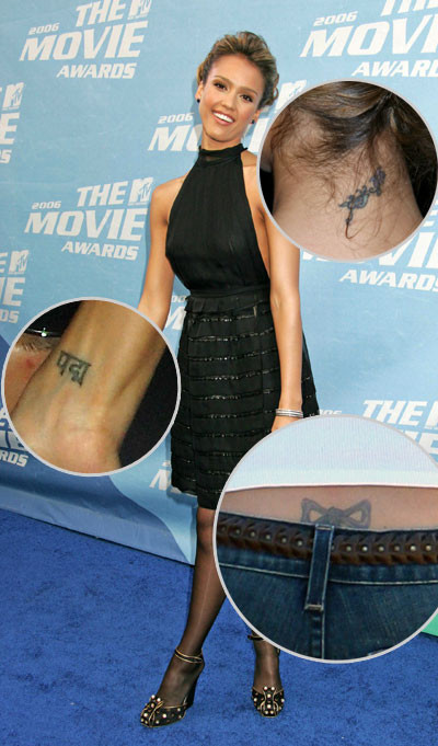 Pana si stilata Victoria Beckham nu a rezistat tentatiei. Are un citat in ebraica pe spate, data cand si-a reinnoit juramintele de la nunta si initialele sotului la incheieturi. Delicate sunt si tatuajele actritei Jessica Alba.