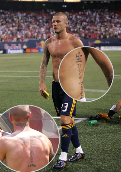 Nu l-am uitat pe David Beckham, care probabil ca a pierdut deja sirul tatuajelor sale. Are numele copiilor, ingeri, demoni si tot felul de inscriptii adanc cioplite peste tot pe corp.