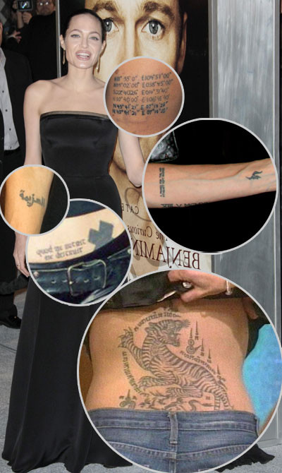 Echivalentul feminin al lui David e Angelina Jolie, plina de tatuaje din cap pana in picioare.