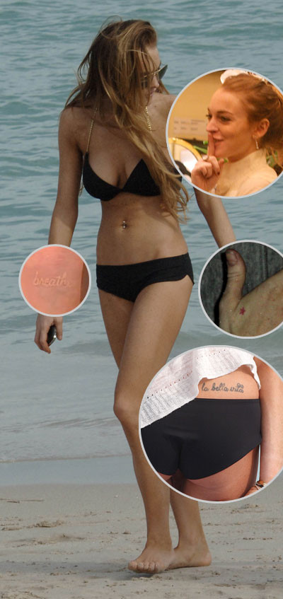 Lindsay Lohan e la moda, cu un tatuaj cu cerneala alba. Pe incheietura ei scrie "Breath" ("Respira"), are si o steluta rosie pe mana, dar si cuvintele "La bella vita", undeva, deasupra posteriorului.
