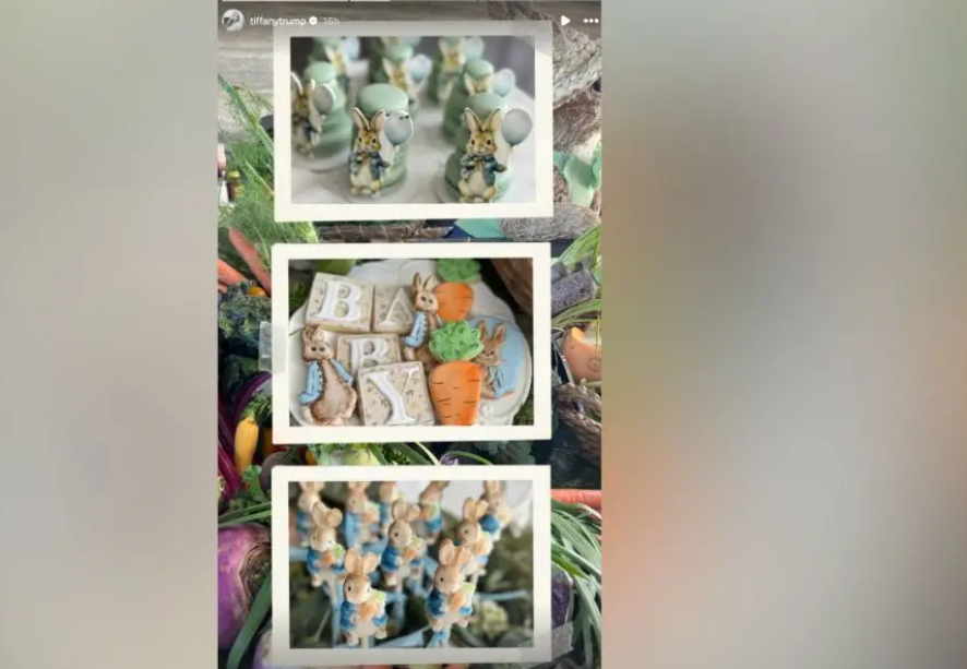 Tiffany a ales o tematică inspirată de Peter Rabbit, cu macarons verzi decorate cu iepurași minusculi care țineau baloane albastre, plus fursecuri în formă de morcovi și iepurași.