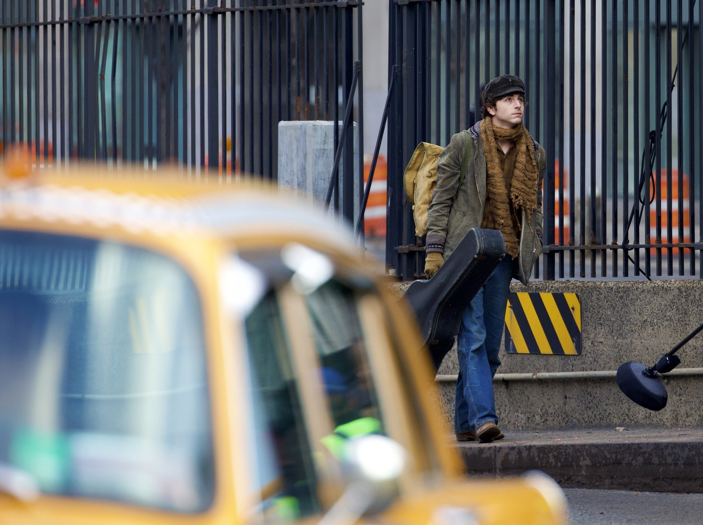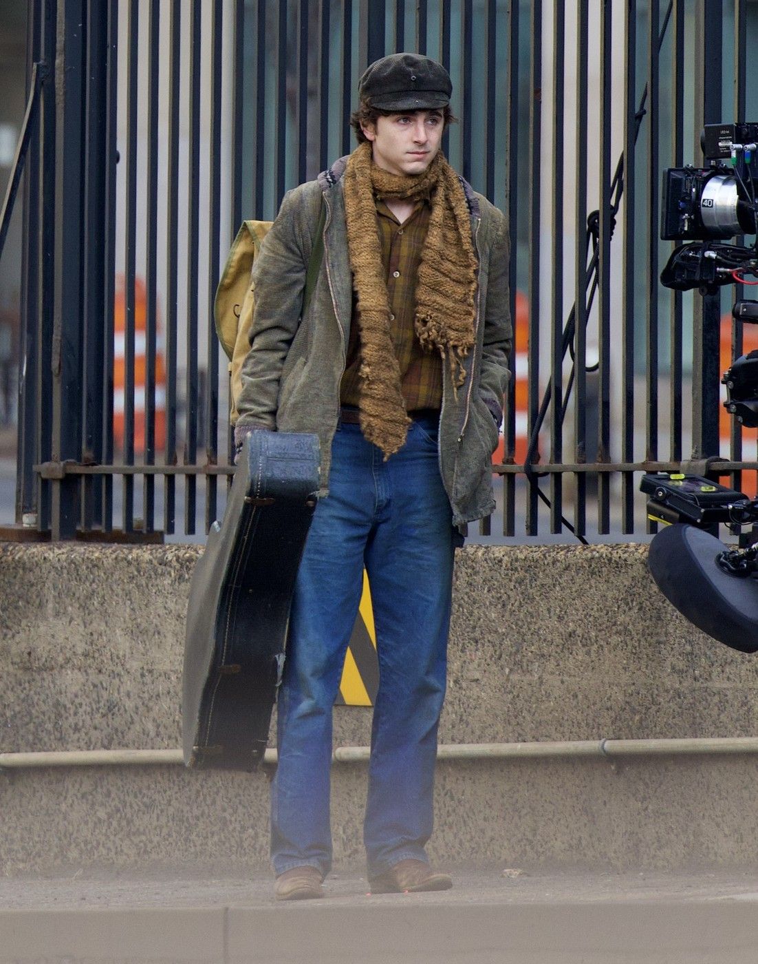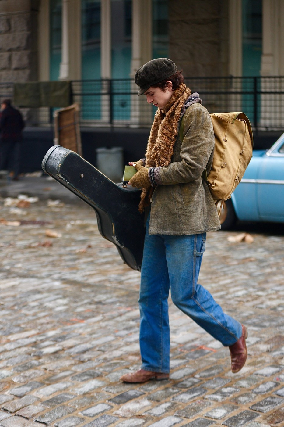 Lângă el, o mașină cu aspect retro trecea, pregătind scena filmului biografic, care se pare că se va concentra în jurul controversatei treceri a lui Dylan la chitara electrică în anii '60 și a drumului său spre a deveni o legendă a muzicii folk, potrivit Deadline.