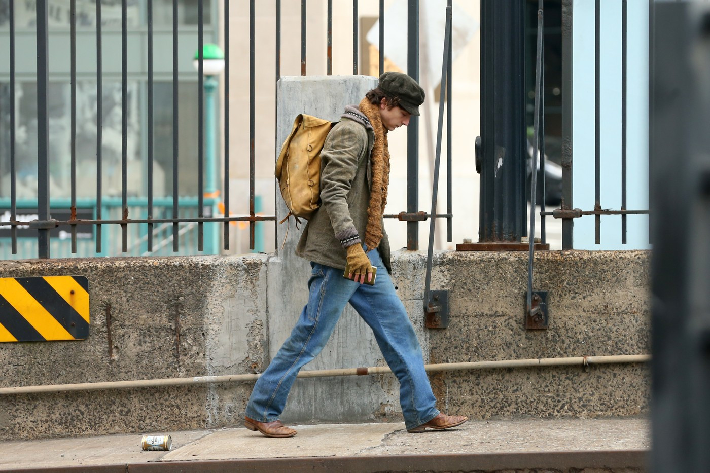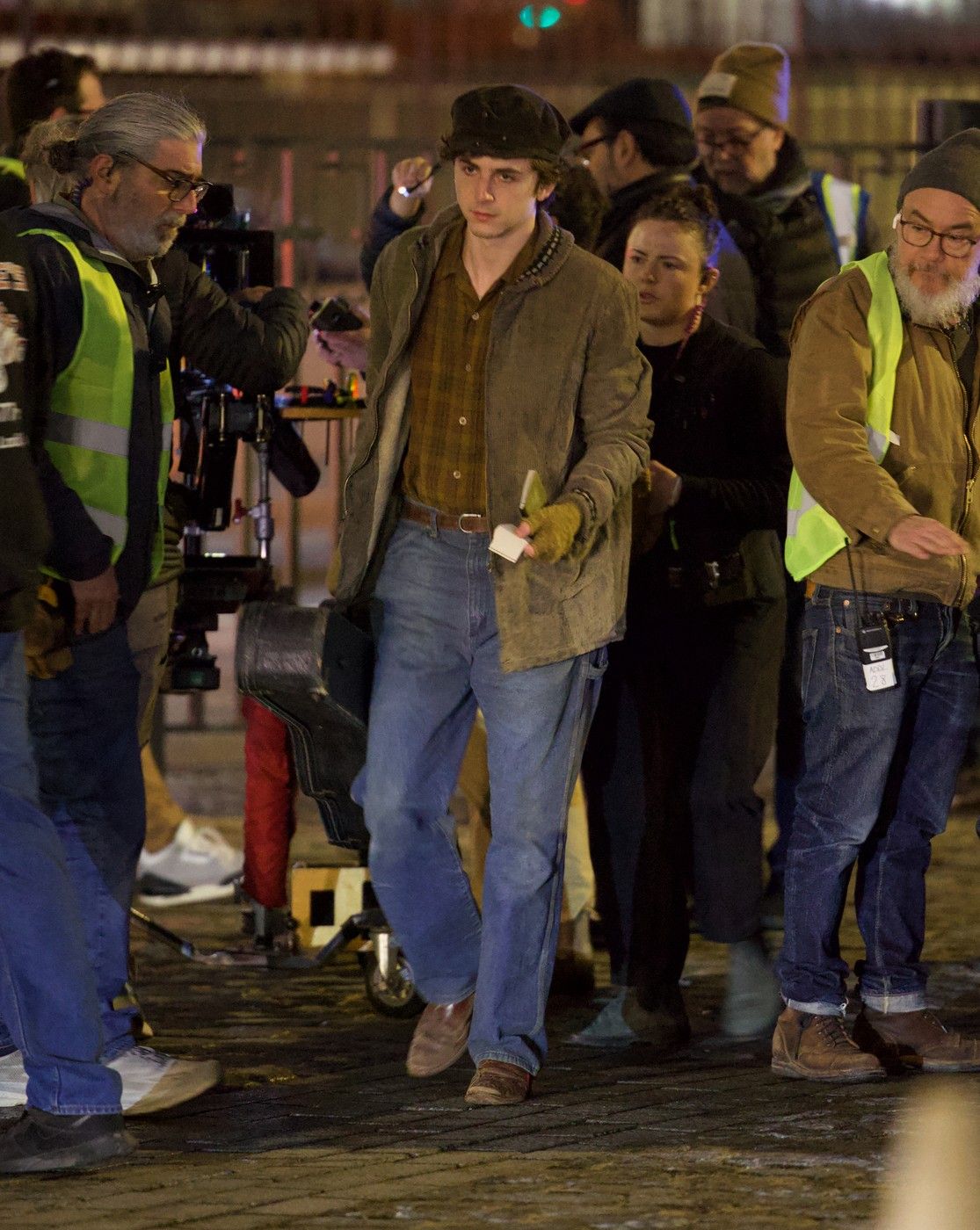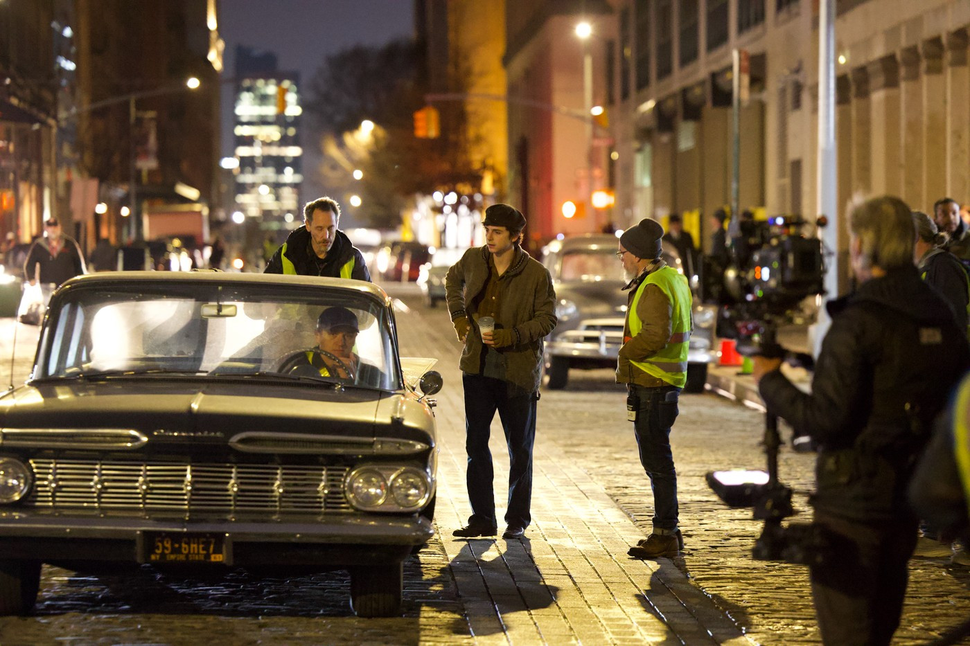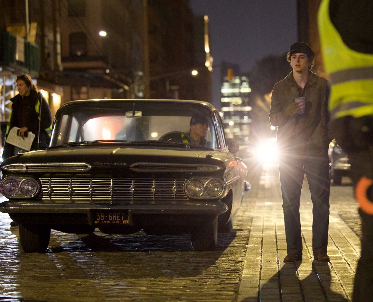 Lângă el, o mașină cu aspect retro trecea, pregătind scena filmului biografic, care se pare că se va concentra în jurul controversatei treceri a lui Dylan la chitara electrică în anii '60 și a drumului său spre a deveni o legendă a muzicii folk, potrivit Deadline.