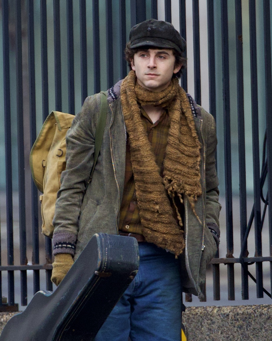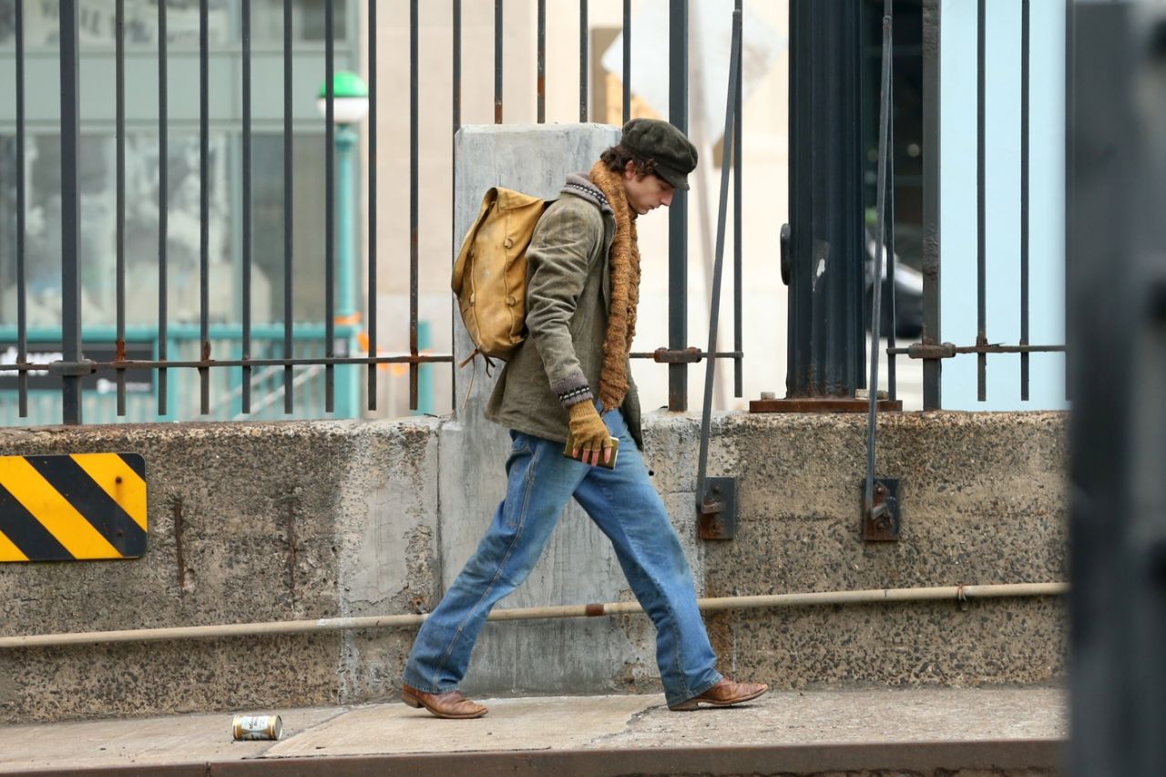 În fotografiile obținute de PEOPLE, Chalamet l-a imitat pe Dylan, în vârstă de 82 de ani, având o ținută clasică a anilor '60, în timp ce ținea în mână o carcasă de chitară uzată.