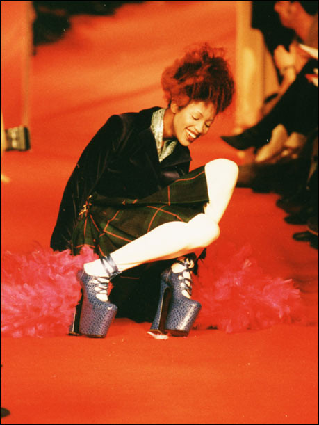 Probabil ca pe Amy Winehouse nu a deranjat-o prea tare ca a picat in genunchi, dar Naomi Campbell a tras cateva injuraturi la adresa pantofilor, dupa ce a cazut pe podium.