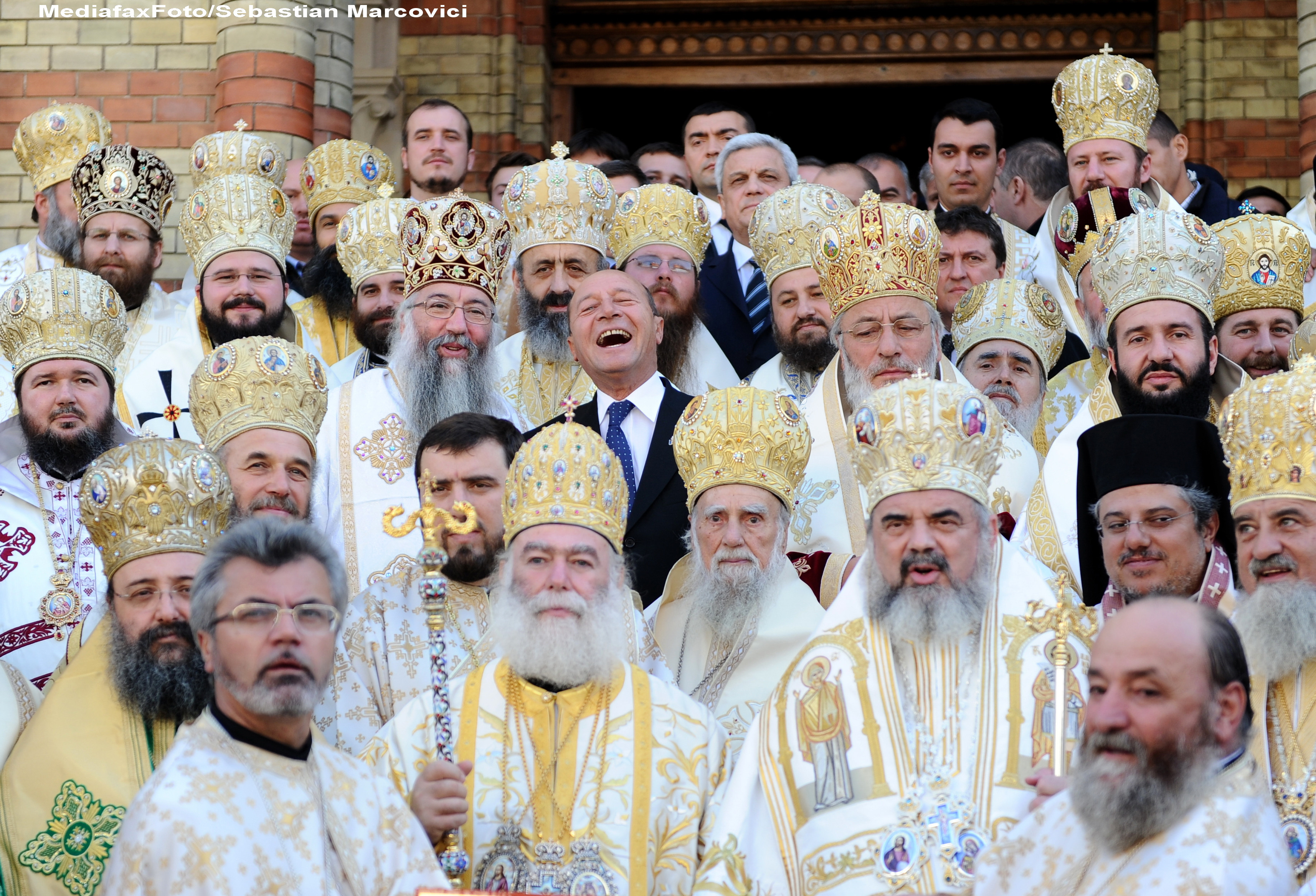 Nu in ultimul rand, in aceasta selectie se regaseste si imaginea care a primit in retelele de socializare numele de "fotografia anului in Romania", care-l surprinde pe presedintele Traian Basescu razand in mijlocul a peste 50 de preoti, imediat dupa slujba de canonizare a mitropolitului Andrei Saguna.
