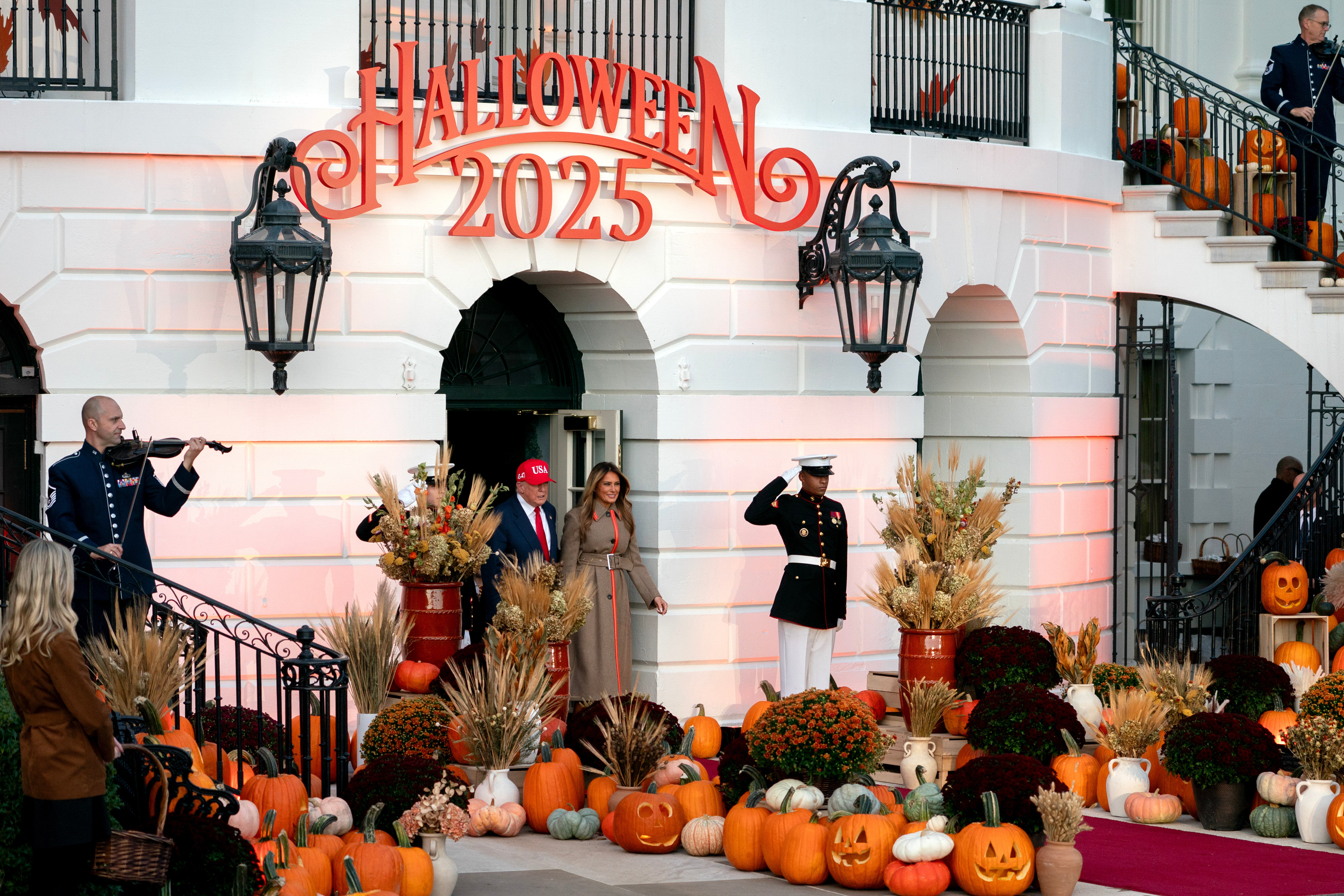El şi prima doamnă, Melania Trump, au apărut pe peluza sudică, pe fundalul unei versiuni orchestrale a piesei „Thriller” de Michael Jackson.