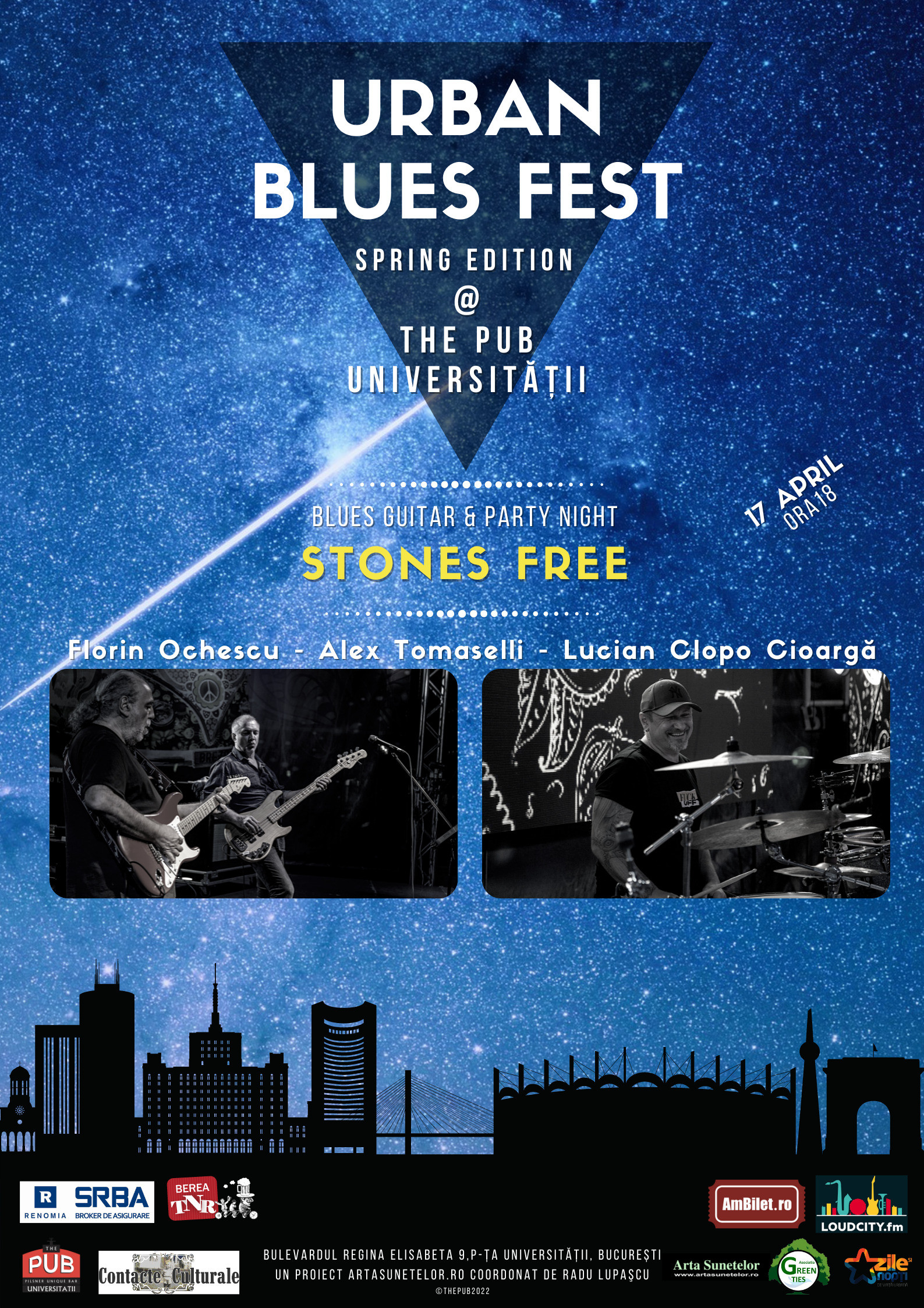 Singura chitaristă de blues din România, Roxana Stroe şi Foxy Lady Band, ne vor ambienta spaţiul sonor cu incursiuni rafinate din arealul jazzy blues-rock, pentru ca Stones Free - adică Florin Ochescu, Alex Tomaselli şi Sorin Cioargă - să ne încărce energetic cu excelenţa artistică a power blues-rockului.