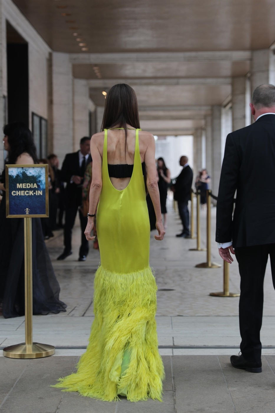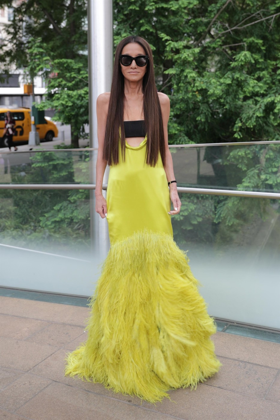 Vera a purtat ochelari de soare negri, supradimensionați, la rochia decupată în partea de sus și pene voluminoase pe lungime.