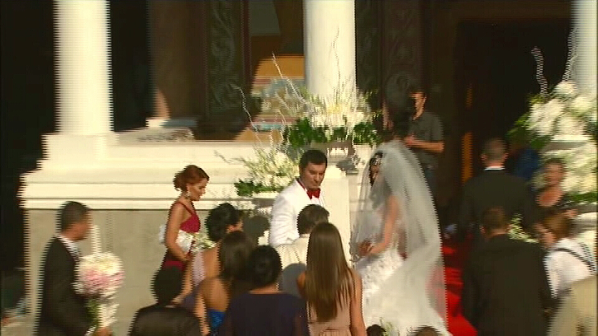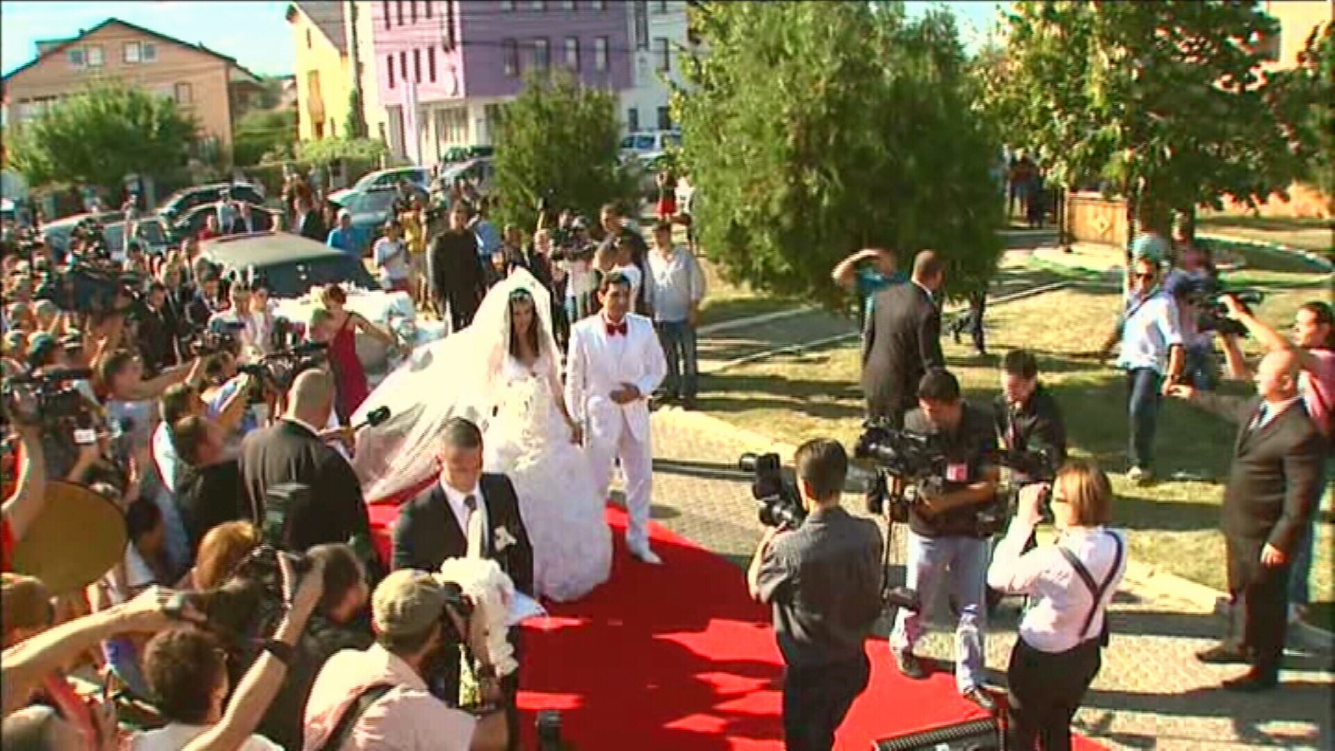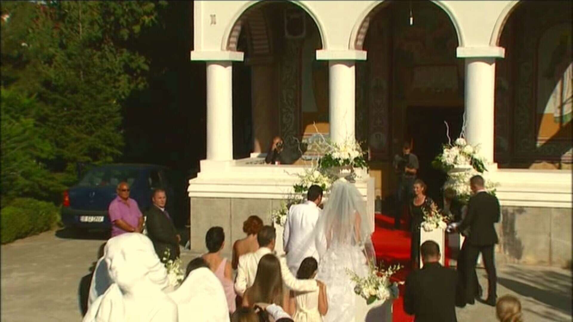 Cum au coborat din limuzina alba, primita cadou de nunta de la nasul Becali, prospetii insuratei au fost inconjurati de bodyguarzi.